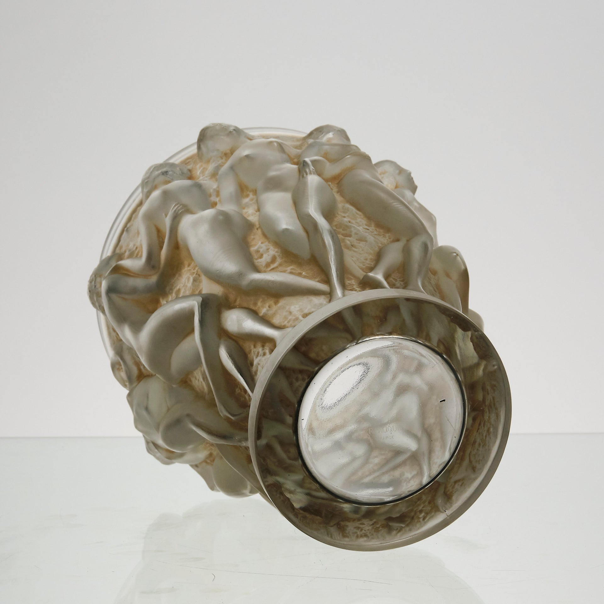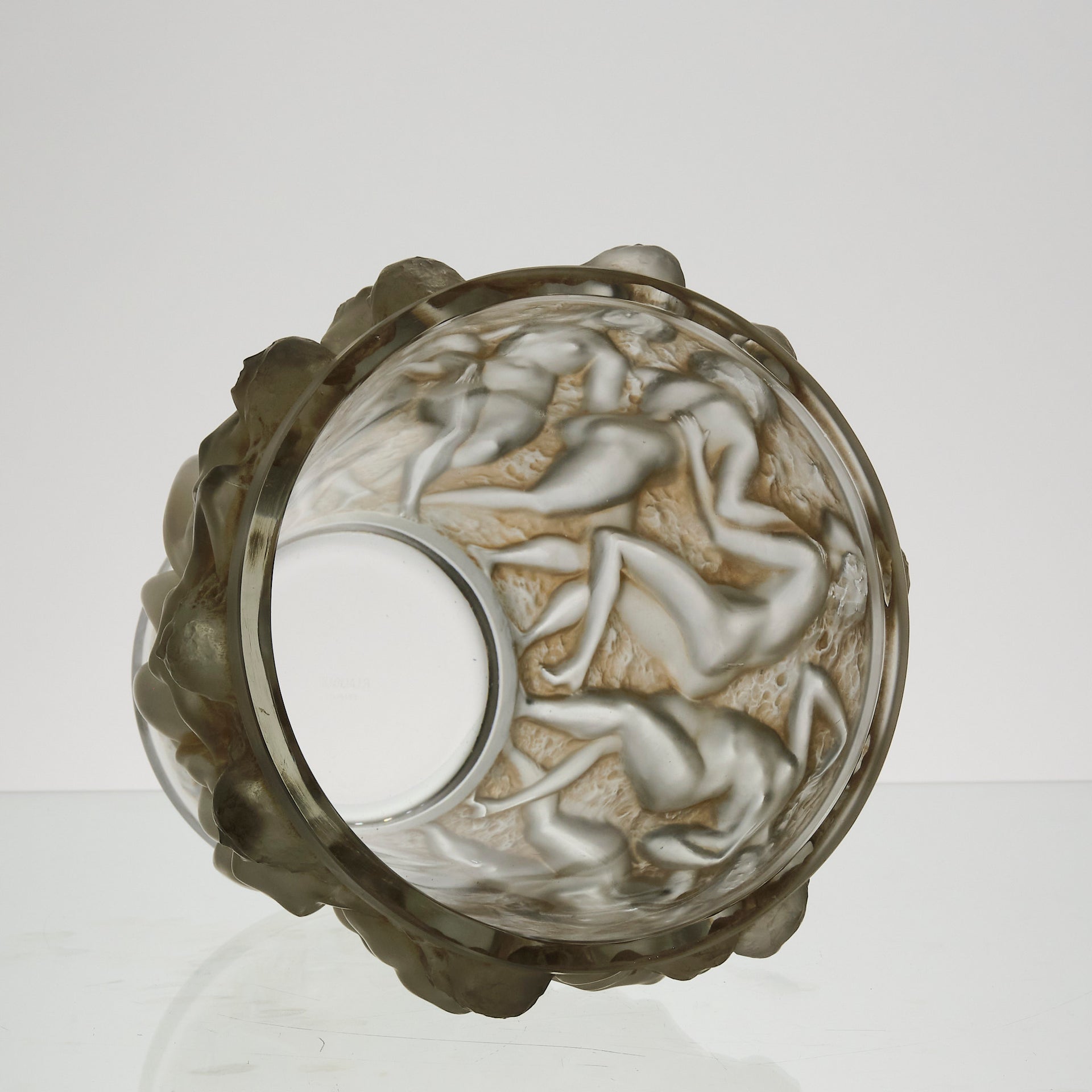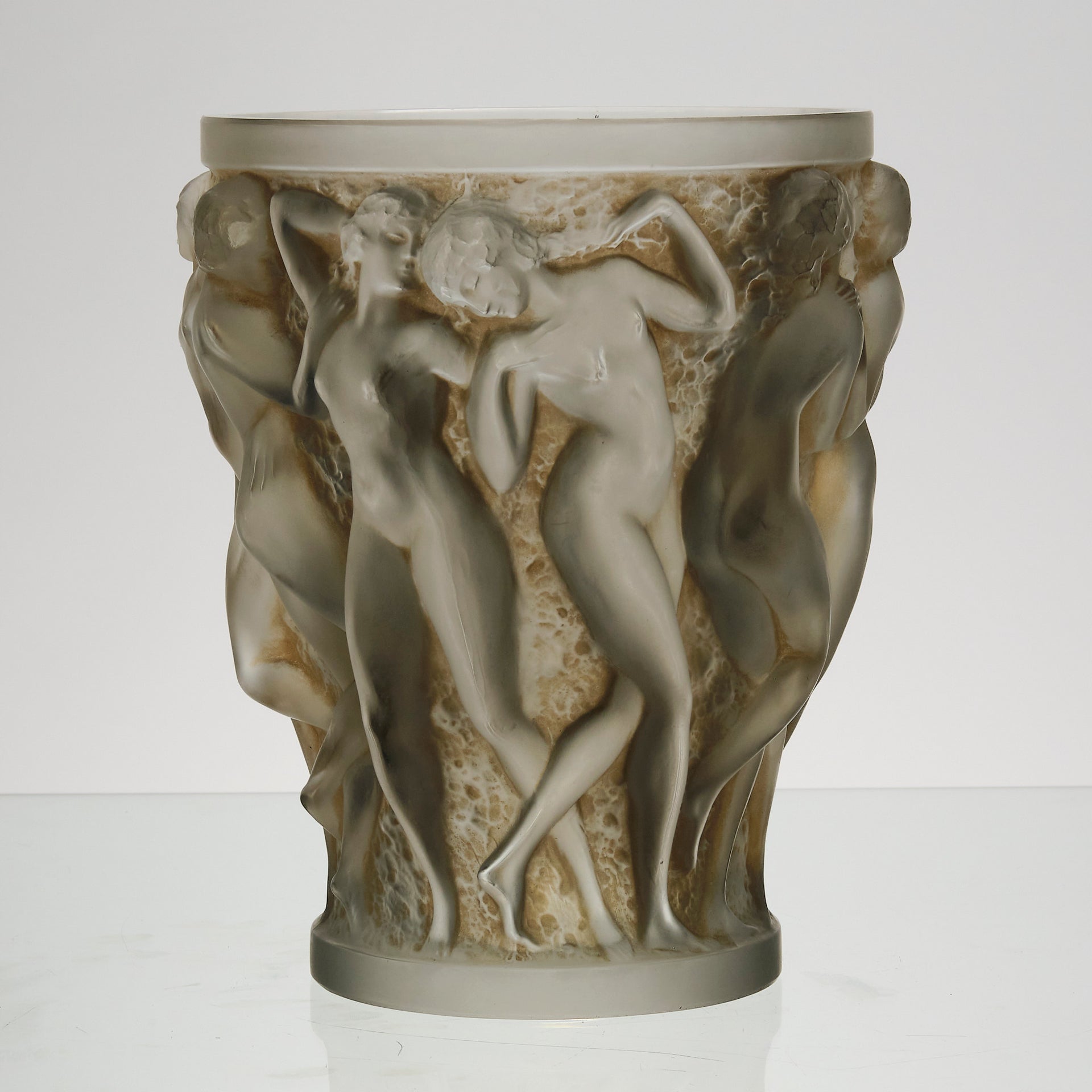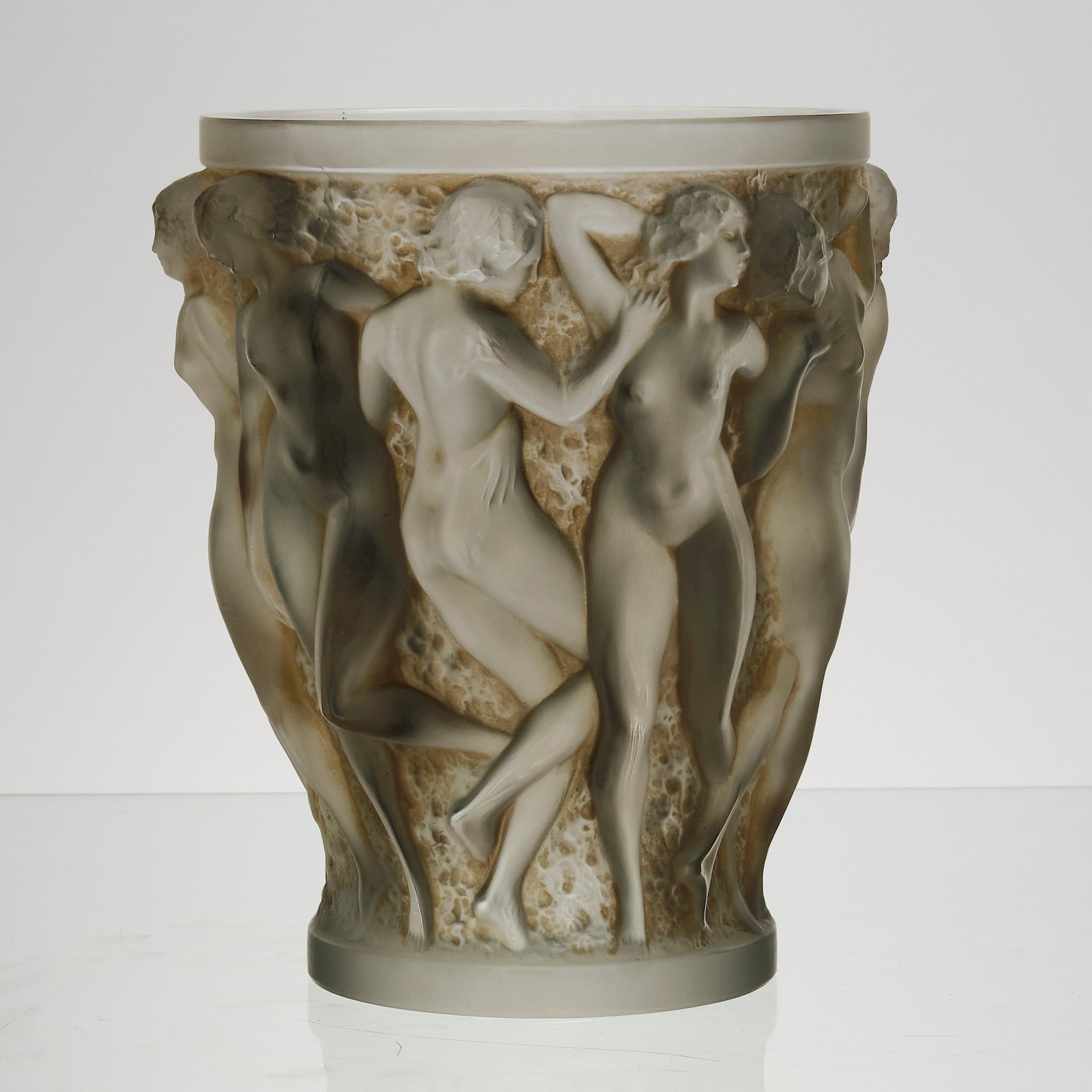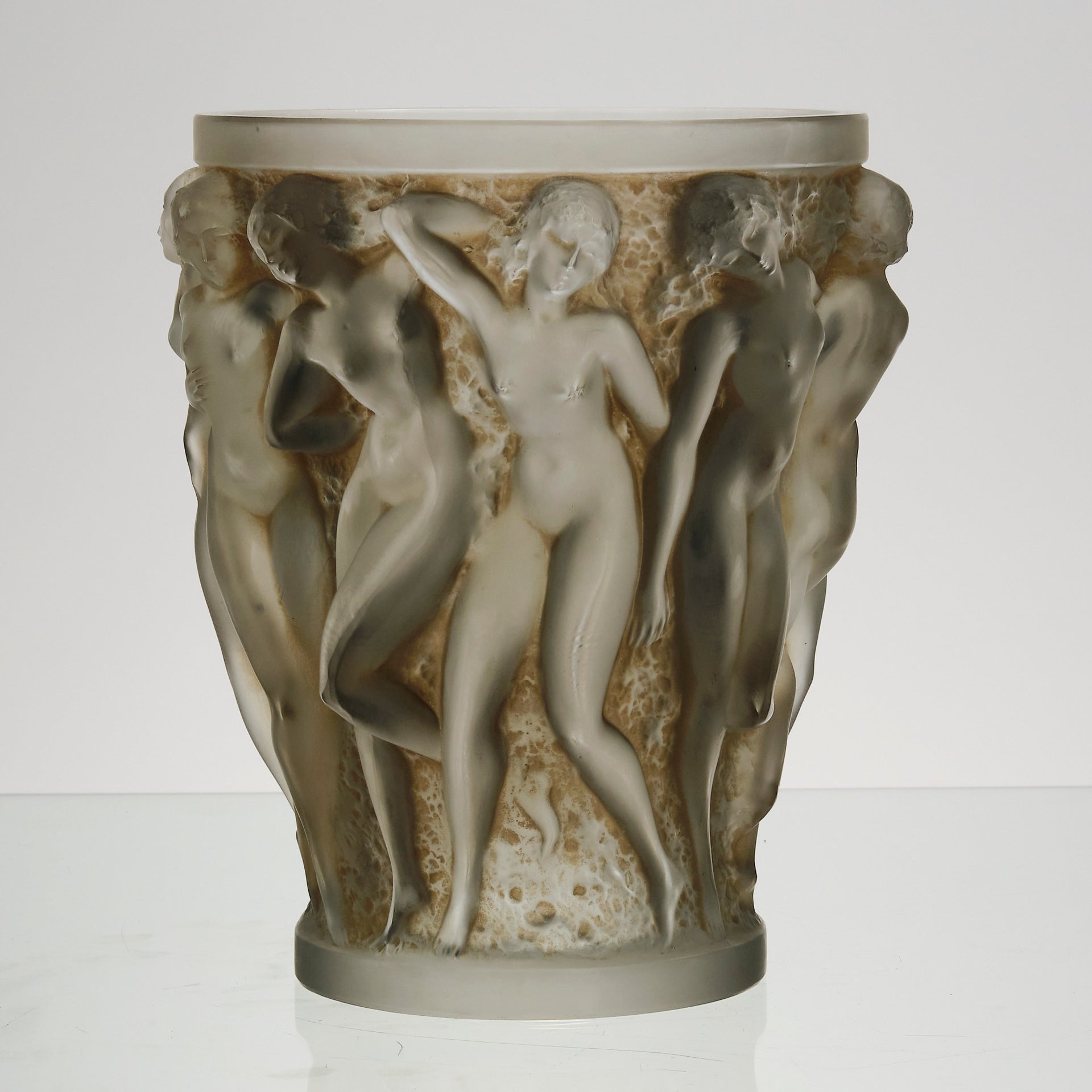 A superb René Lalique Art Deco glass vase decorated with dancing bacchantes in various poses and pairings around the full circumference of the vase, exhibiting an excellent mix of frosted and sepia stained glass with fine hand finished detail, signed R Lalique France