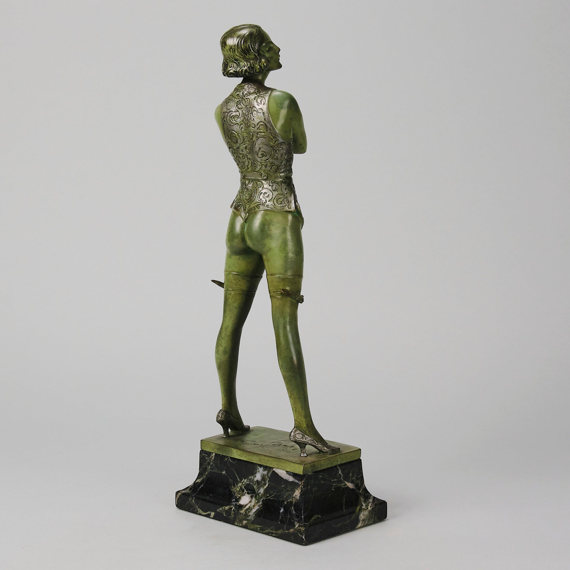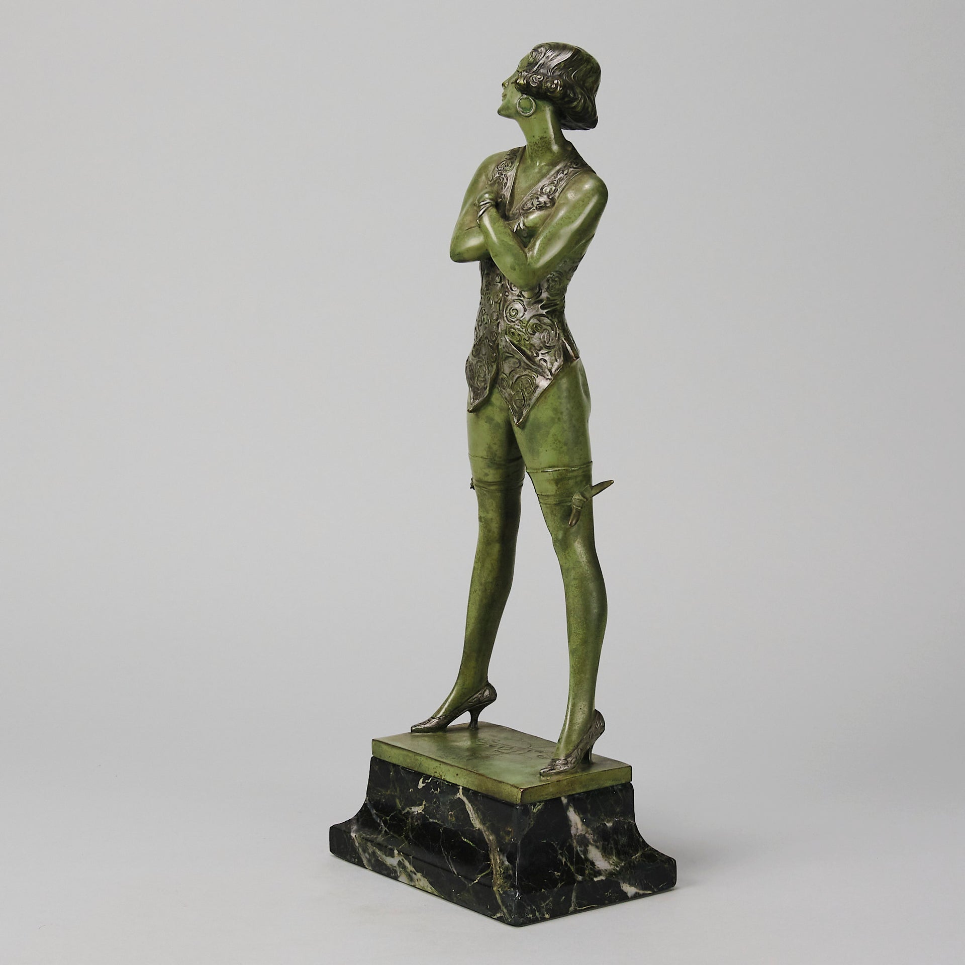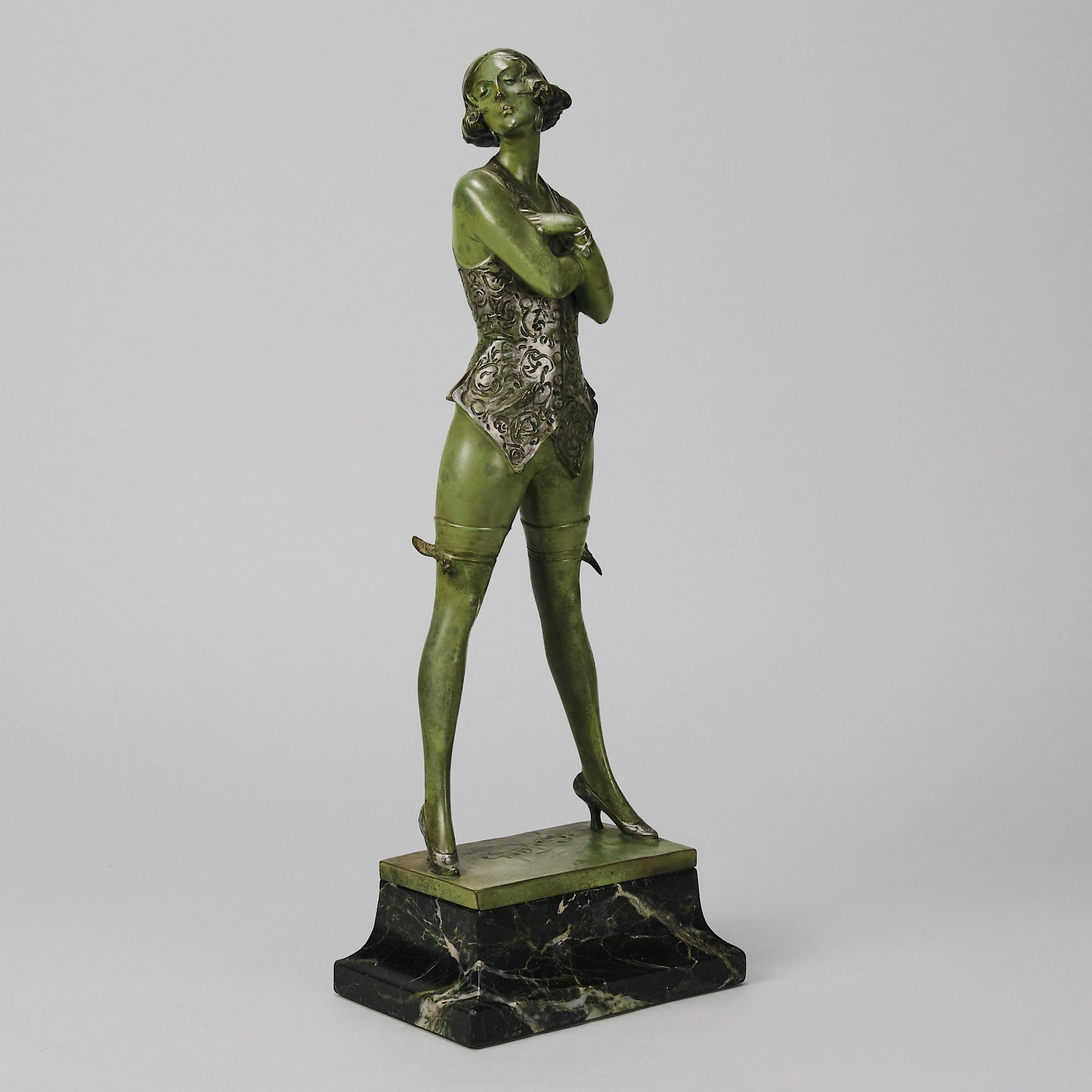 An erotically charged early 20th century Art Deco cold painted silver and green bronze figure of a very confident young woman standing in a domineering pose and wearing a revealing basque with gartered stockings, raised on a square integral base with verde marble plinth, signed Bruno Zach.