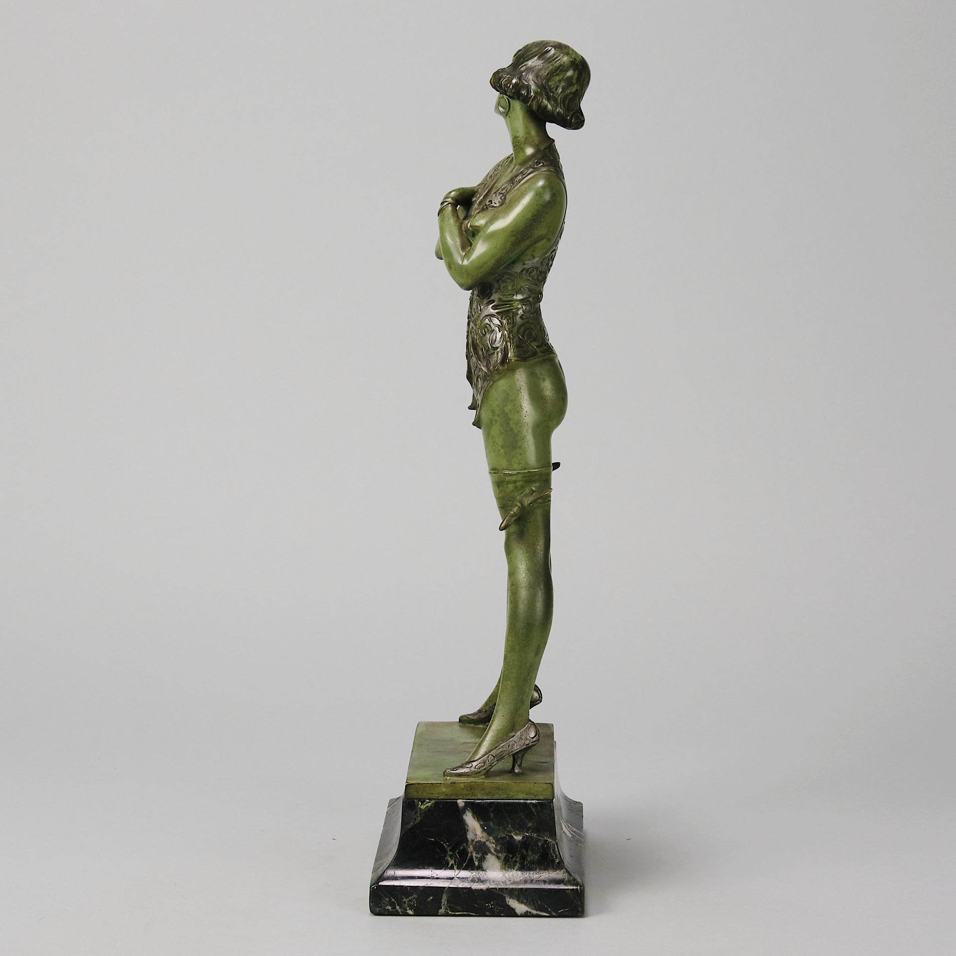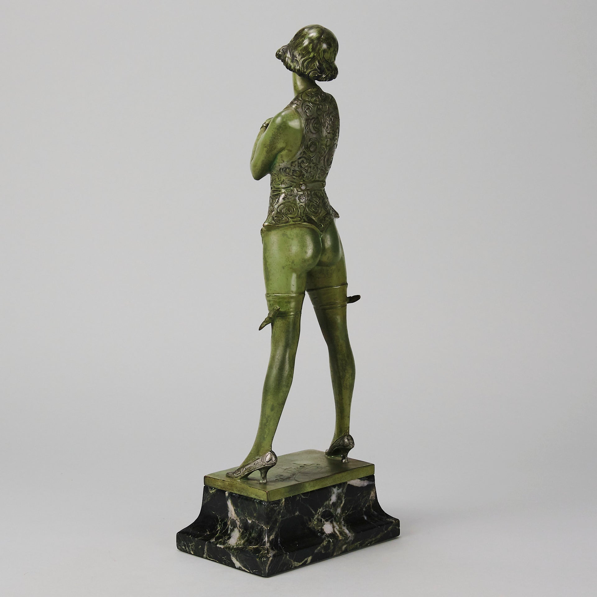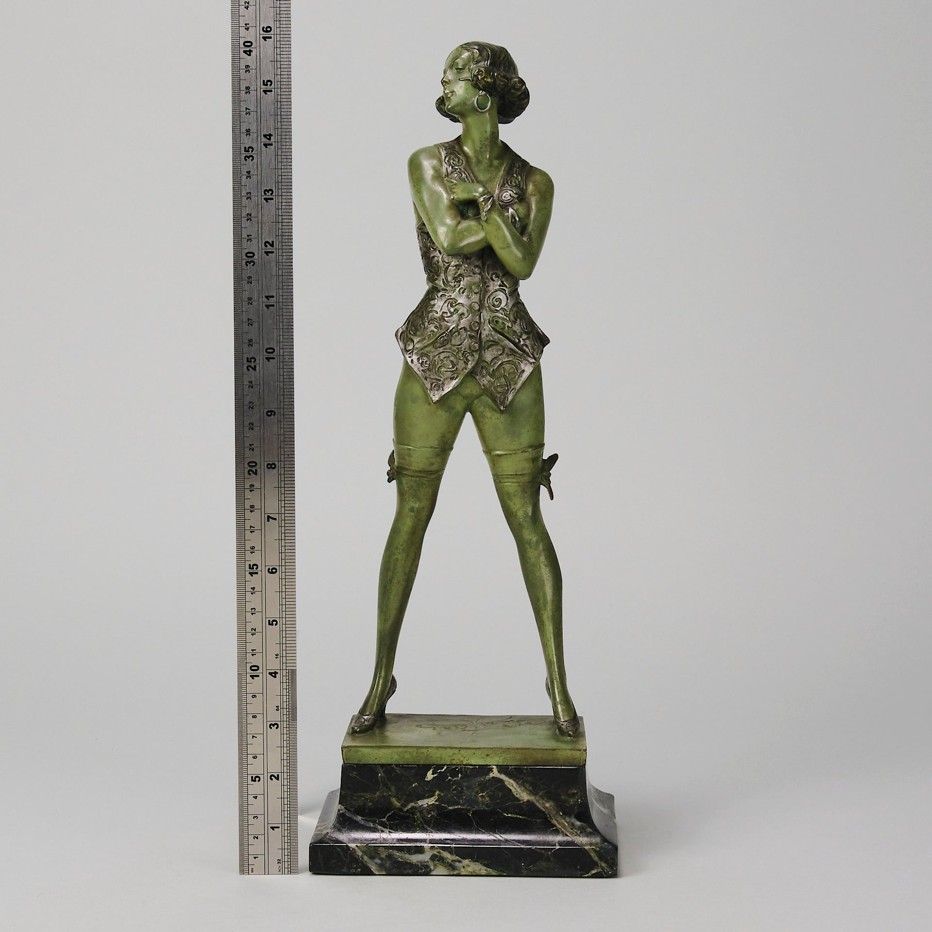 An erotically charged early 20th century Art Deco cold painted silver and green bronze figure of a very confident young woman standing in a domineering pose and wearing a revealing basque with gartered stockings, raised on a square integral base with verde marble plinth, signed Bruno Zach.