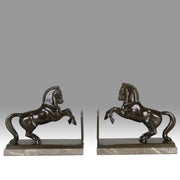 A striking early 20th Century bookends in the form of two stylised rearing horses exhibiting good rich brown patina and fine hand chased surface detail. The bookends on bronze plate further raised on marble bases, signed H S McHen
