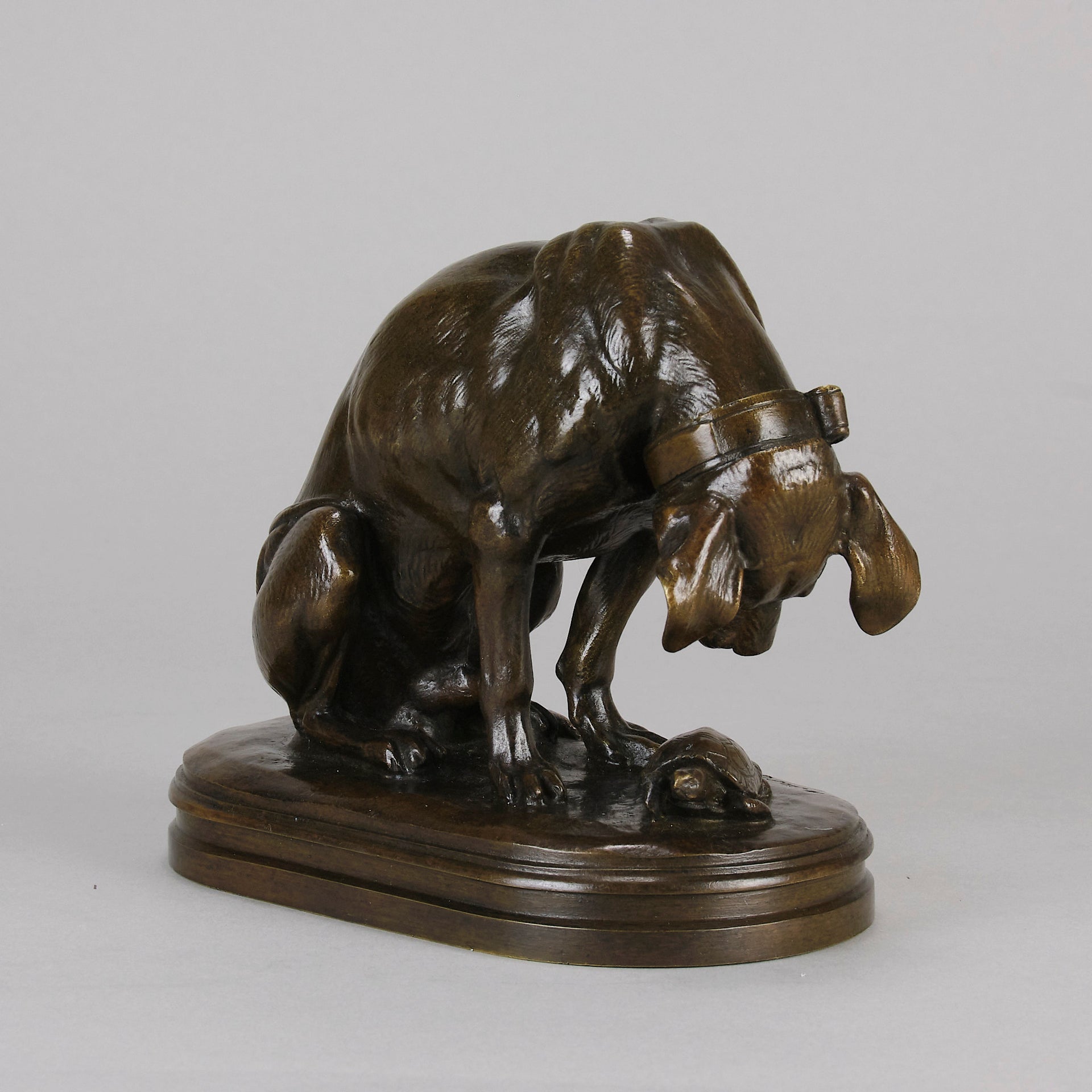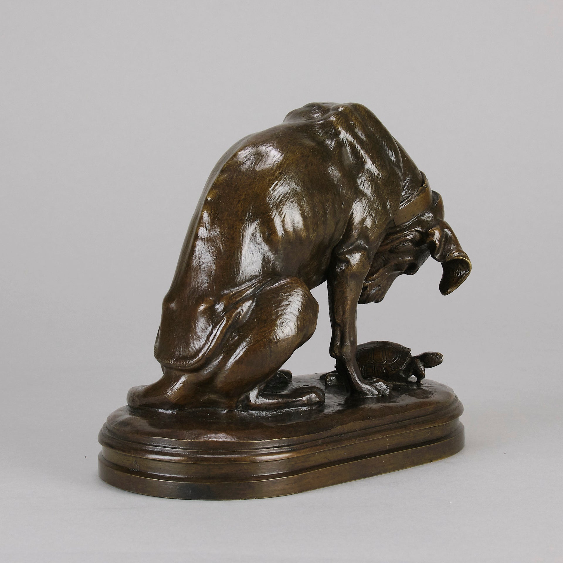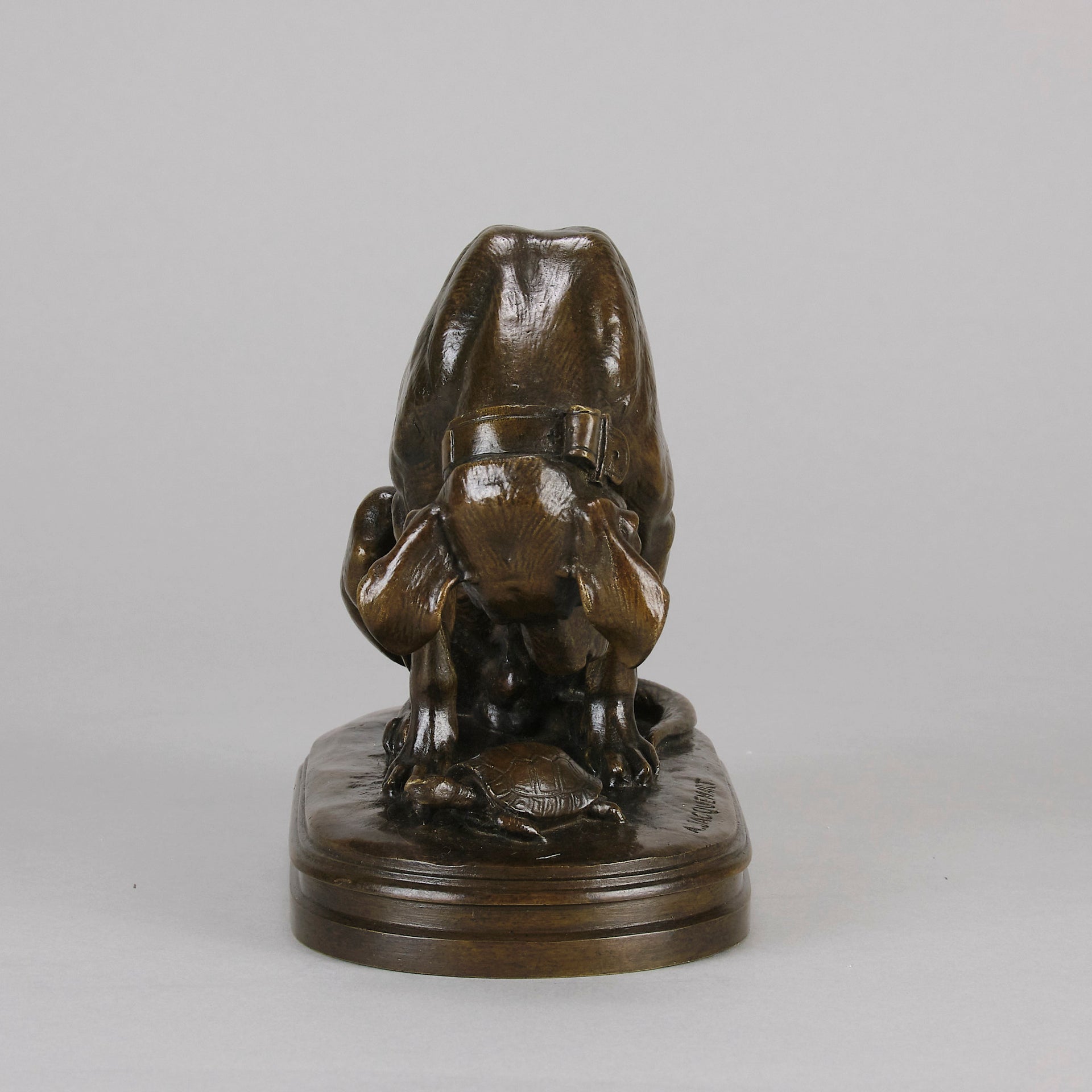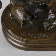 A very fine early 20th Century French bronze entitled "Chien et Tortue", the piece modelled as a hound studying a tortoise with an inquisitive look. The surface of the sculpture has an excellent rich brown patina and very fine hand finished detail. Signed A.Jacquement and stamped 'A.D' for the Delafontaine foundry.