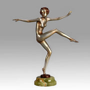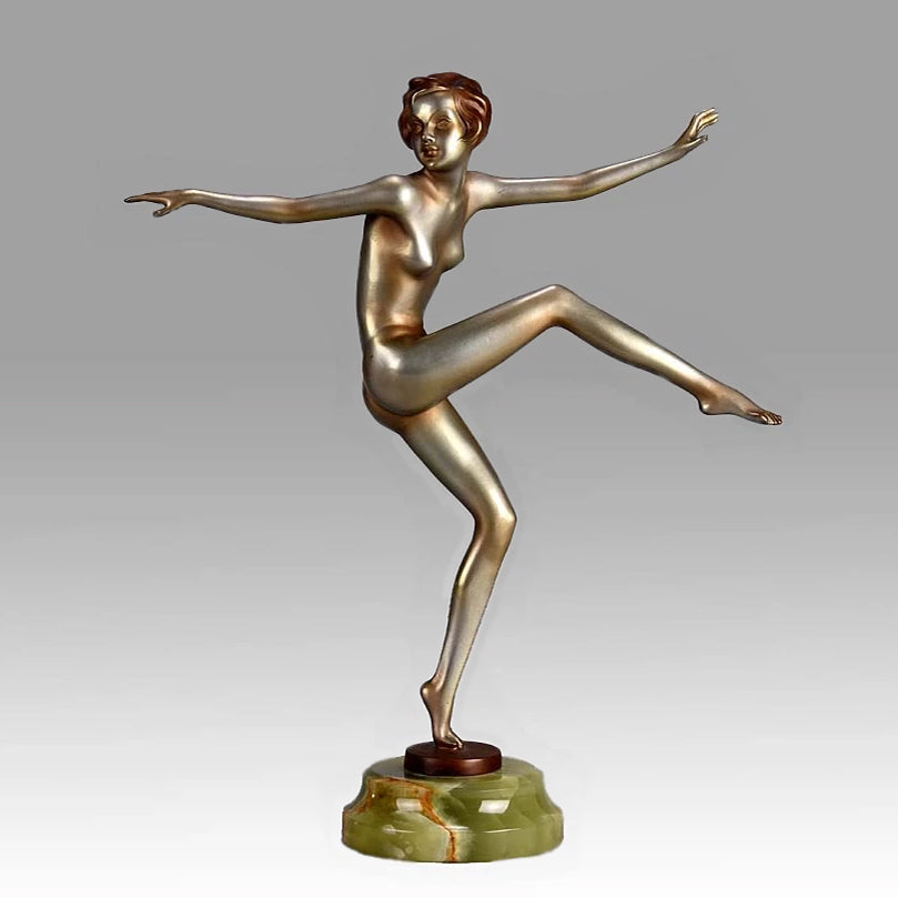 Although very little is known about Lorenzl’s early life we are aware that he was born in Austria in 1892 and was soon to become one of the most talented sculptors of the Art Deco Period. He started by working for a bronze foundry in Vienna Arsenal where he produced stunning Art Deco bronze statuettes. The majority of his works in bronze and ivory were of singular slim female nudes with long legs which conveyed elegance. His preference was for dancing poses which were not only evident in his singular statuettes but also in those attached to marble clocks, lamp bases and bookends.