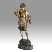 Excellent Art Deco cold painted bronze figure of an erotic beauty standing in an authoritative pose, exhibiting excellent colour and very fine hand finished detail, raised on an verde marble base and signed Zach