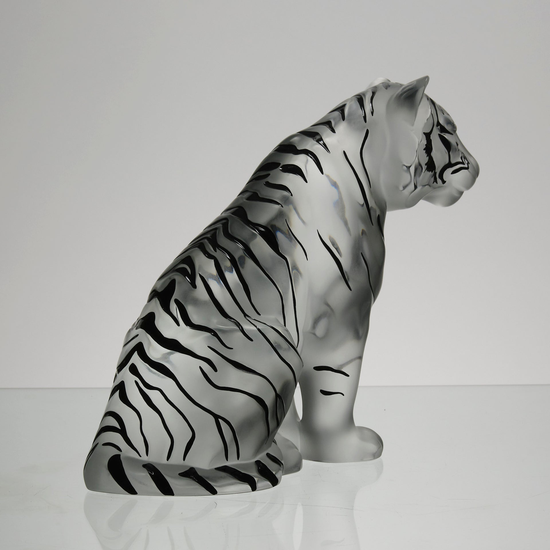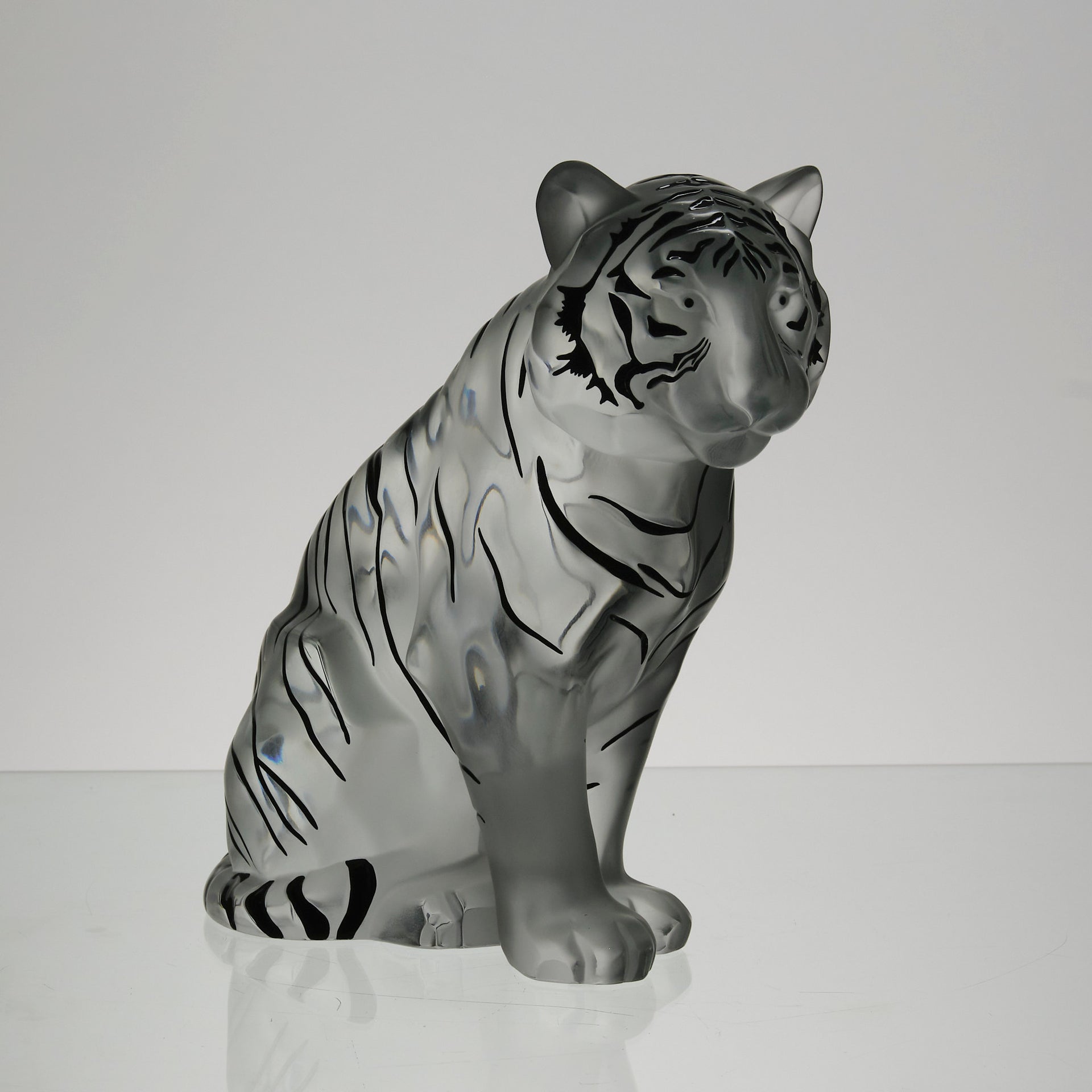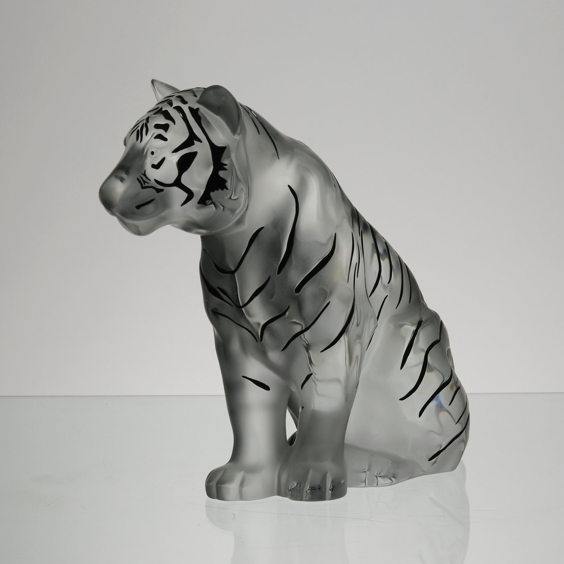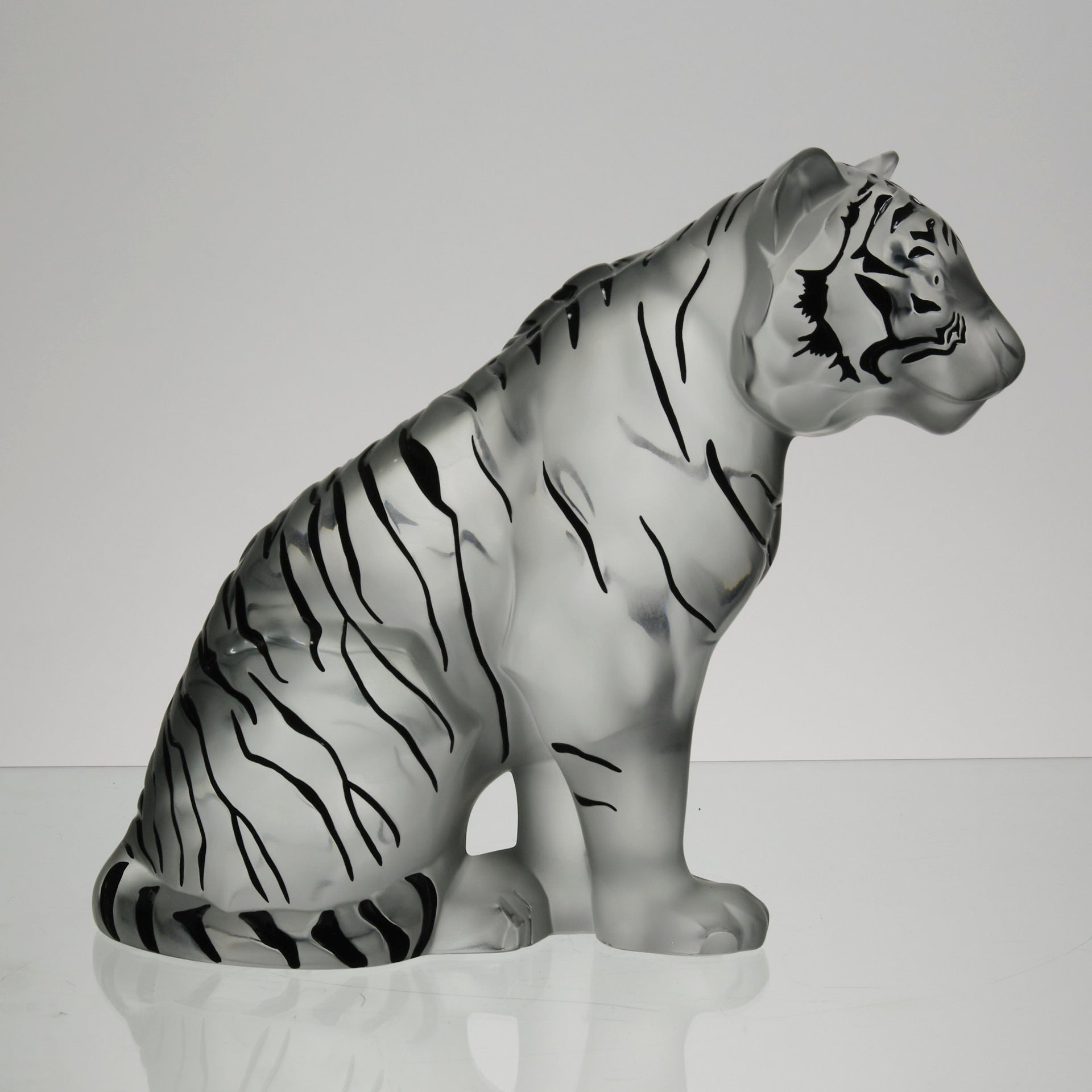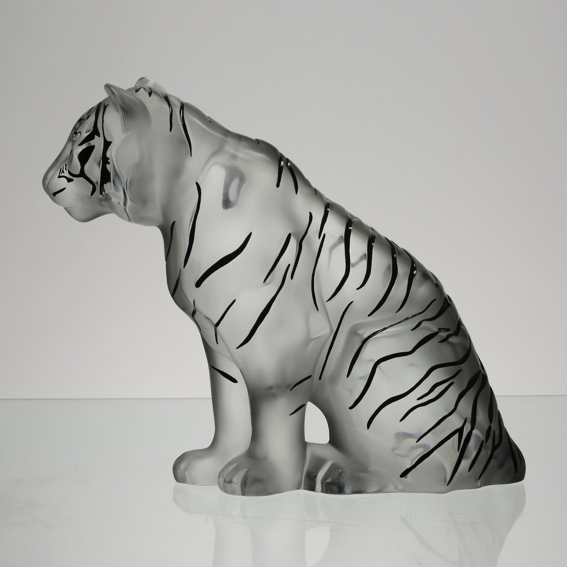 A majestic limited edition frosted and clear glass figure of a seated tiger heightened with black enamel stripes exhibiting excellent hand finished surface detail, signed Lalique France