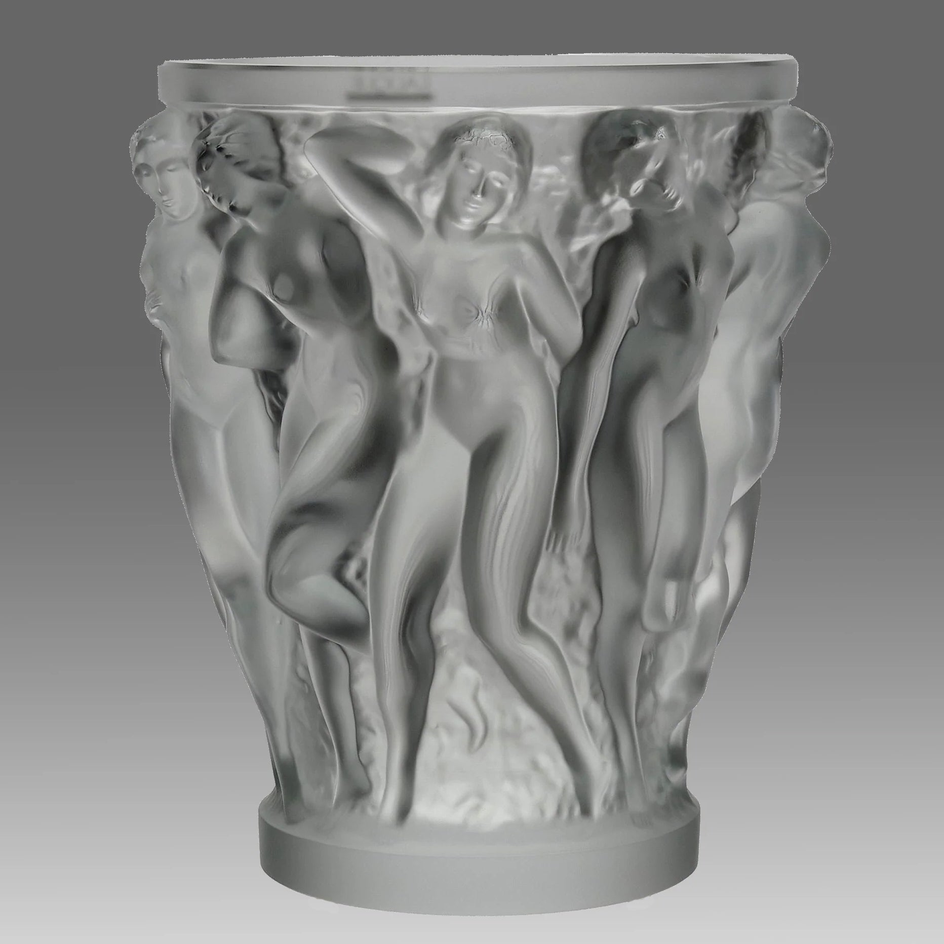 Dramatic limited edition very large frosted glass vase decorated with naked dancing bacchantes in various poses and pairings. This fabulous vase is the largest example of three different sizes produced at the Lalique glassworks and is enhanced with burnished areas and fabulous detailed finish. The vase with original Lalique label, signed Lalique France and numbered