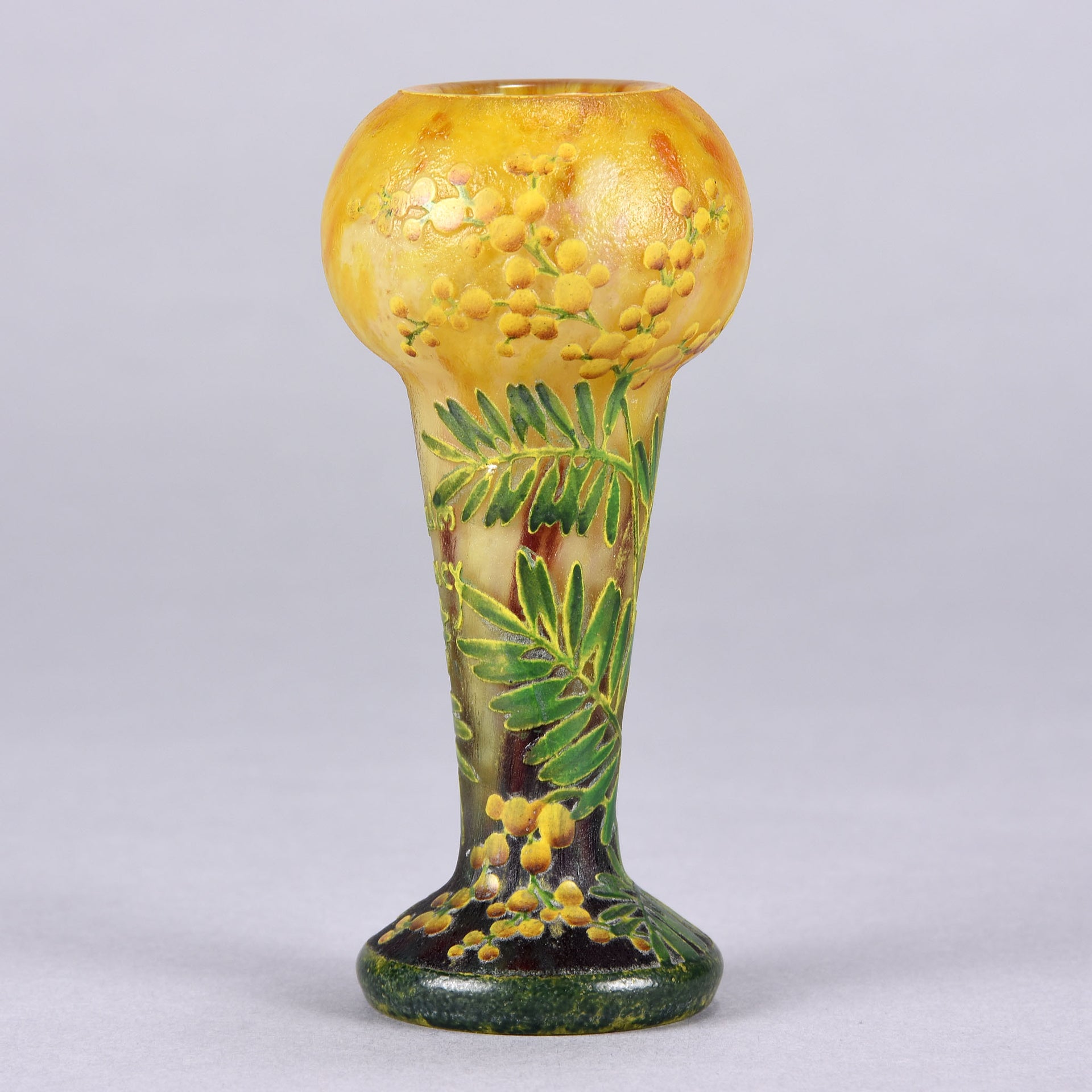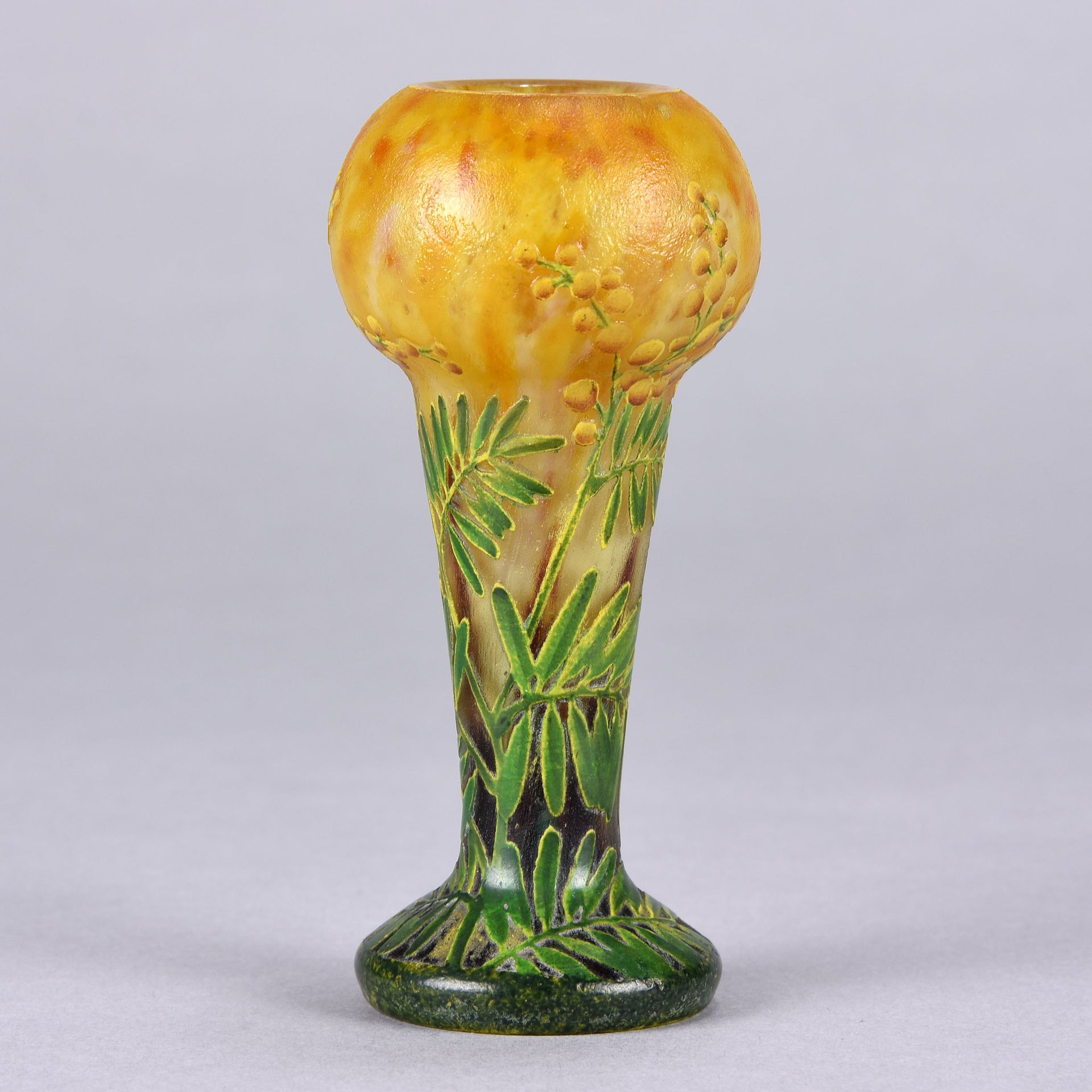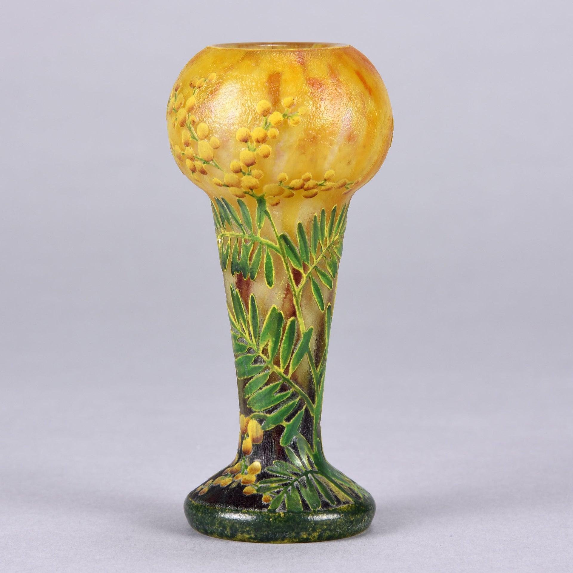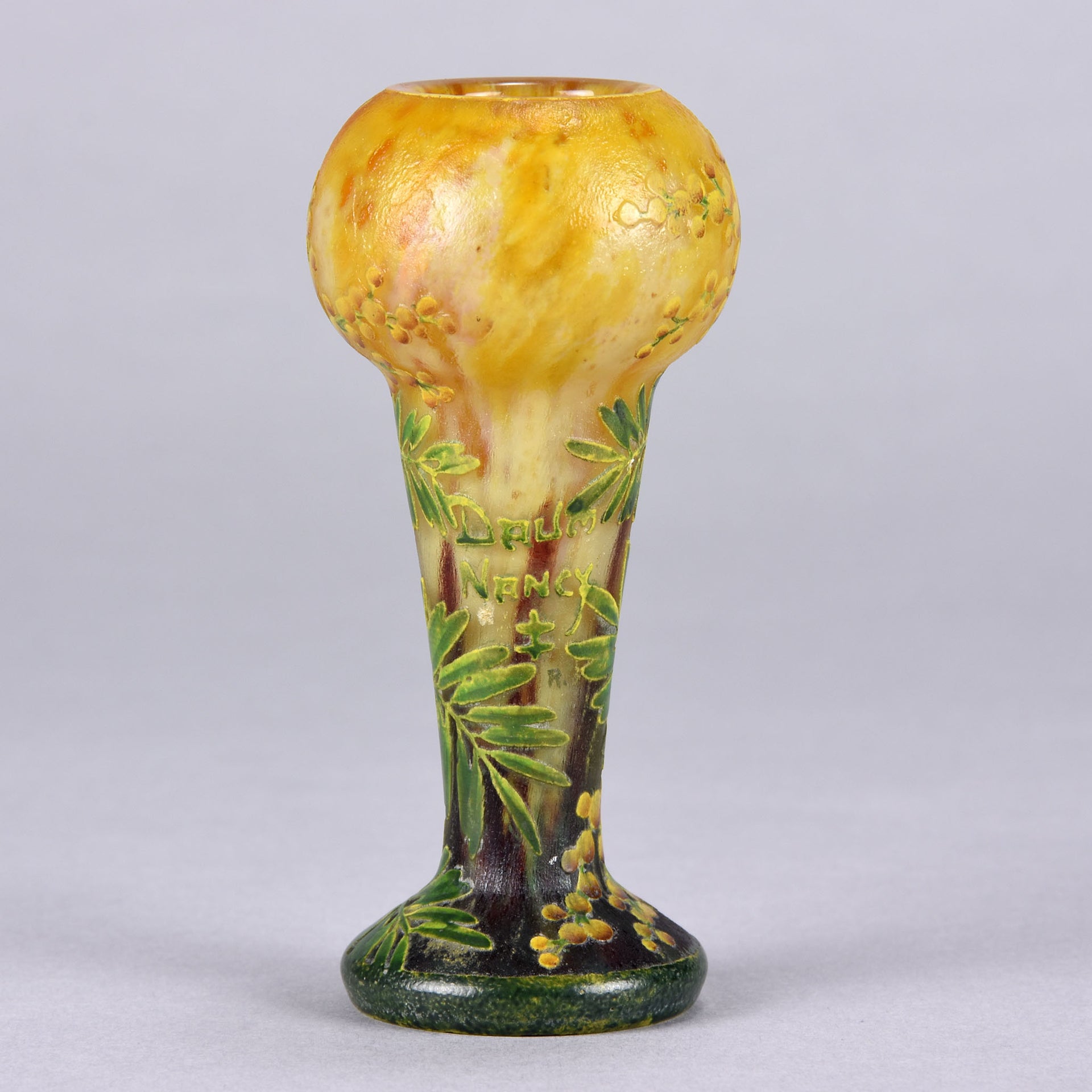A stunning late 19th Century cameo glass round topped footed vase etched and enamel painted with a beautiful Mimosa tree design against a wam yellow field, exhibiting excellent surface detail and eyechatching colour, signed Daum Nancy and with Cross of Lorraine.