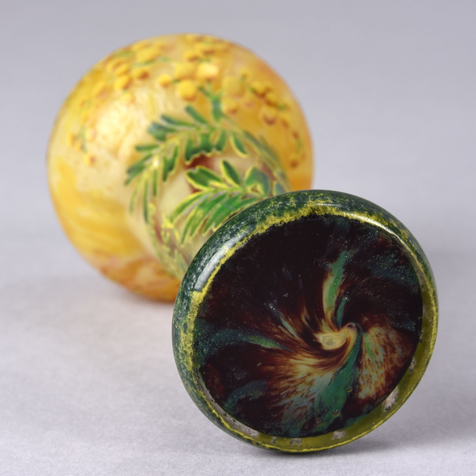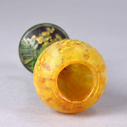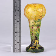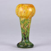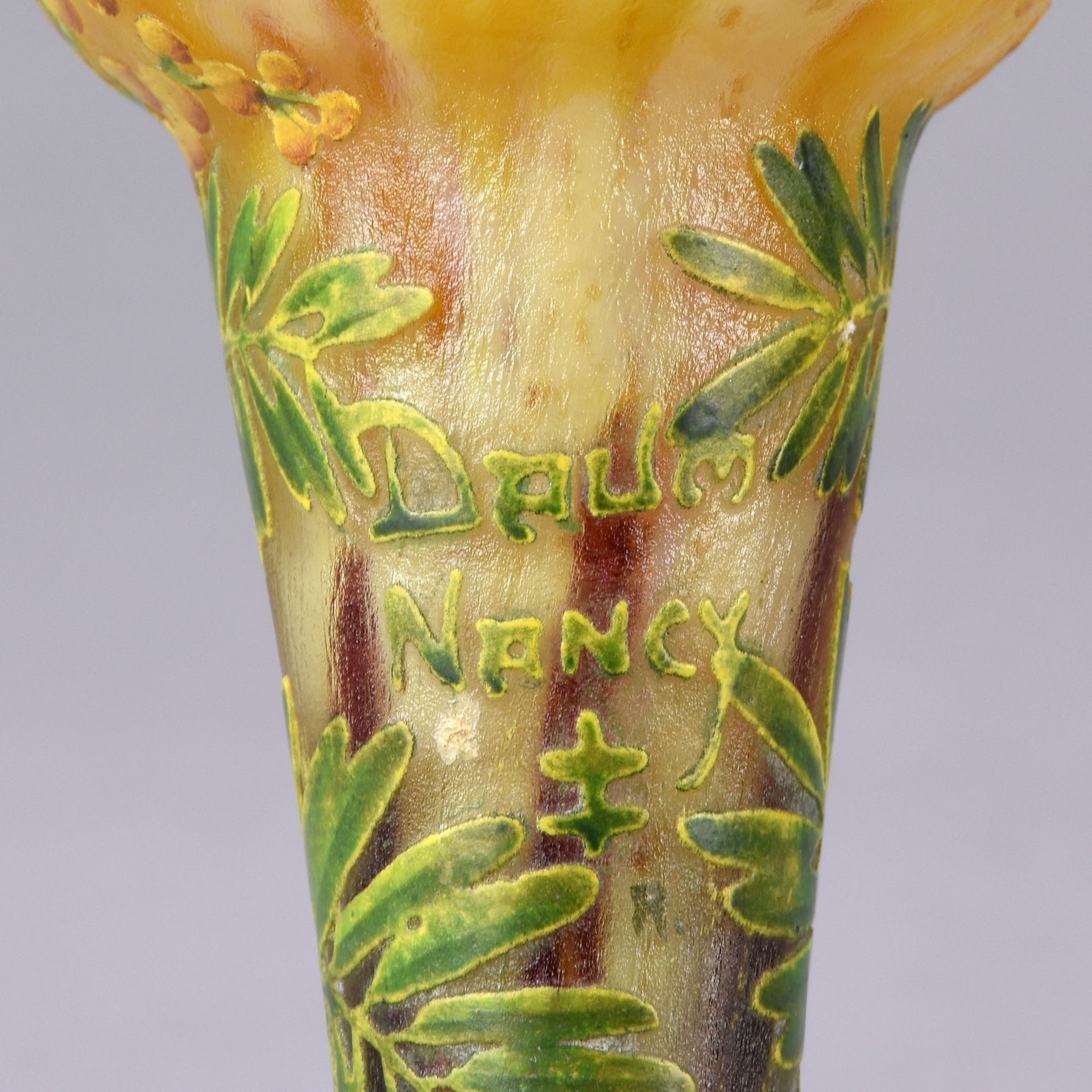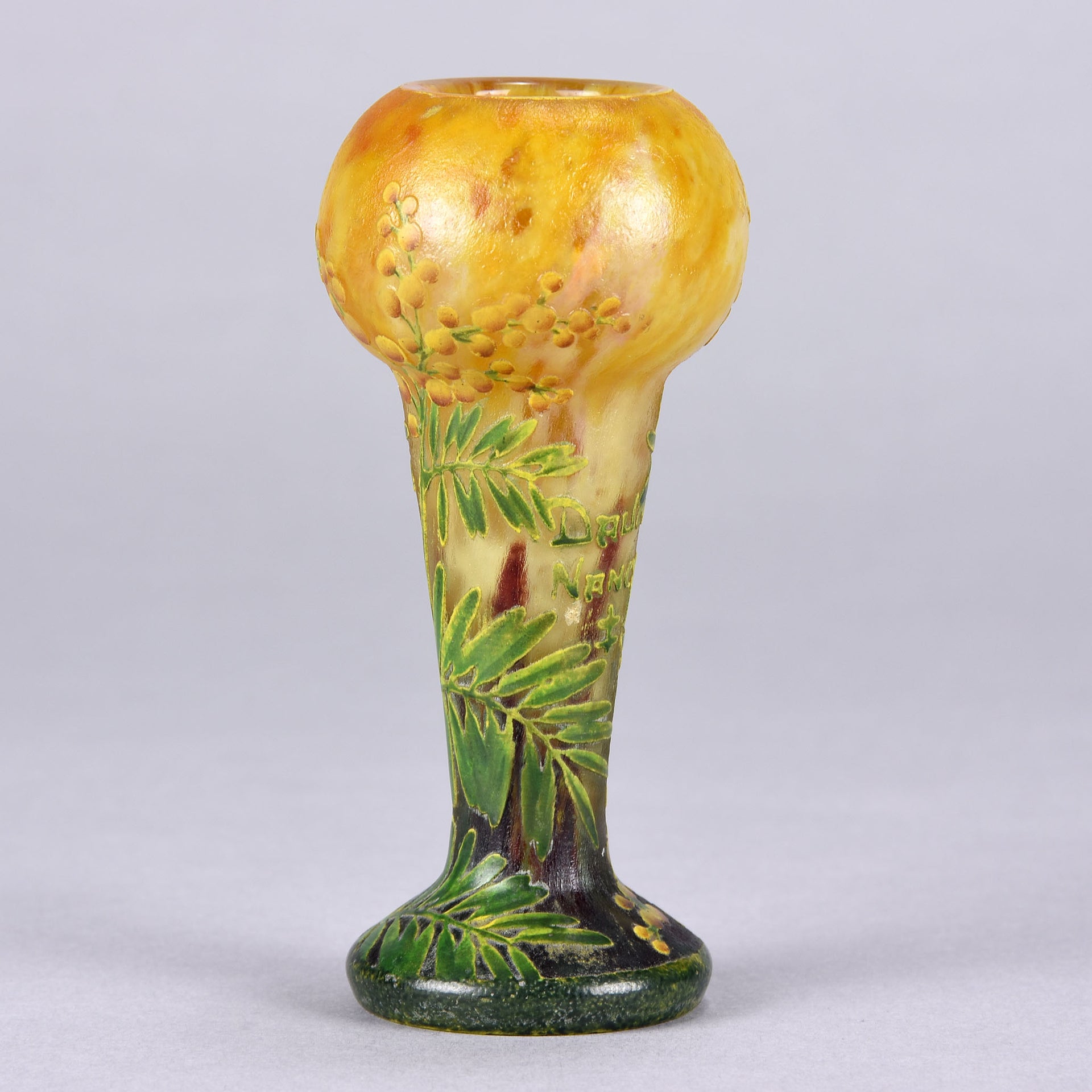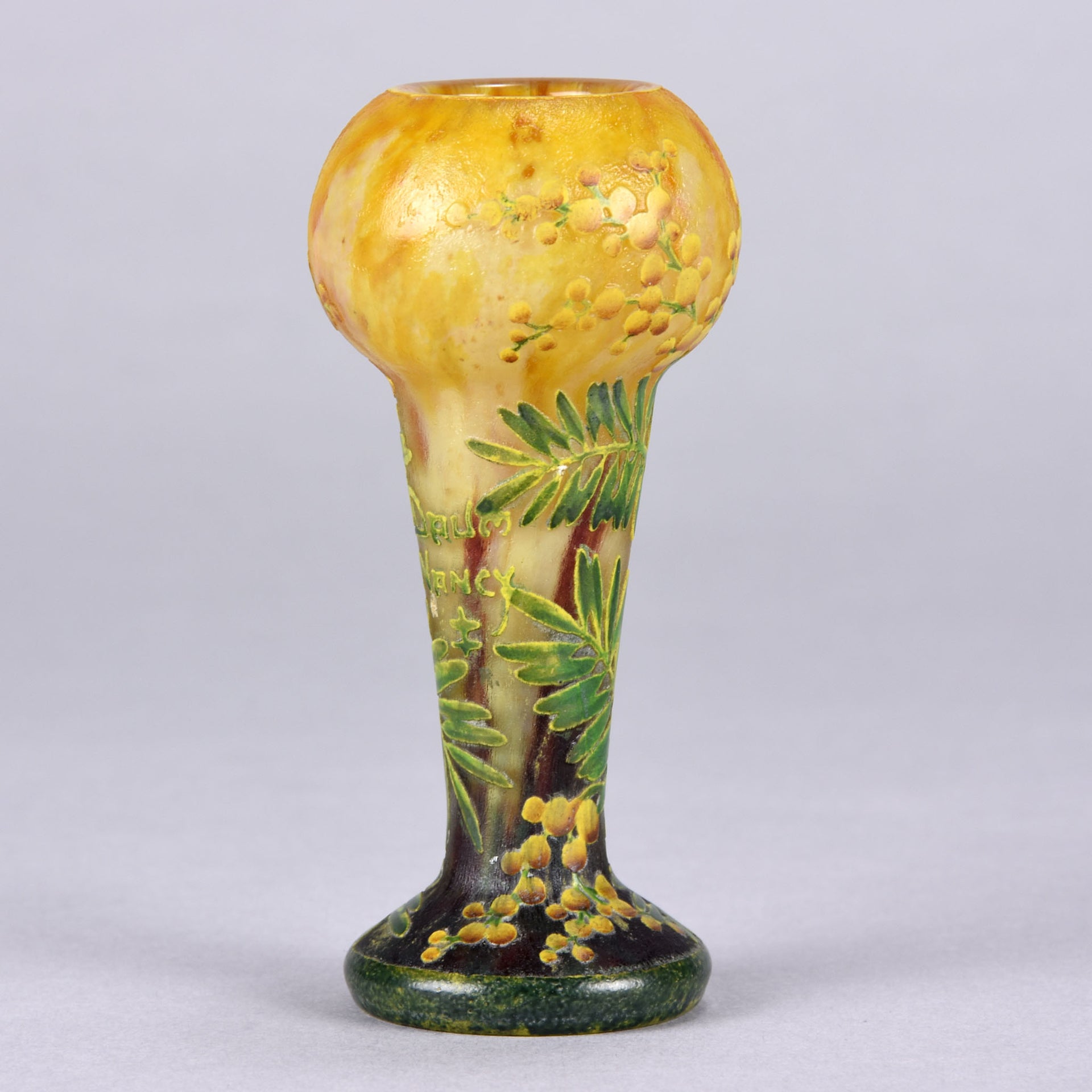 A stunning late 19th Century cameo glass round topped footed vase etched and enamel painted with a beautiful Mimosa tree design against a wam yellow field, exhibiting excellent surface detail and eyechatching colour, signed Daum Nancy and with Cross of Lorraine.