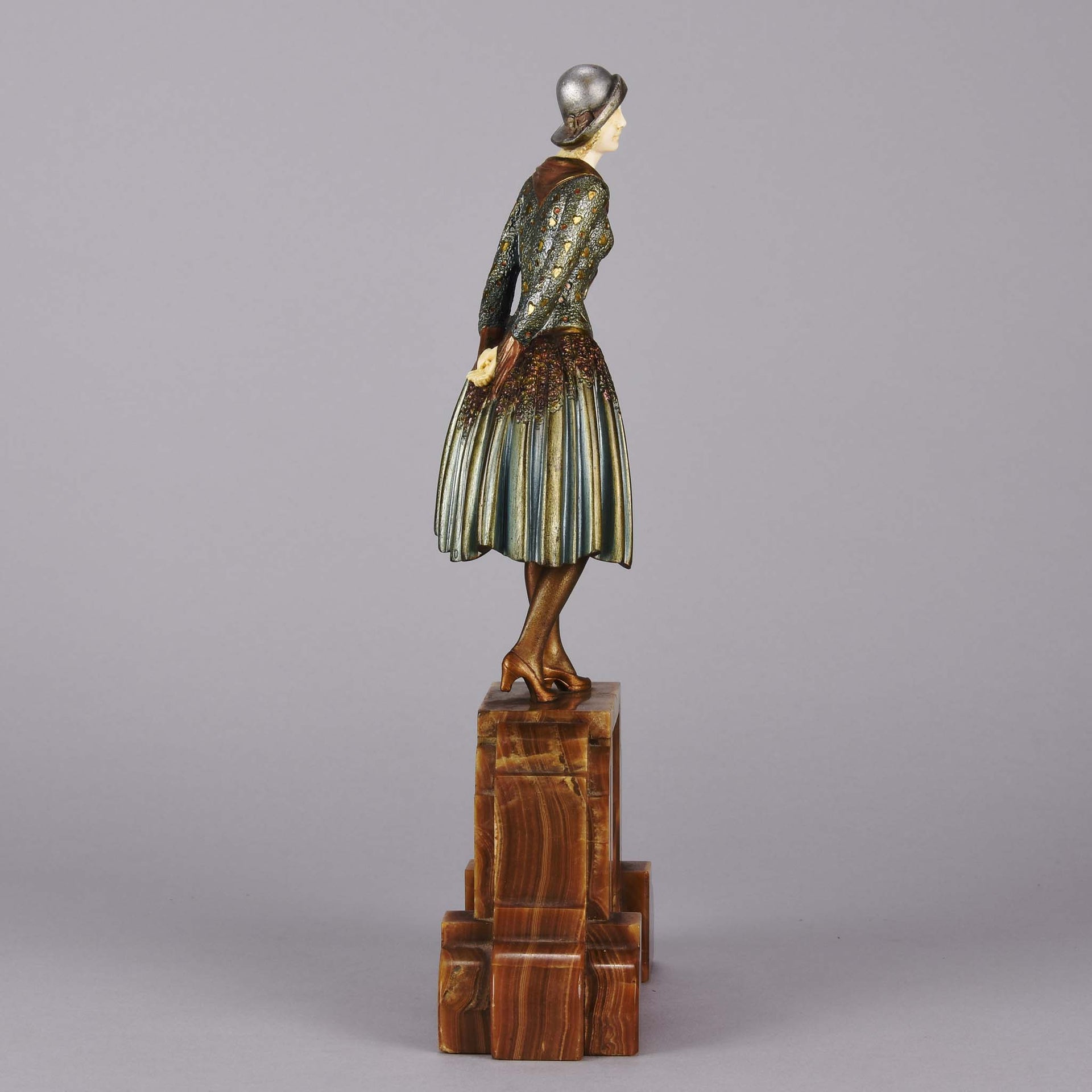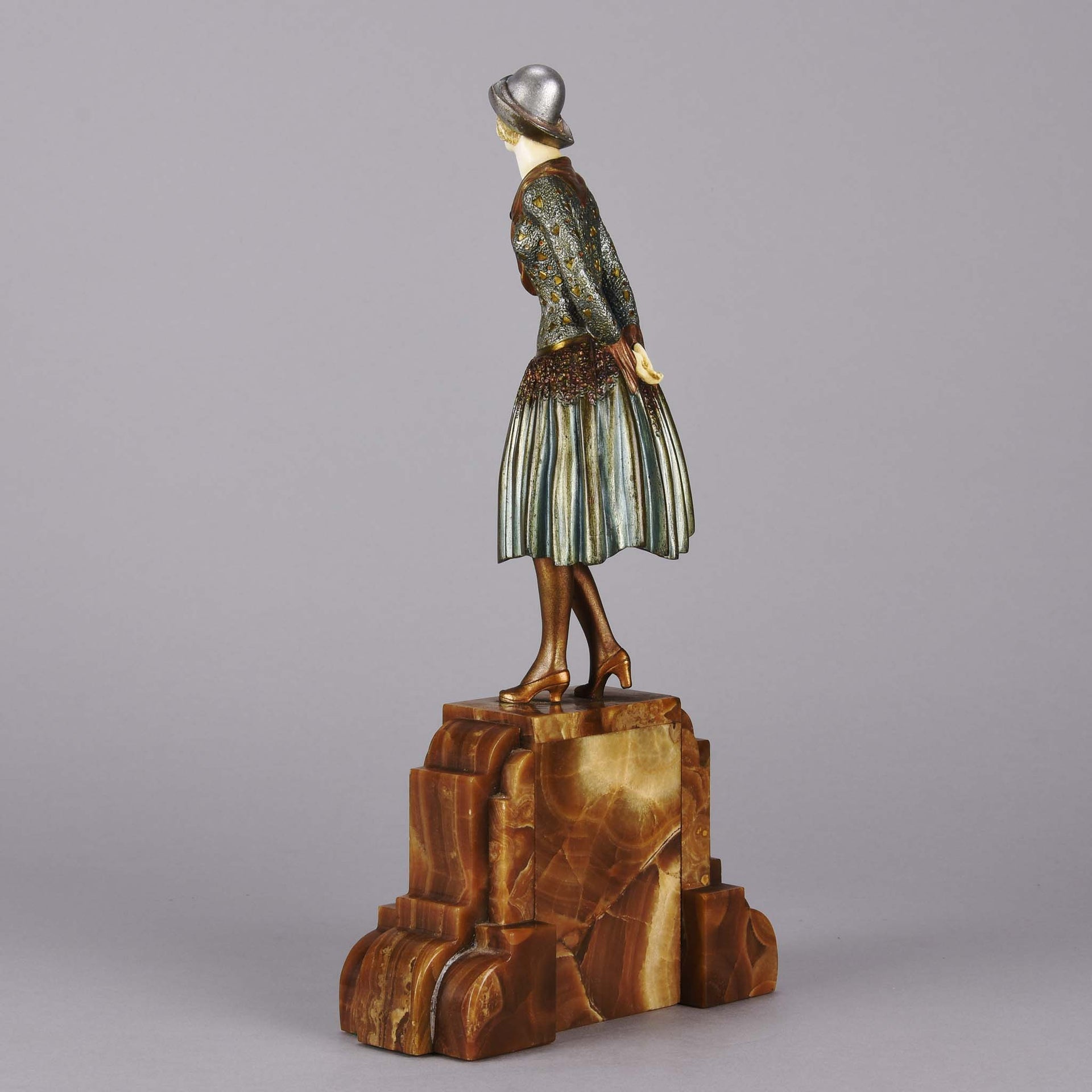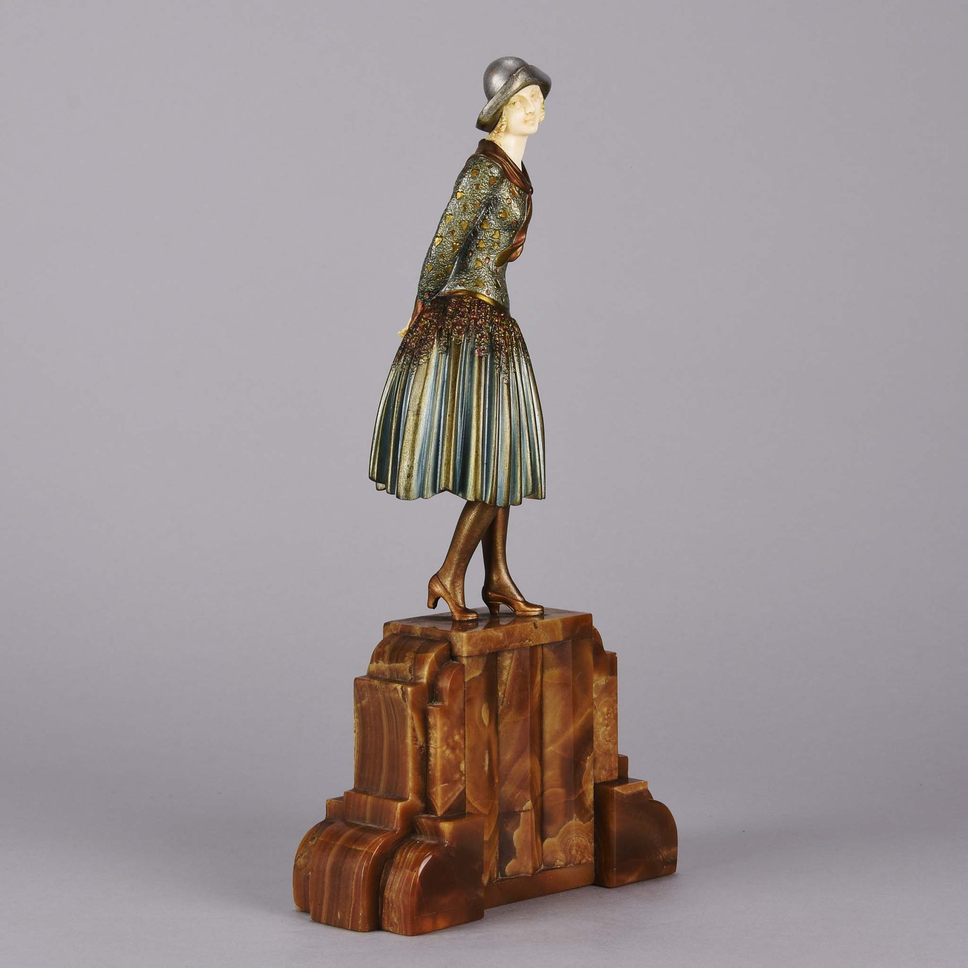 Stunning early 20th Century cold painted bronze and ivory figurine of a young woman in full Art Deco period attire with excellent hand finished surface detail, signed Chiparus. and raised on a brown onyx faceted and shaped plinth.