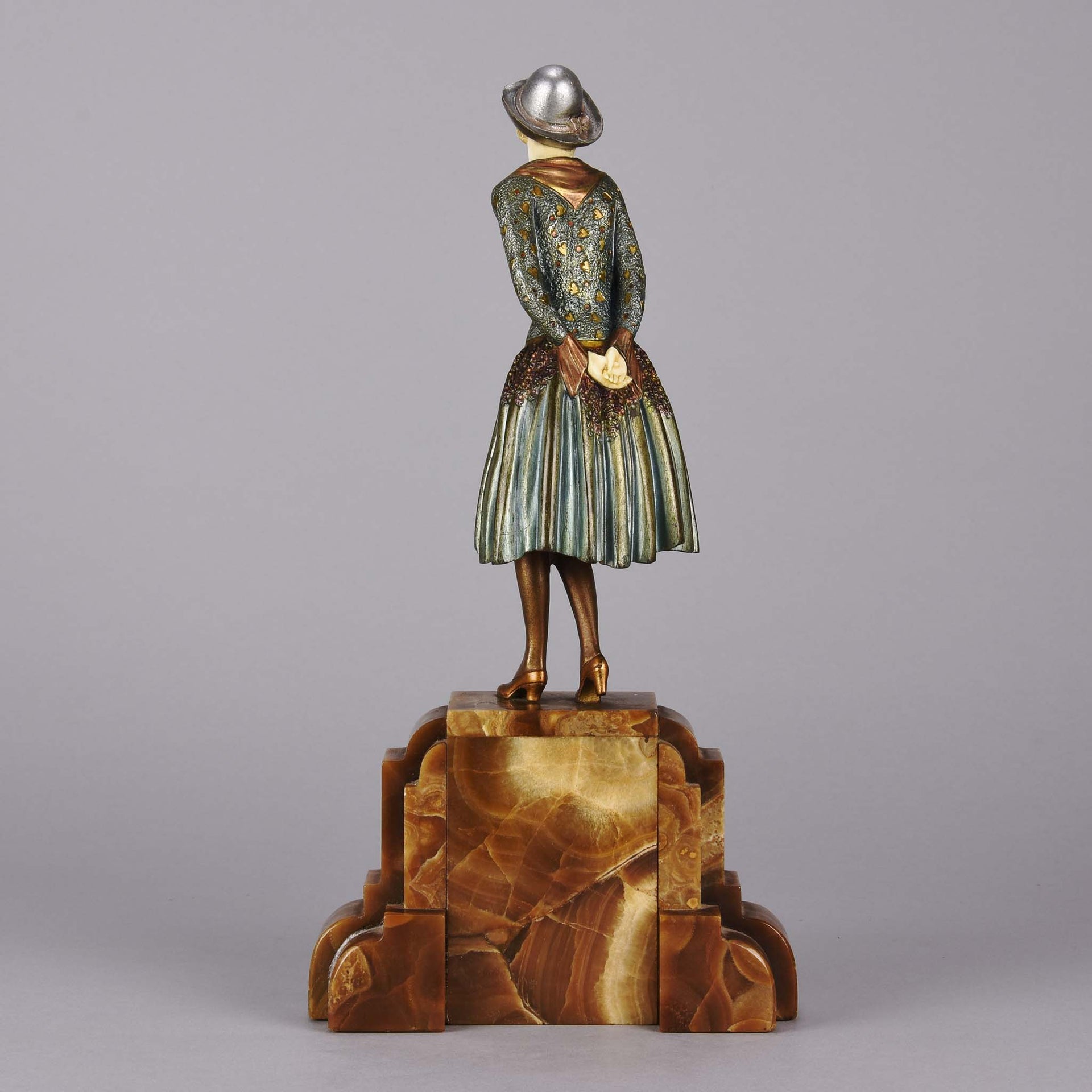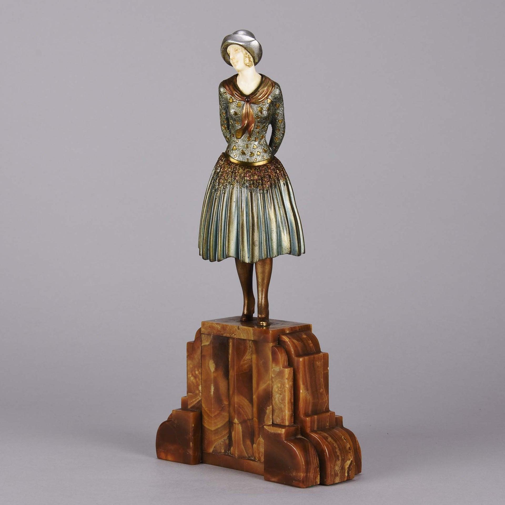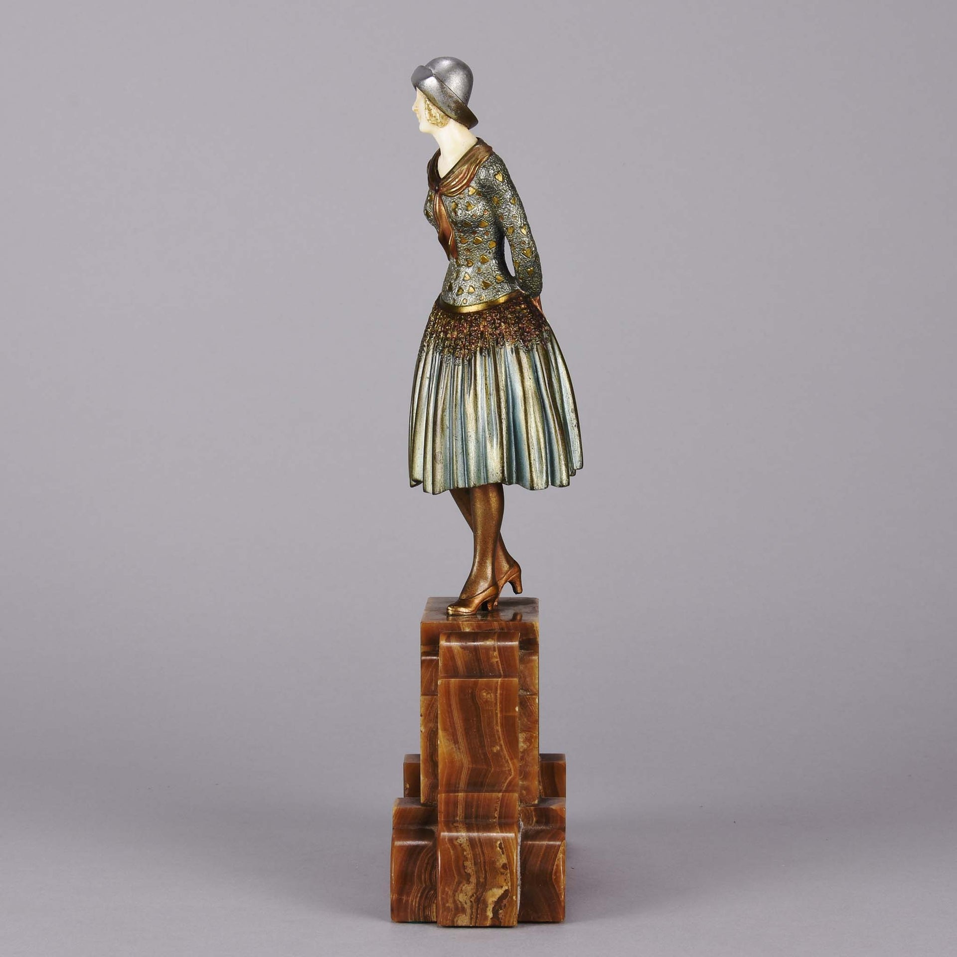 Stunning early 20th Century cold painted bronze and ivory figurine of a young woman in full Art Deco period attire with excellent hand finished surface detail, signed Chiparus. and raised on a brown onyx faceted and shaped plinth.