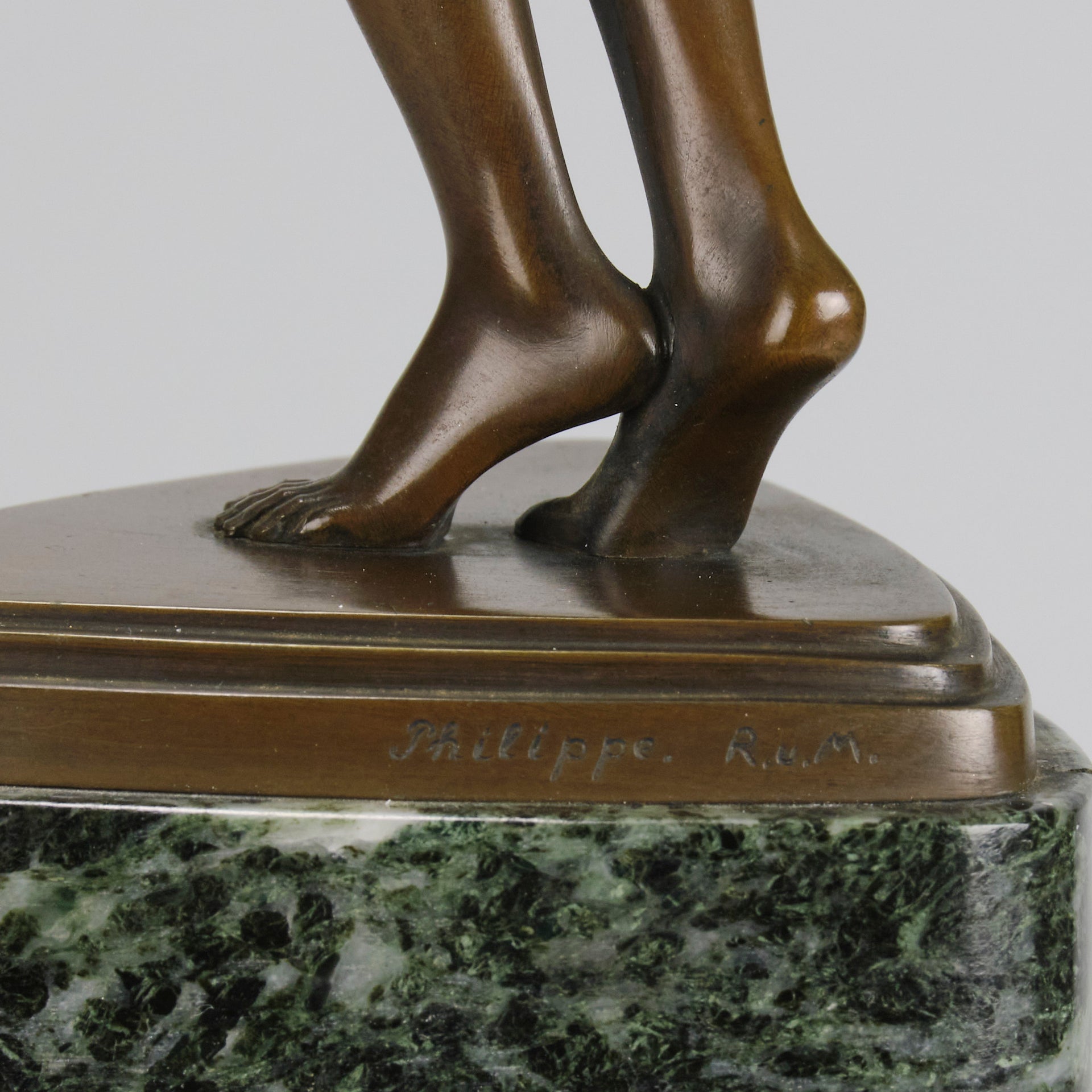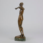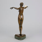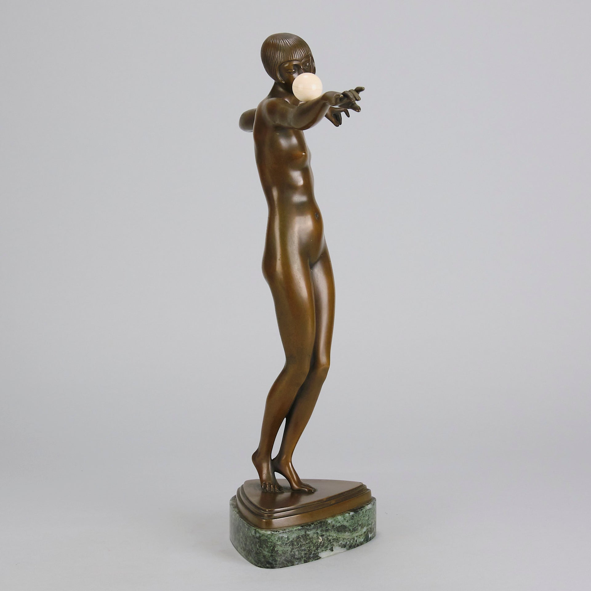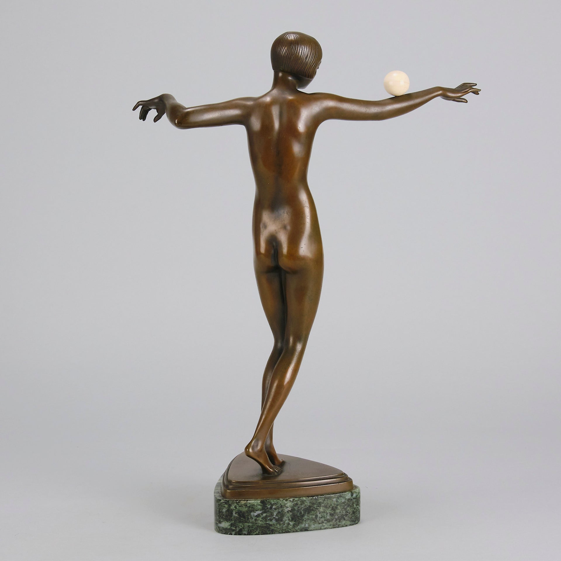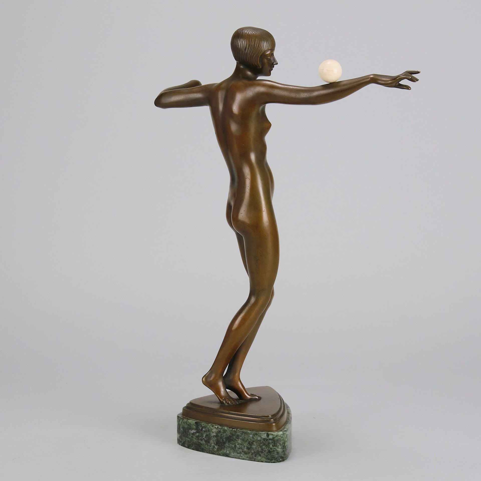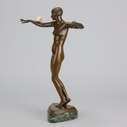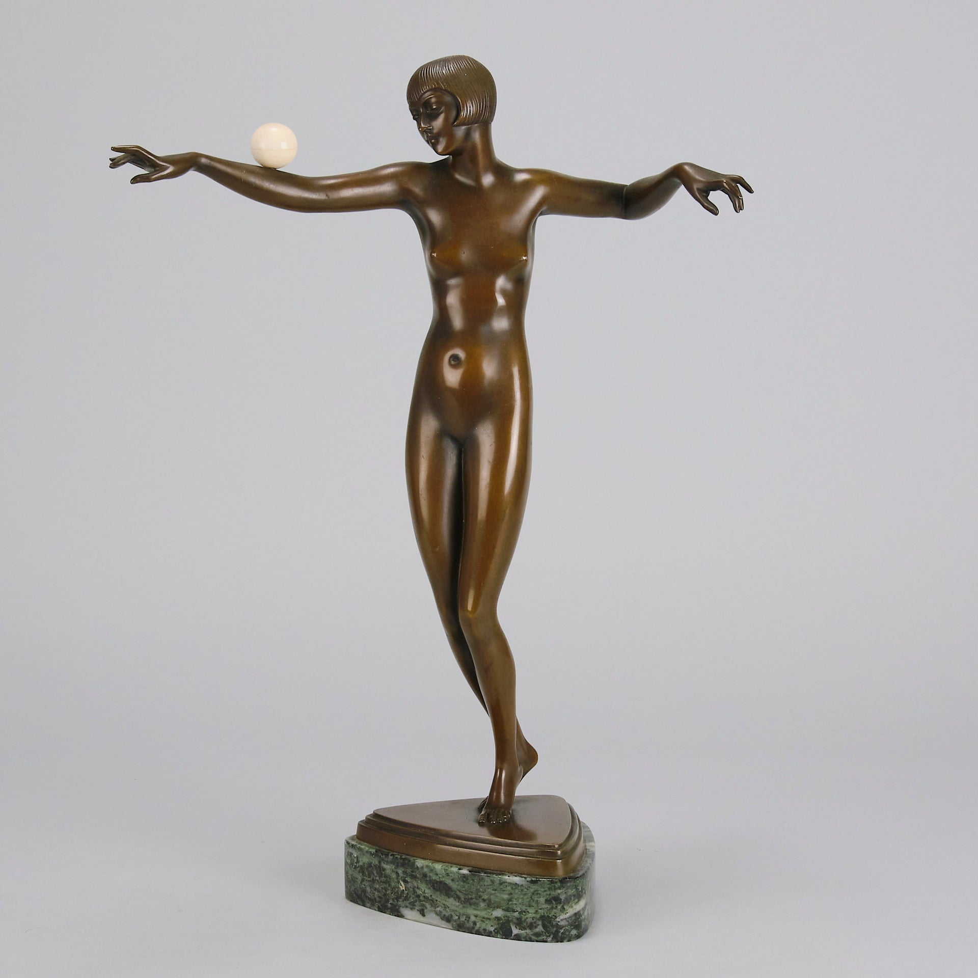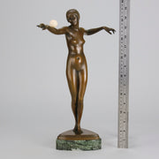An excellent French early 20th Century Art Deco bronze, of a beautiful dancer balancing an ivory ball on her arm. Raised on top of a fitted verde antico marble base signed P.Philippe and with the RuM foundry mark