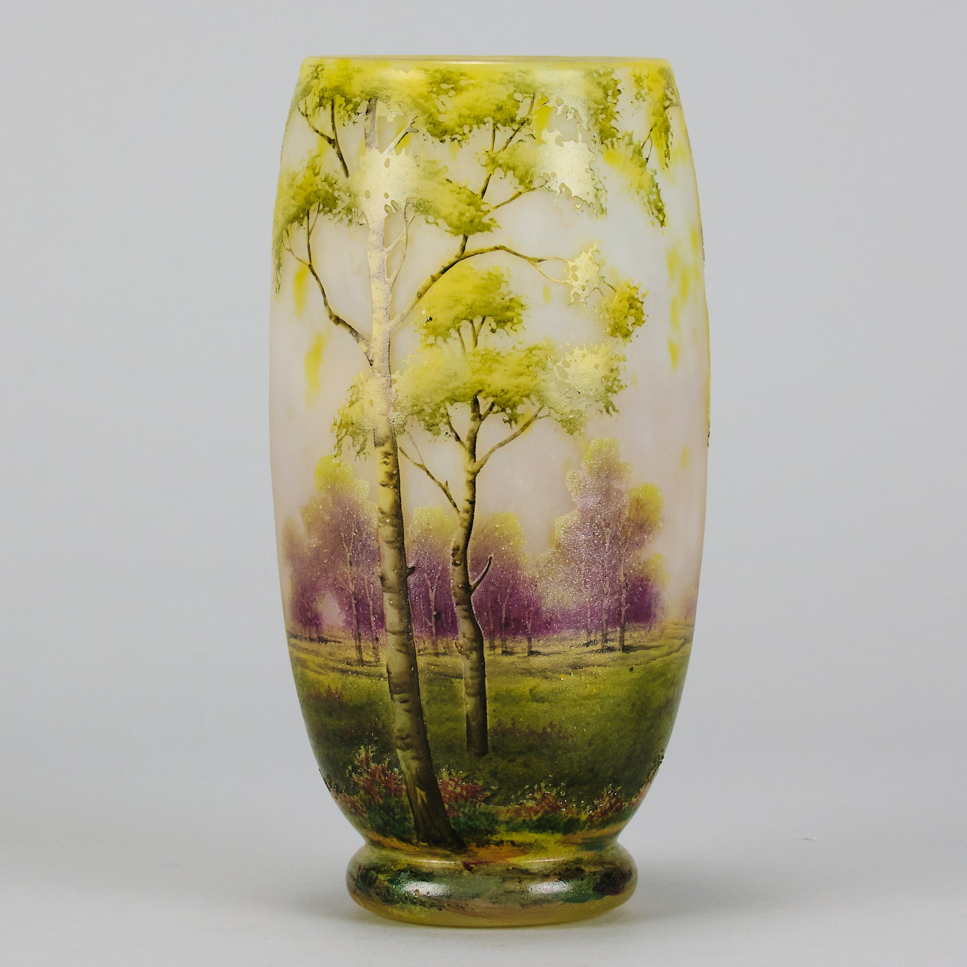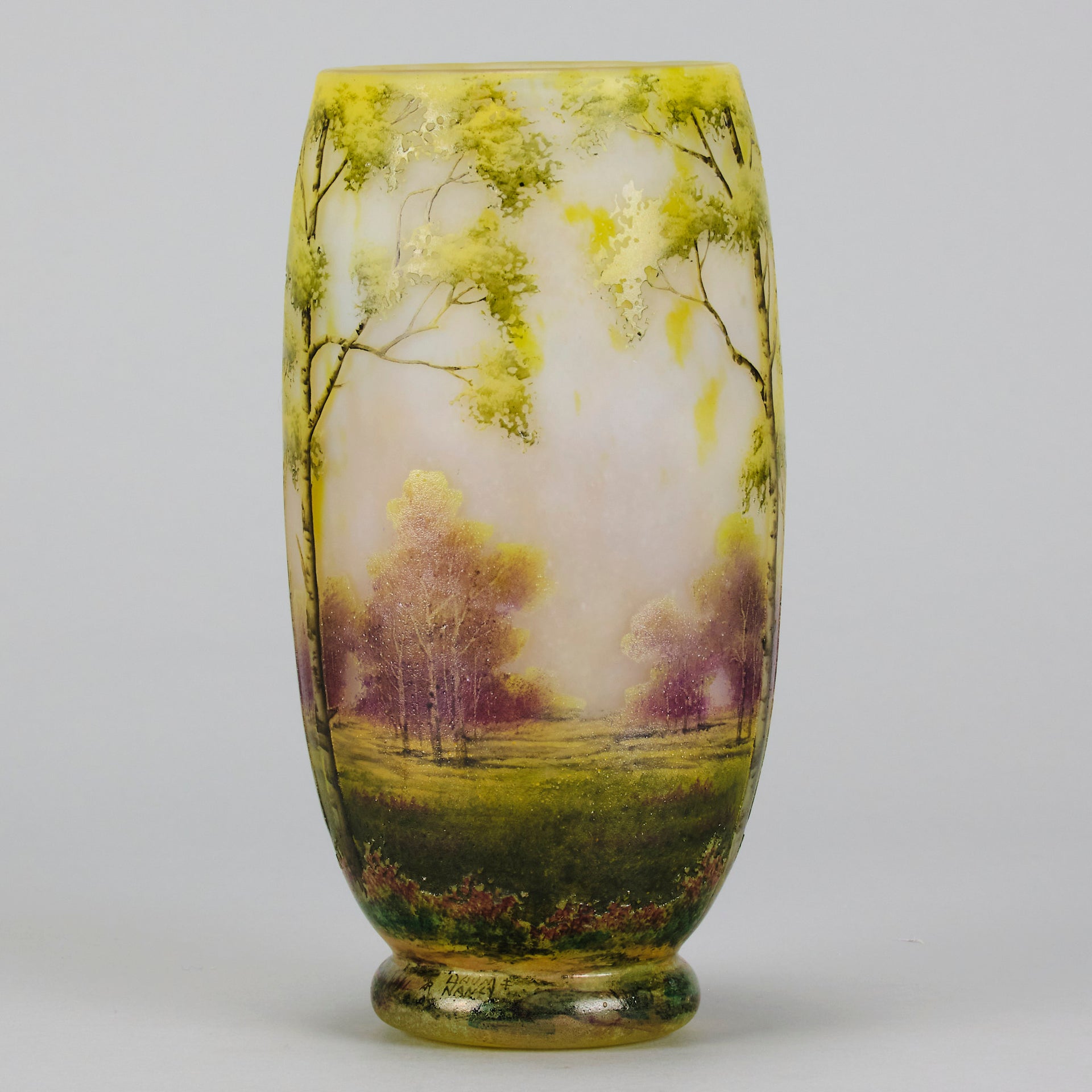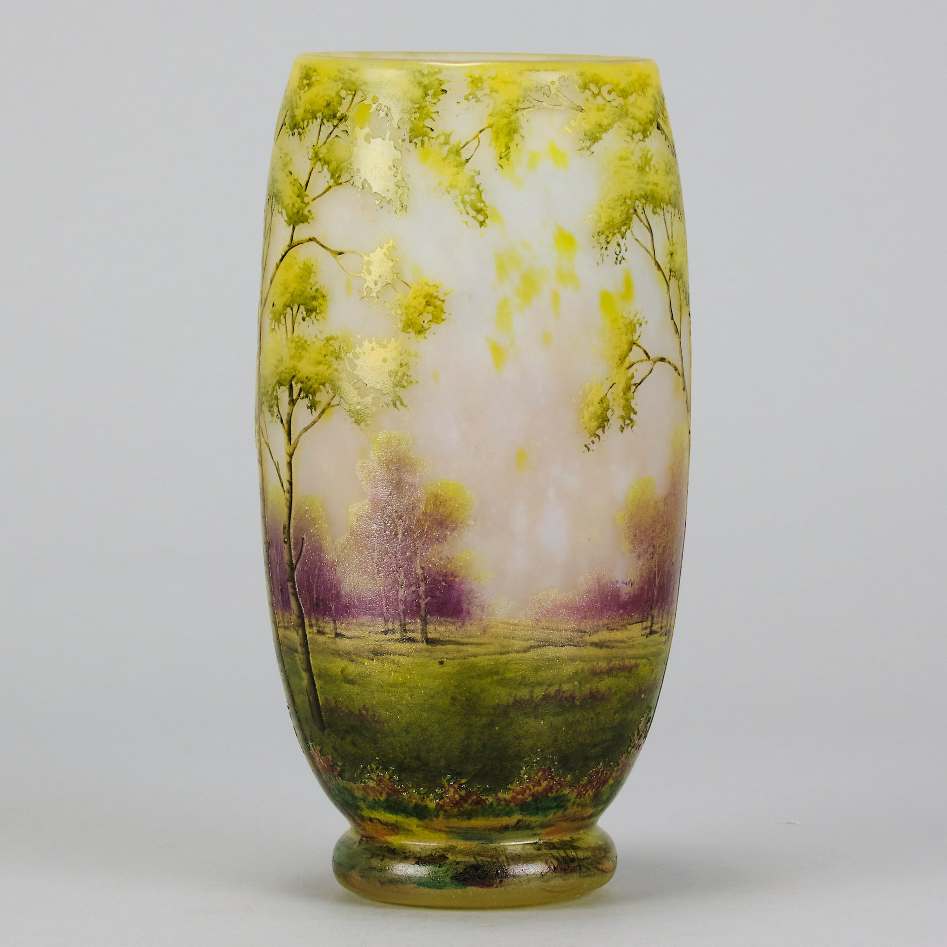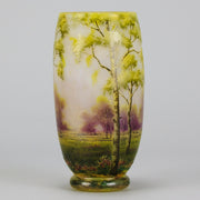 A beautiful early 20th Century cameo glass vase etched and enamelled with a deep summers landscape, the green and burgundy trees hand painted against a light coloured field, signed Daum Nancy and with the Cross of Lorraine.