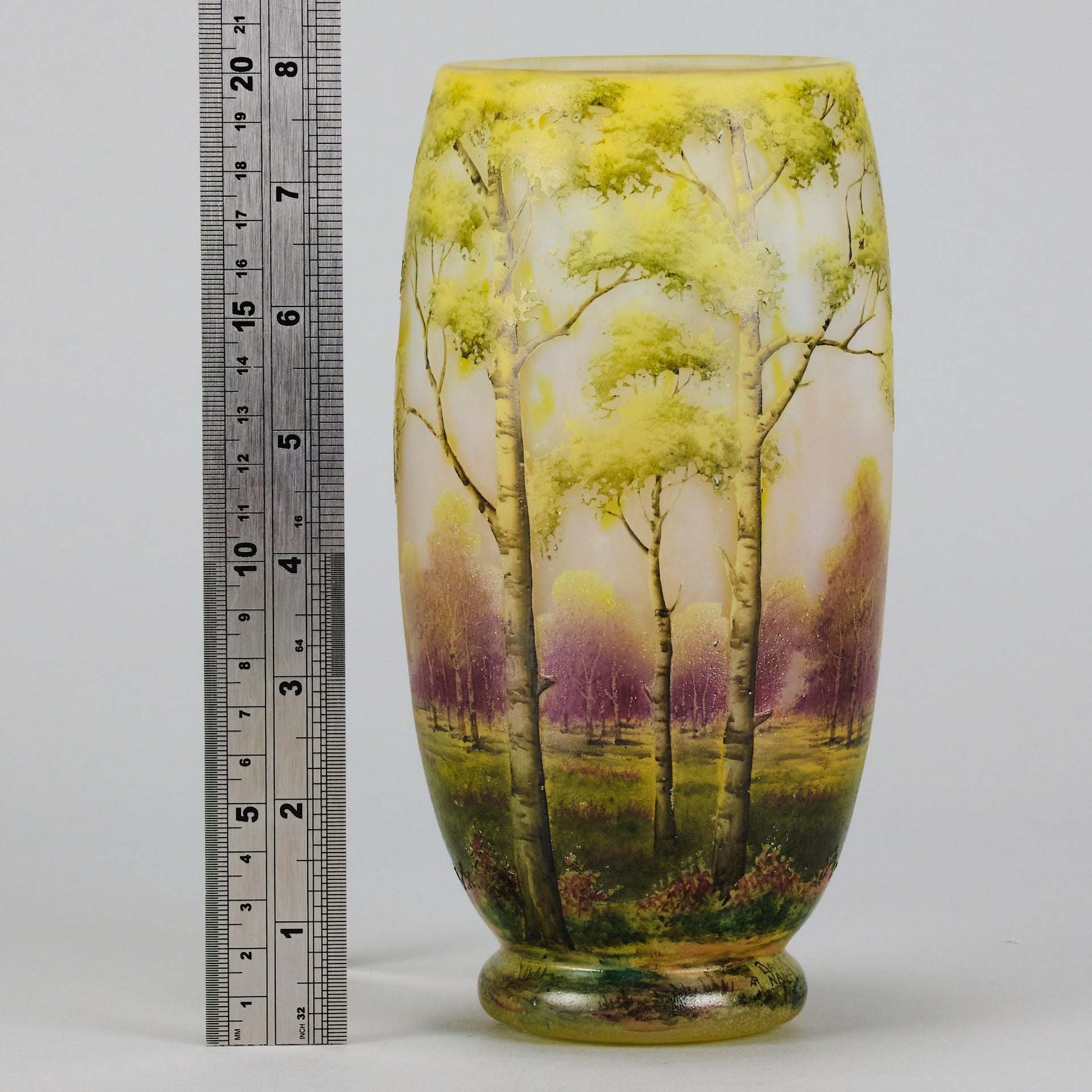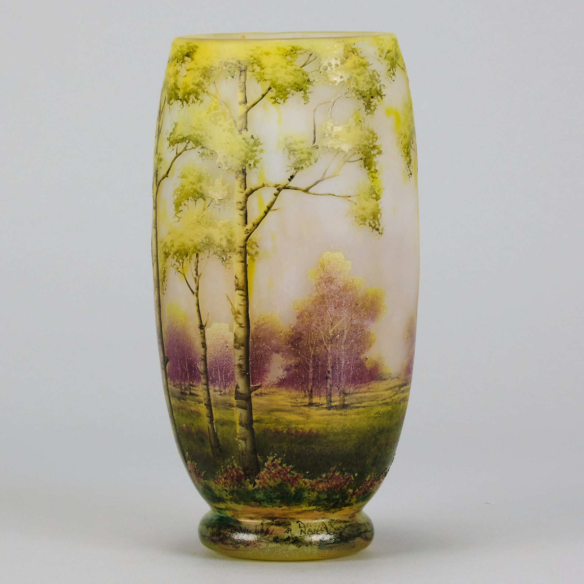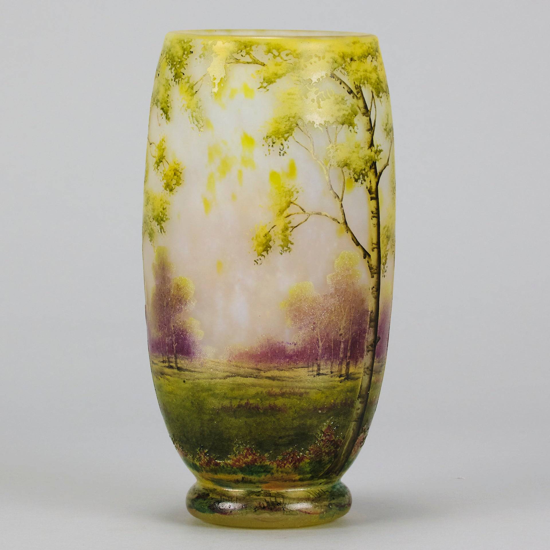 A beautiful early 20th Century cameo glass vase etched and enamelled with a deep summers landscape, the green and burgundy trees hand painted against a light coloured field, signed Daum Nancy and with the Cross of Lorraine.