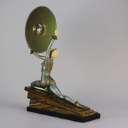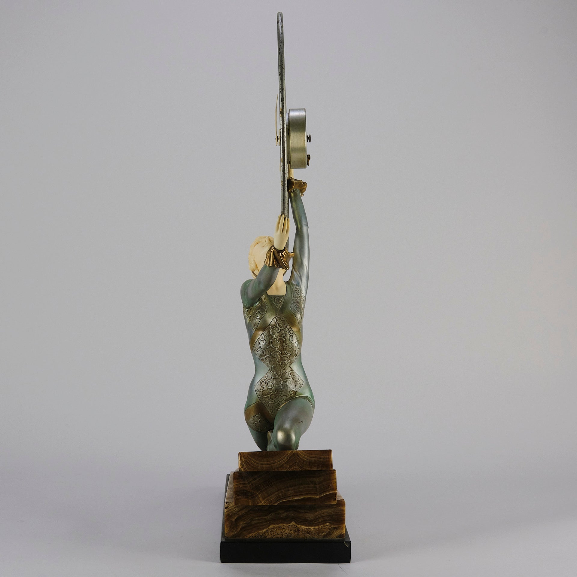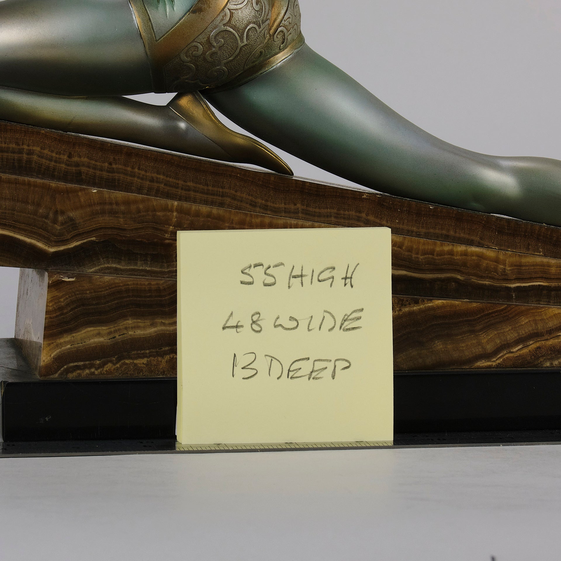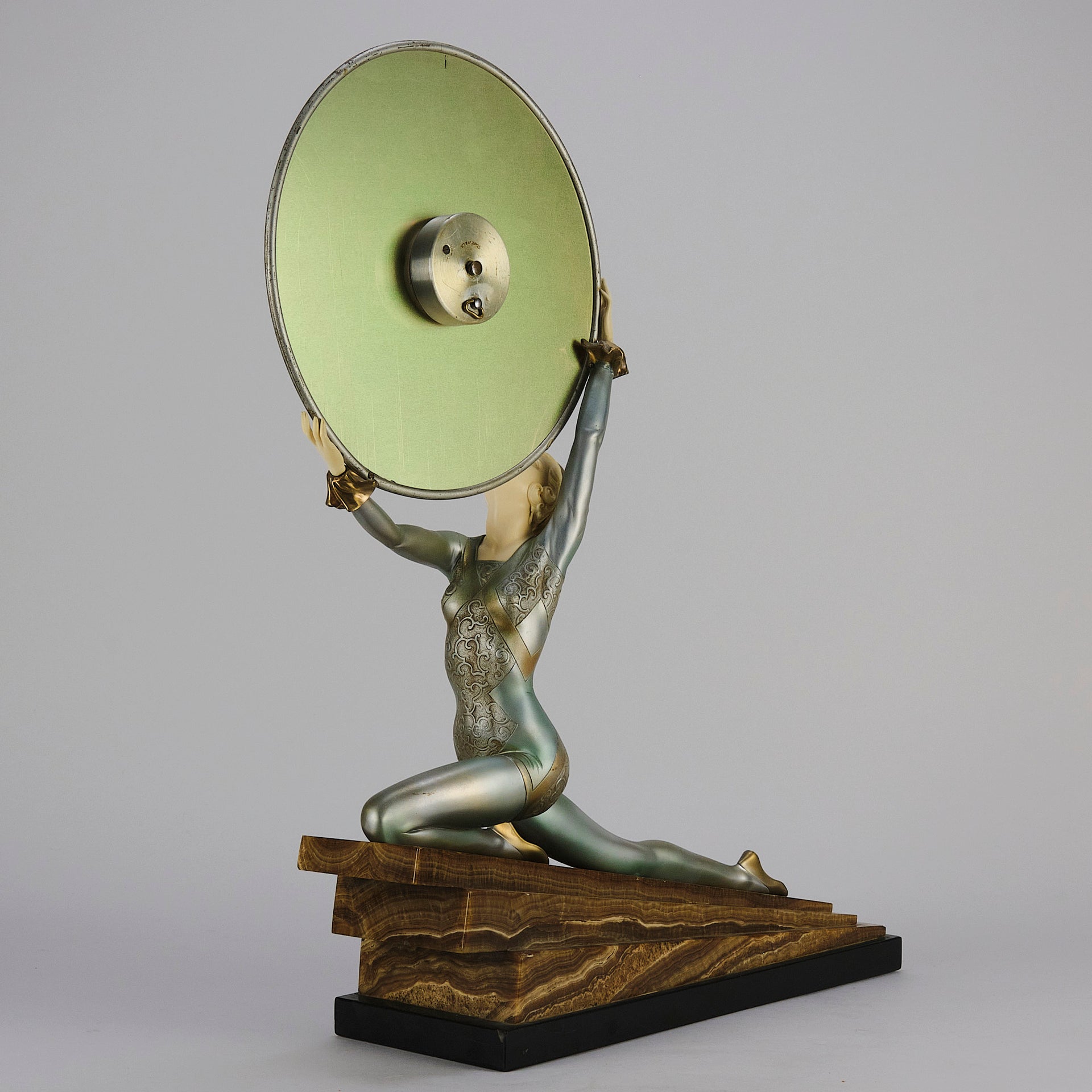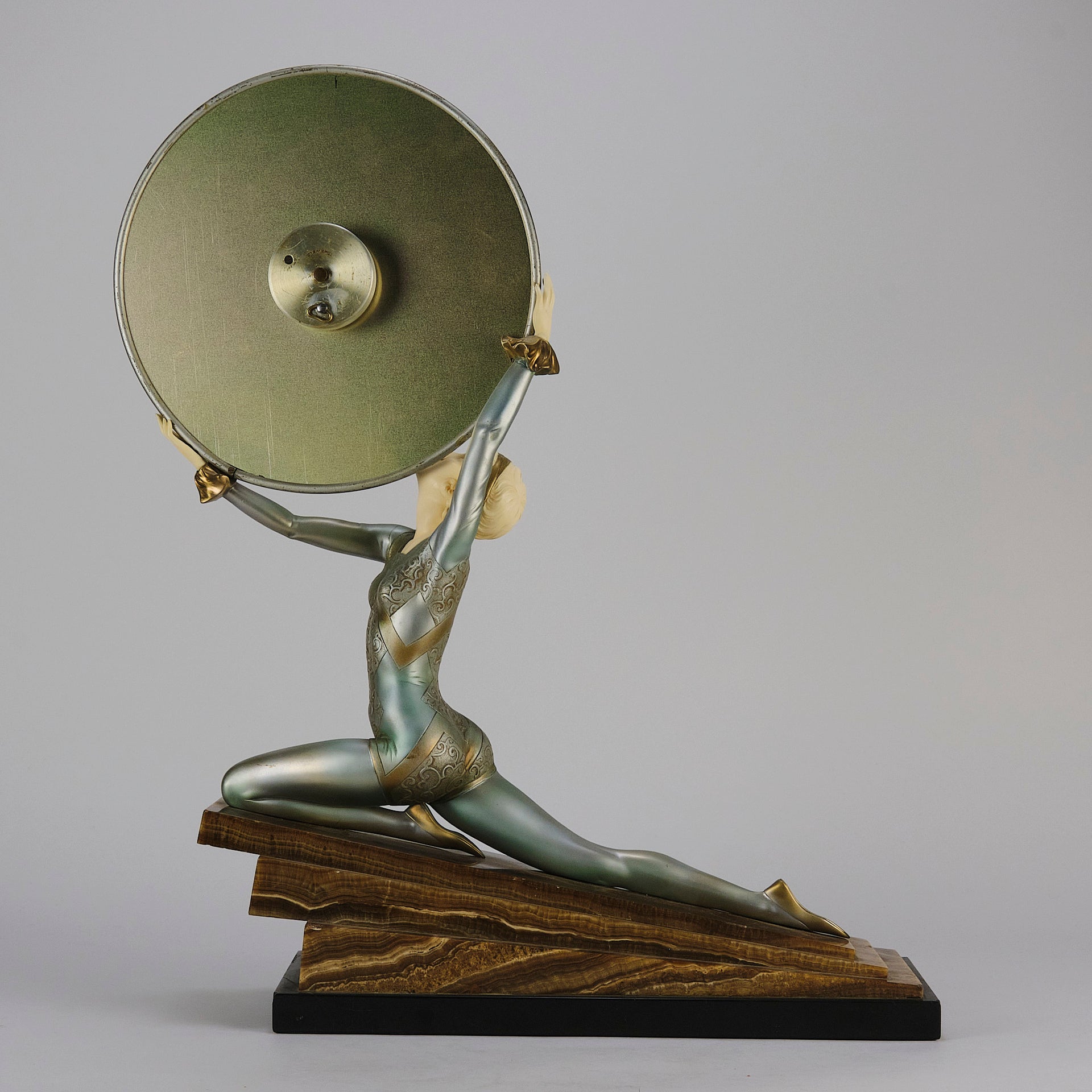 A spectacular early 20th Century Art Deco cold painted bronze and hand carved ivory figure of a beautiful young woman in period attire relaxing on a shaped green onyx and black marble seat, as she enjoys the caressing warmth and tanning rays of the sun high above. The figure with hand carved head, arms and legs and cold painted bronze dress. Raised on a large green onyx and black marble base and signed F Preiss