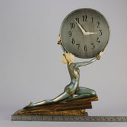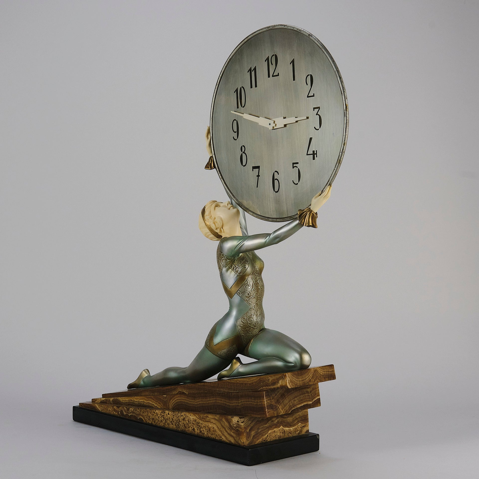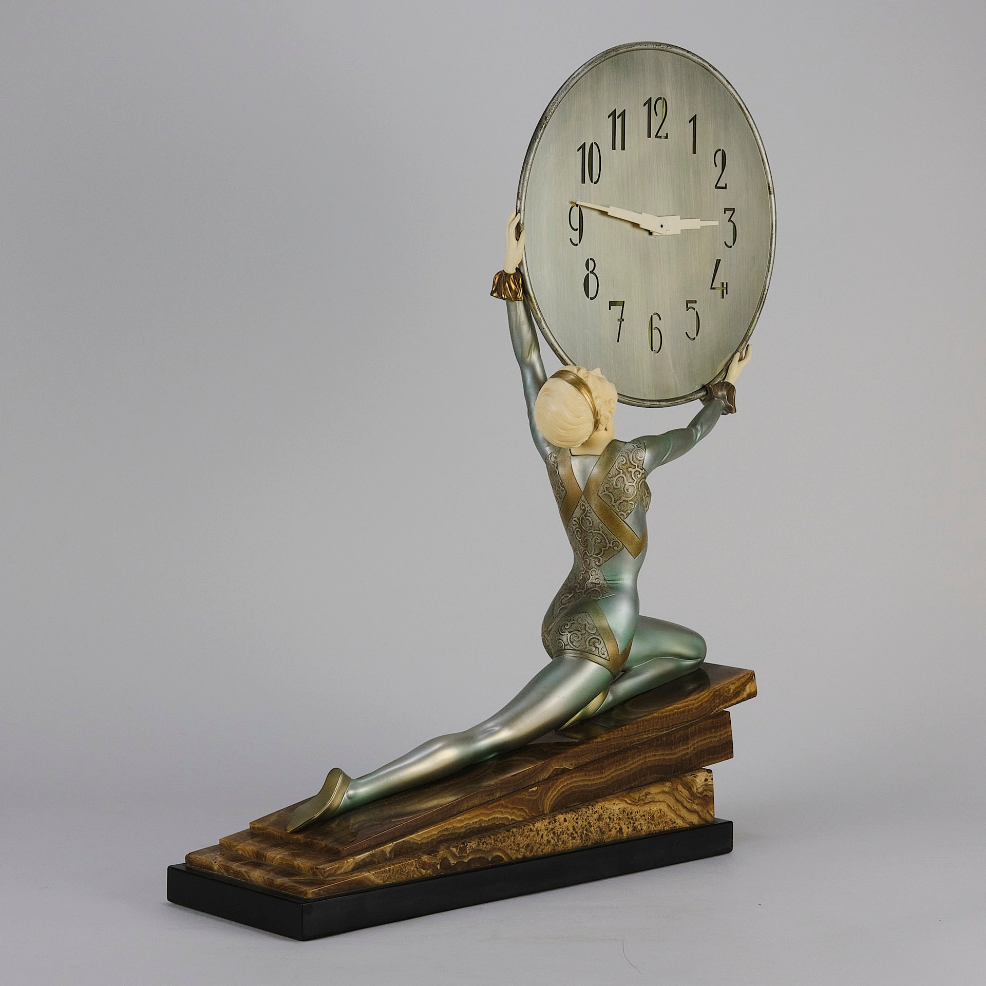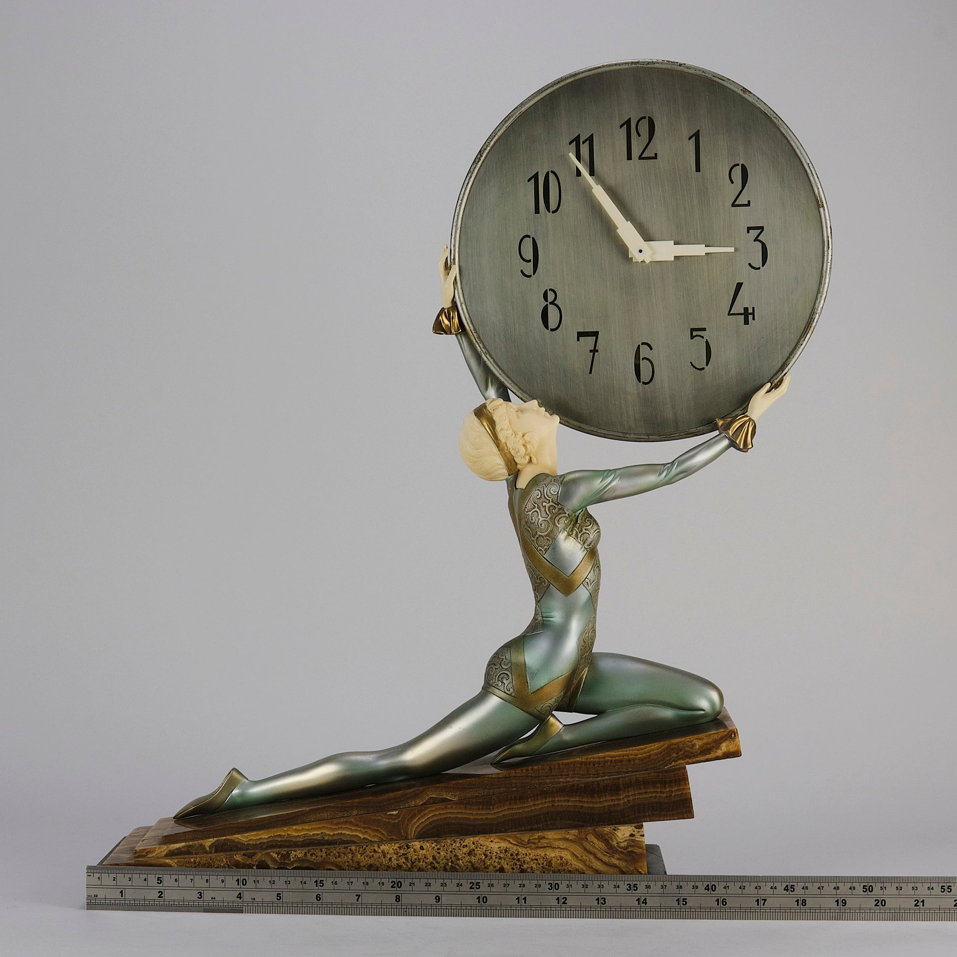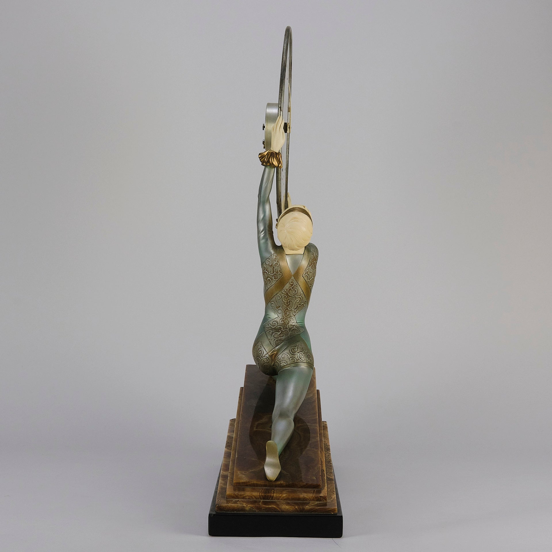 A spectacular early 20th Century Art Deco cold painted bronze and hand carved ivory figure of a beautiful young woman in period attire relaxing on a shaped green onyx and black marble seat, as she enjoys the caressing warmth and tanning rays of the sun high above. The figure with hand carved head, arms and legs and cold painted bronze dress. Raised on a large green onyx and black marble base and signed F Preiss