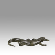A very fascinating and rare late 19th Century French bronze figure of a crocodile with excellent rich autumnal (green, brown, black and orange) patination and fabulous hand finished surface detail, signed Barye and inscribed F Barbedienne