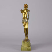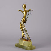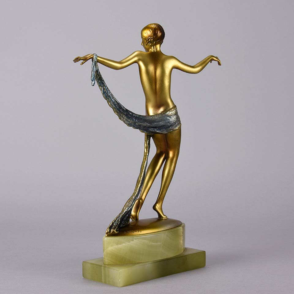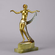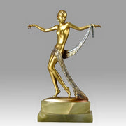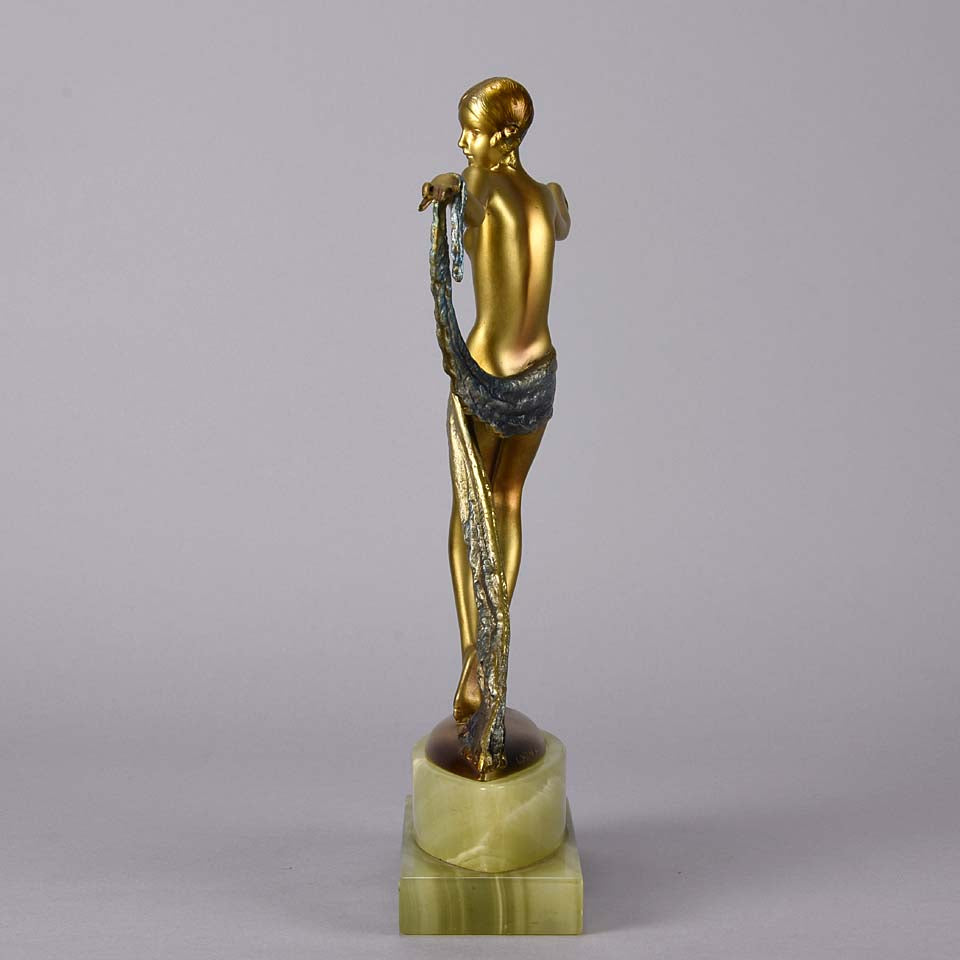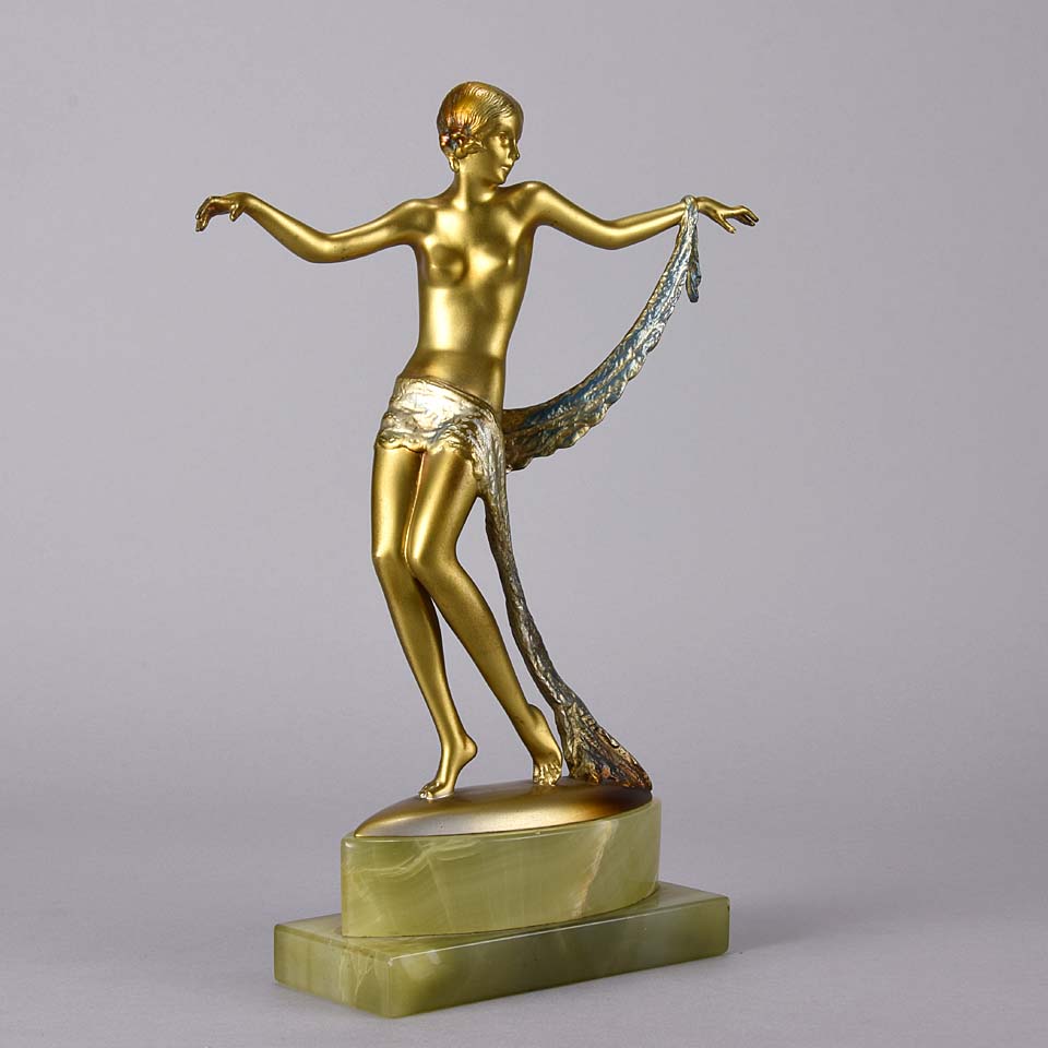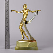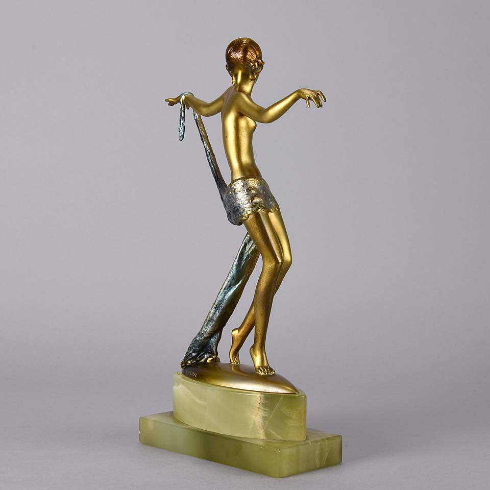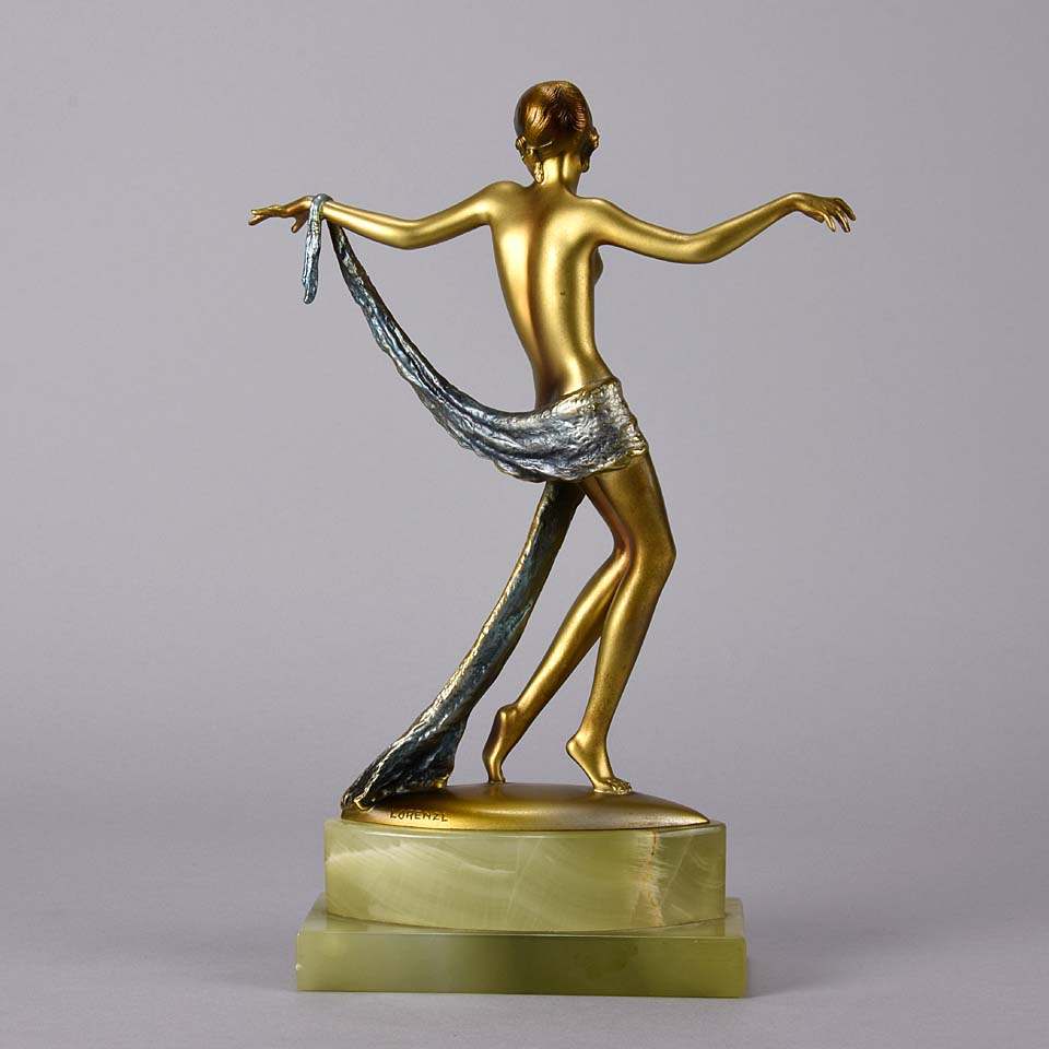 A beautiful Art Deco cold painted bronze figure of an elegant dancer in a striking pose wearing a scarf around midriff exhibiting rich golden colour and excellent hand finished detail, raised on a Brazilian green onyx base and signed Lorenzl