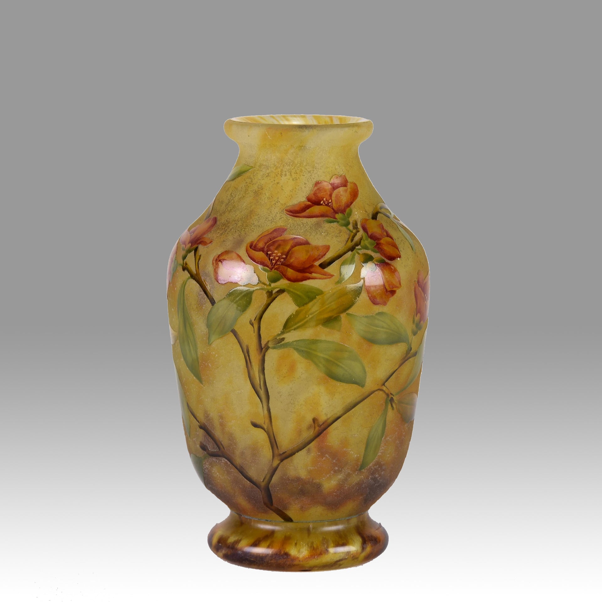 A stunning late 19th Century cameo glass vase etched and enamel painted with beautiful cherry blossom red flowers against a wam yellow field, exhibiting excellent surface detail and eyecatching colour, signed Daum Nancy and with Cross of Lorraine.