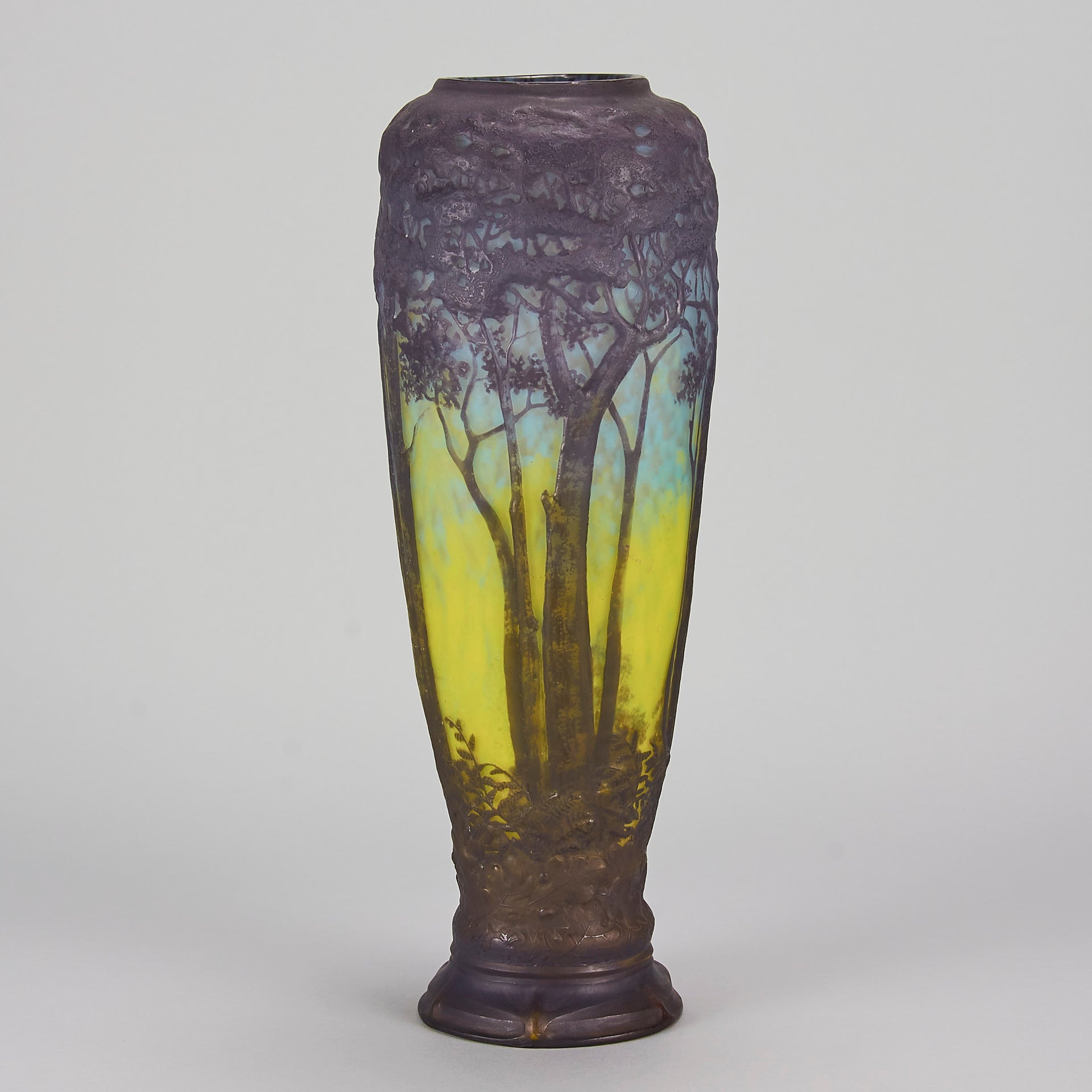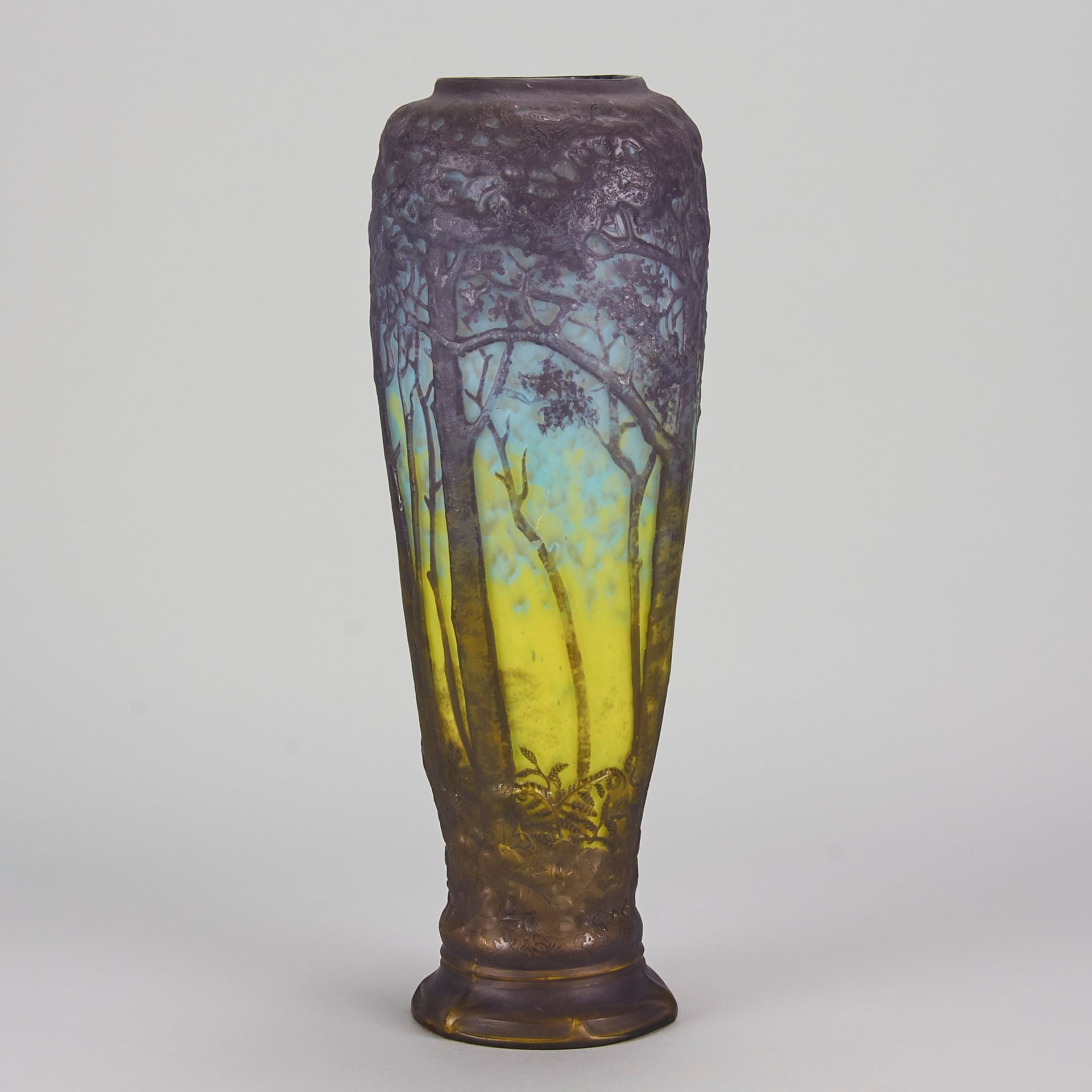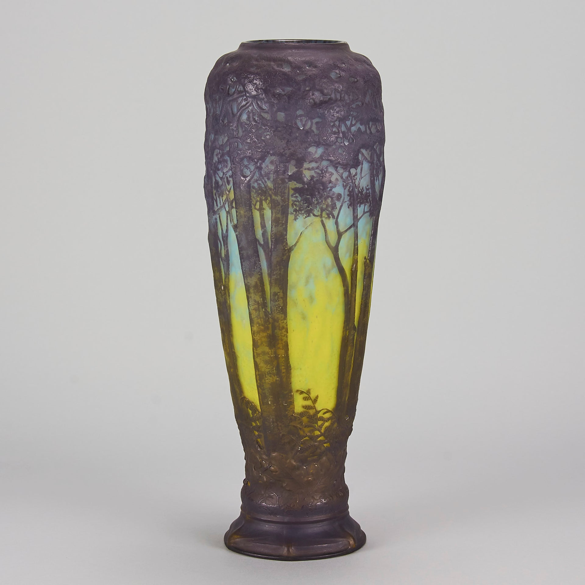 Magnificent mould blown cameo glass vase etched and acid cut with deep purple trees in a forest landscape against a mottled sky blue and yellow background. Signed Daum Nancy to base and with the Cross of Lorraine