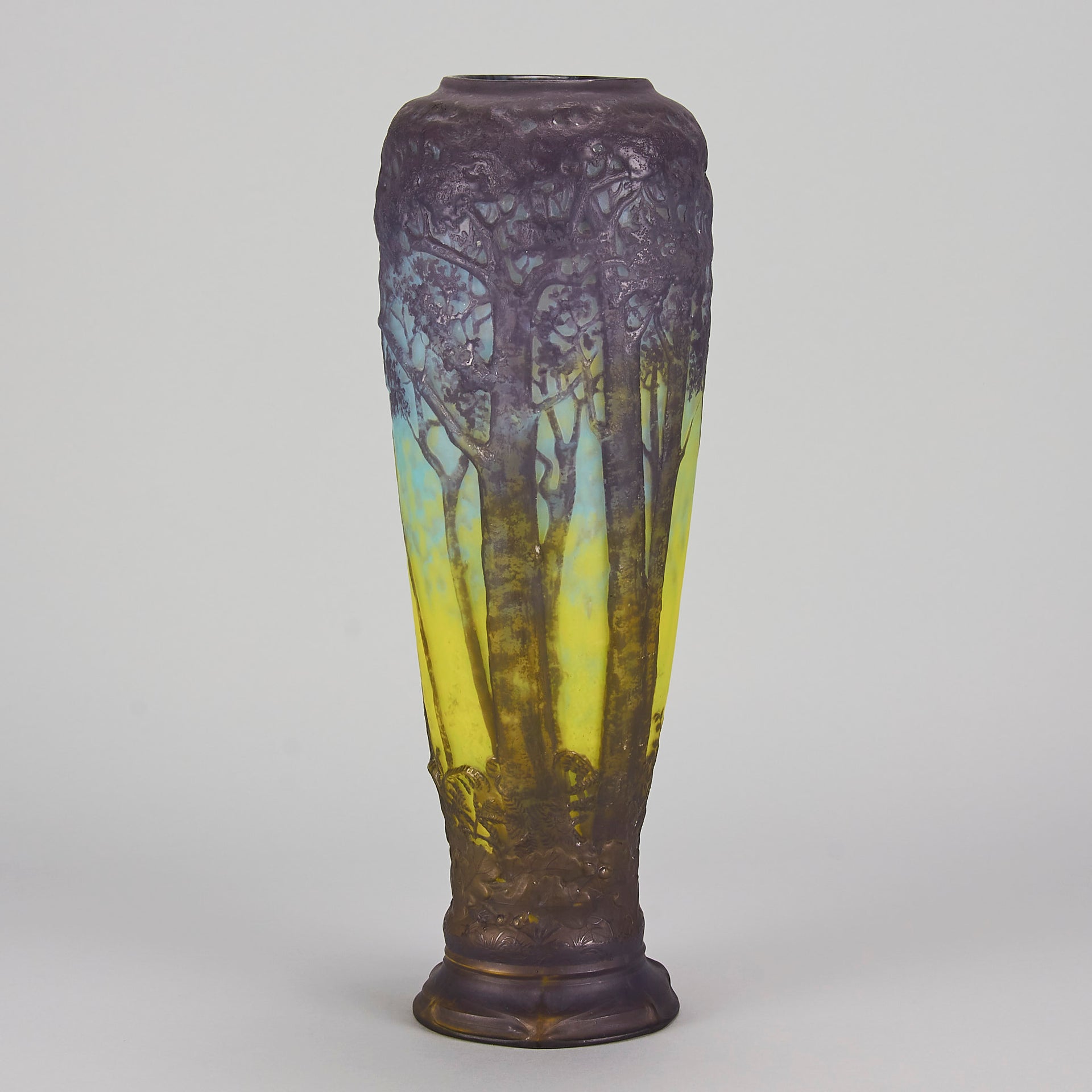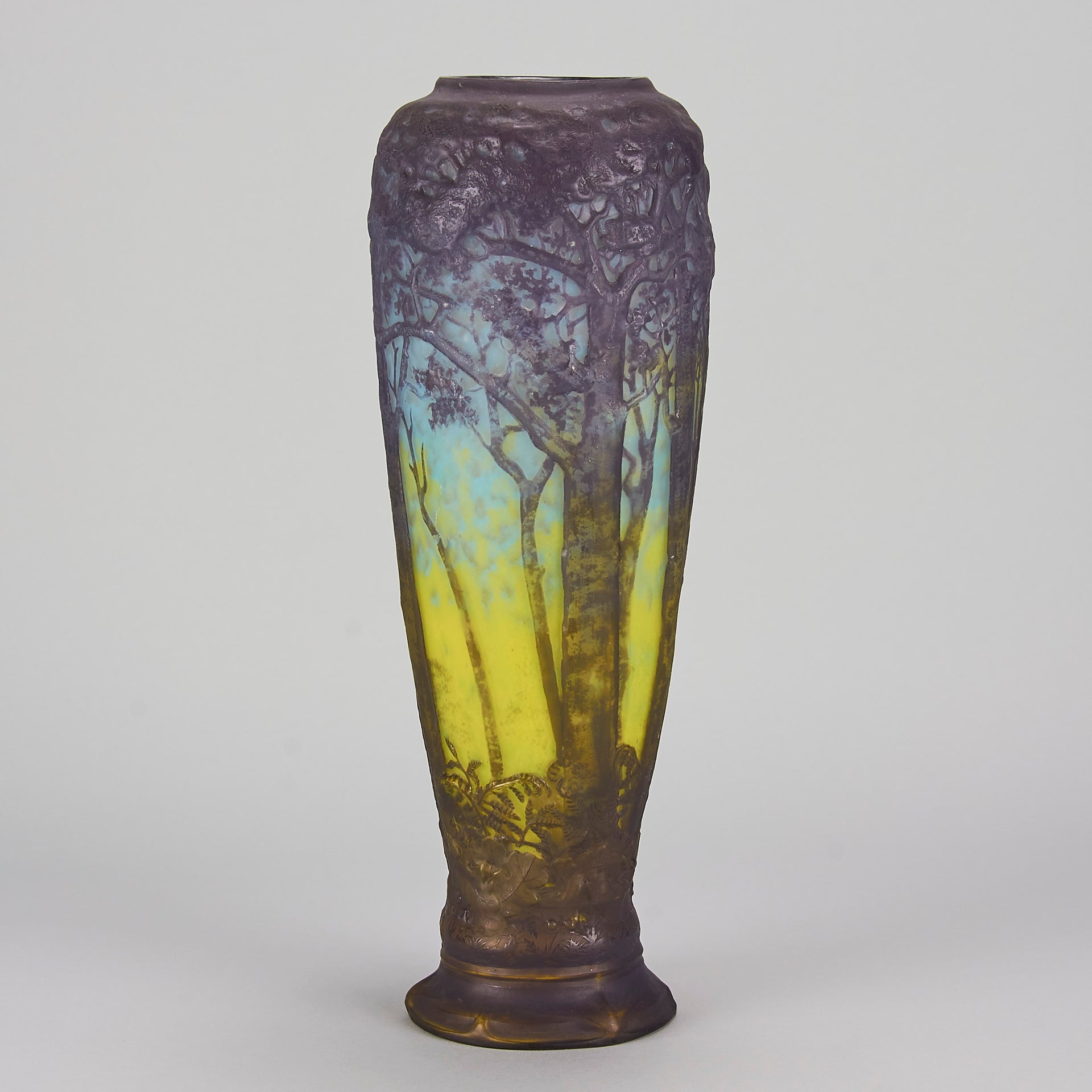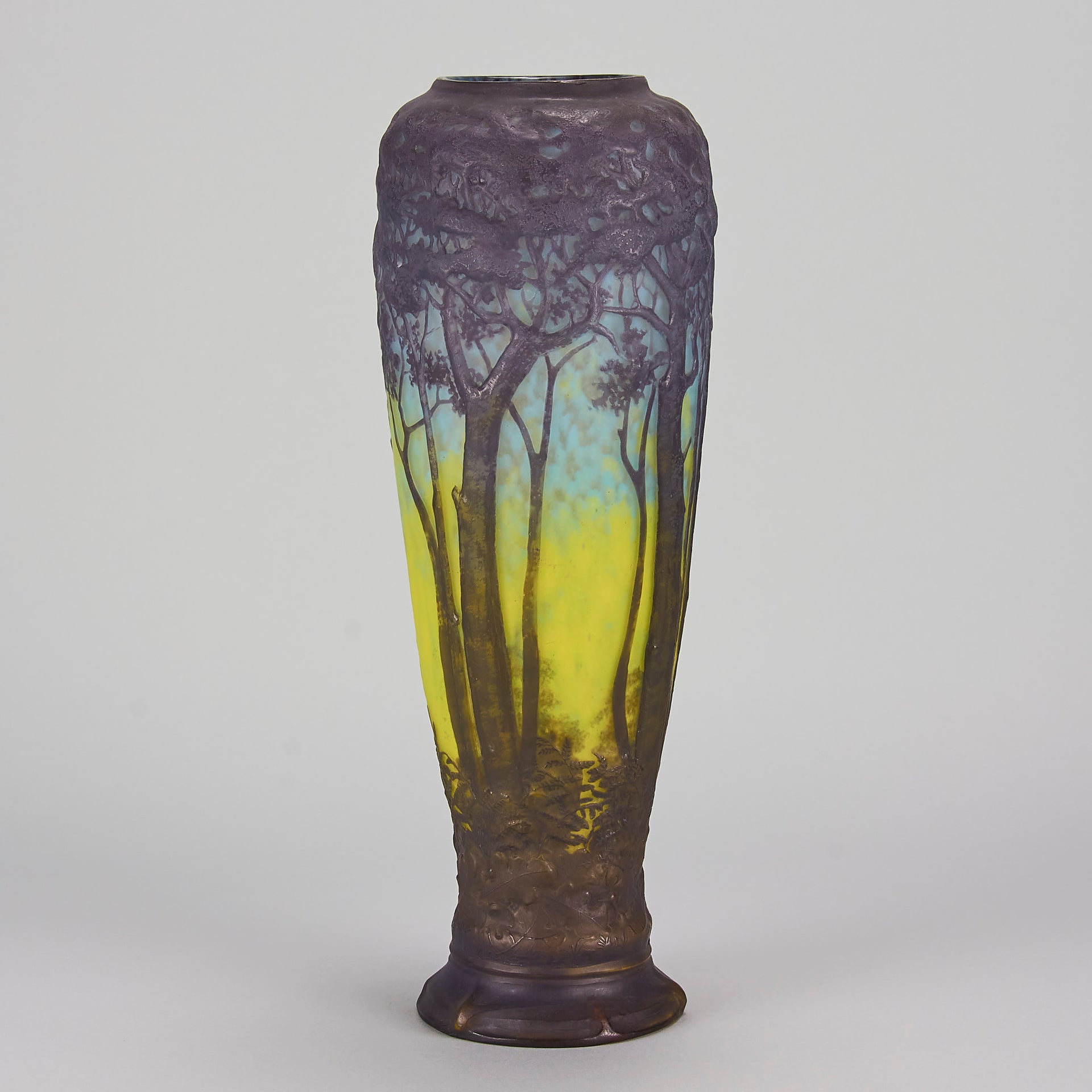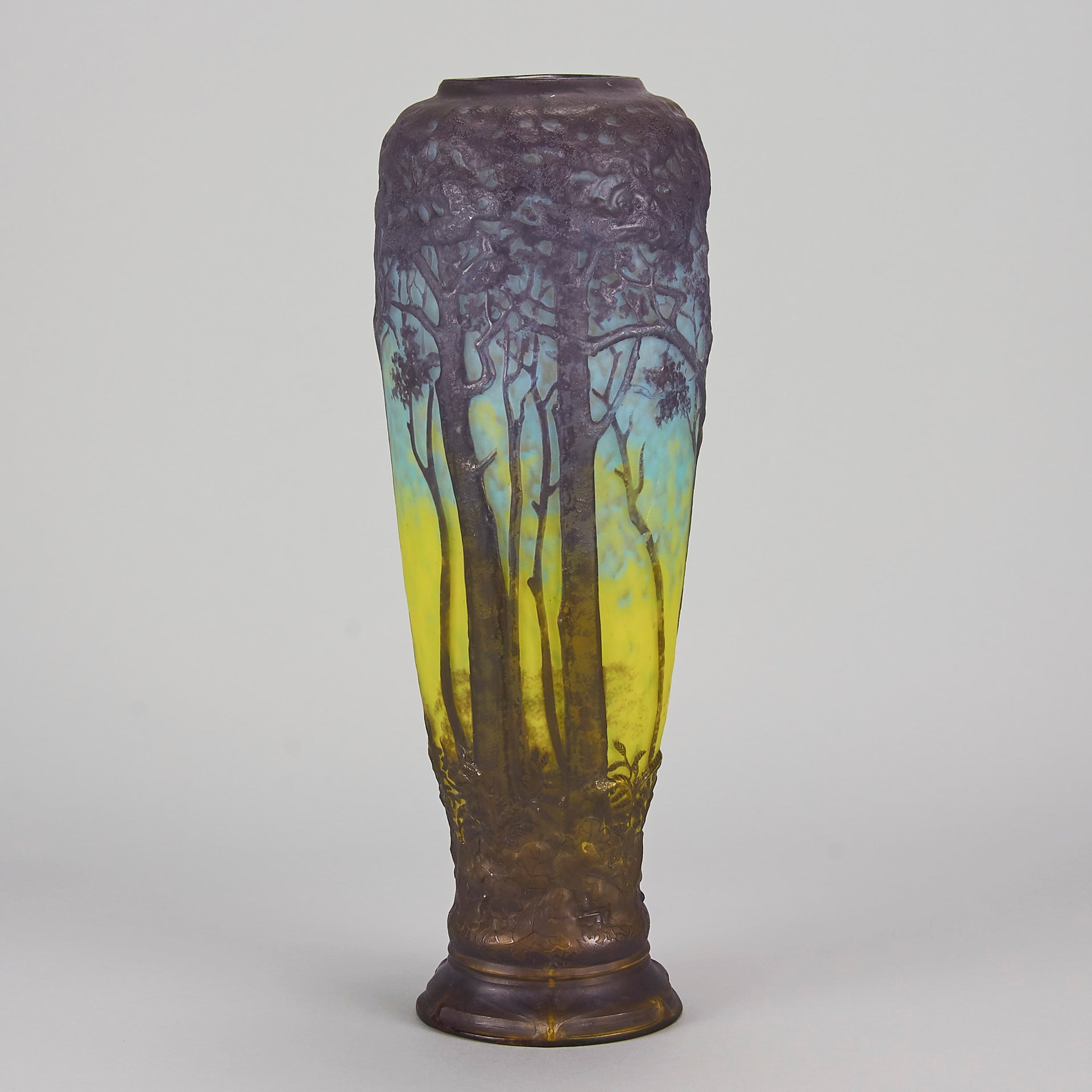 Magnificent mould blown cameo glass vase etched and acid cut with deep purple trees in a forest landscape against a mottled sky blue and yellow background. Signed Daum Nancy to base and with the Cross of Lorraine
