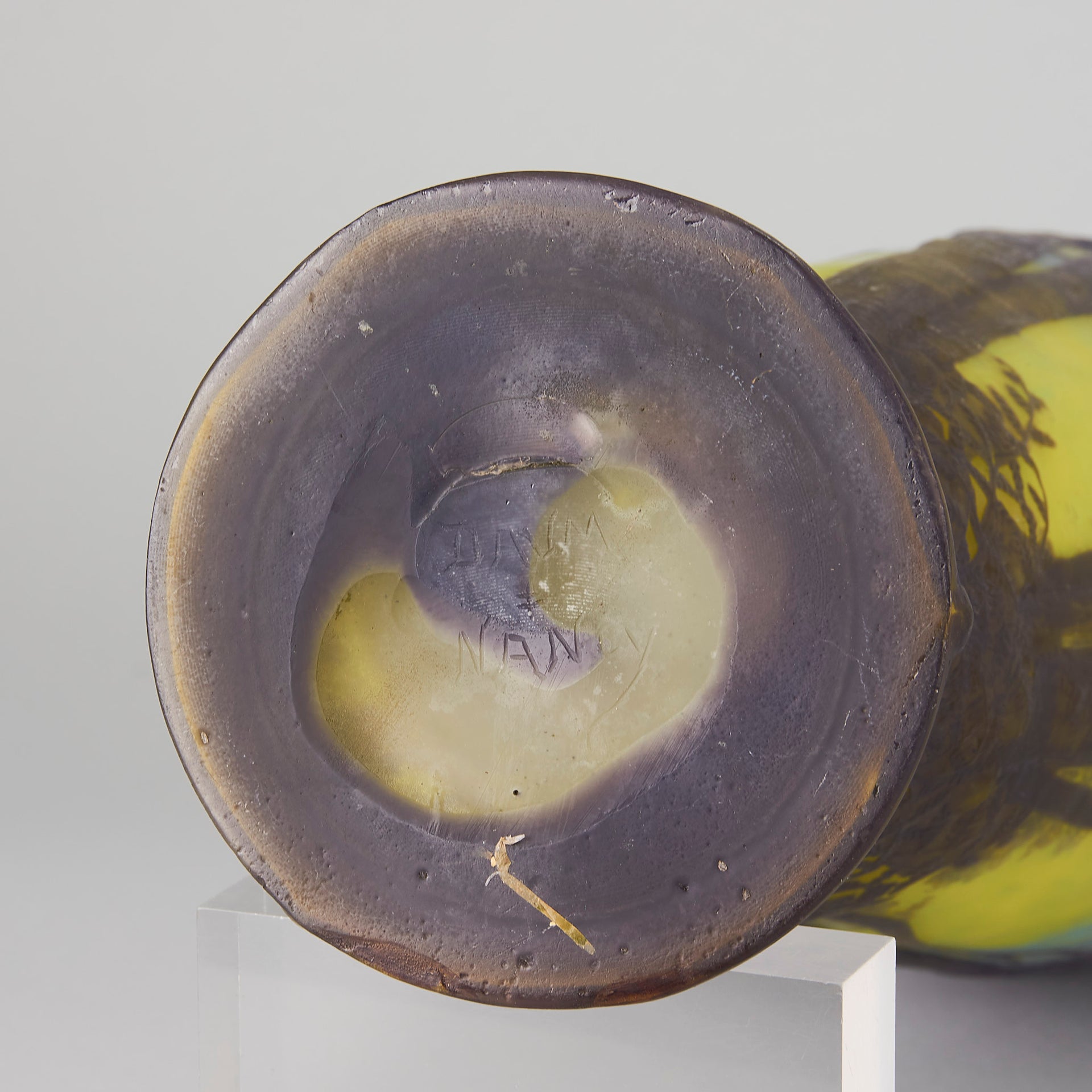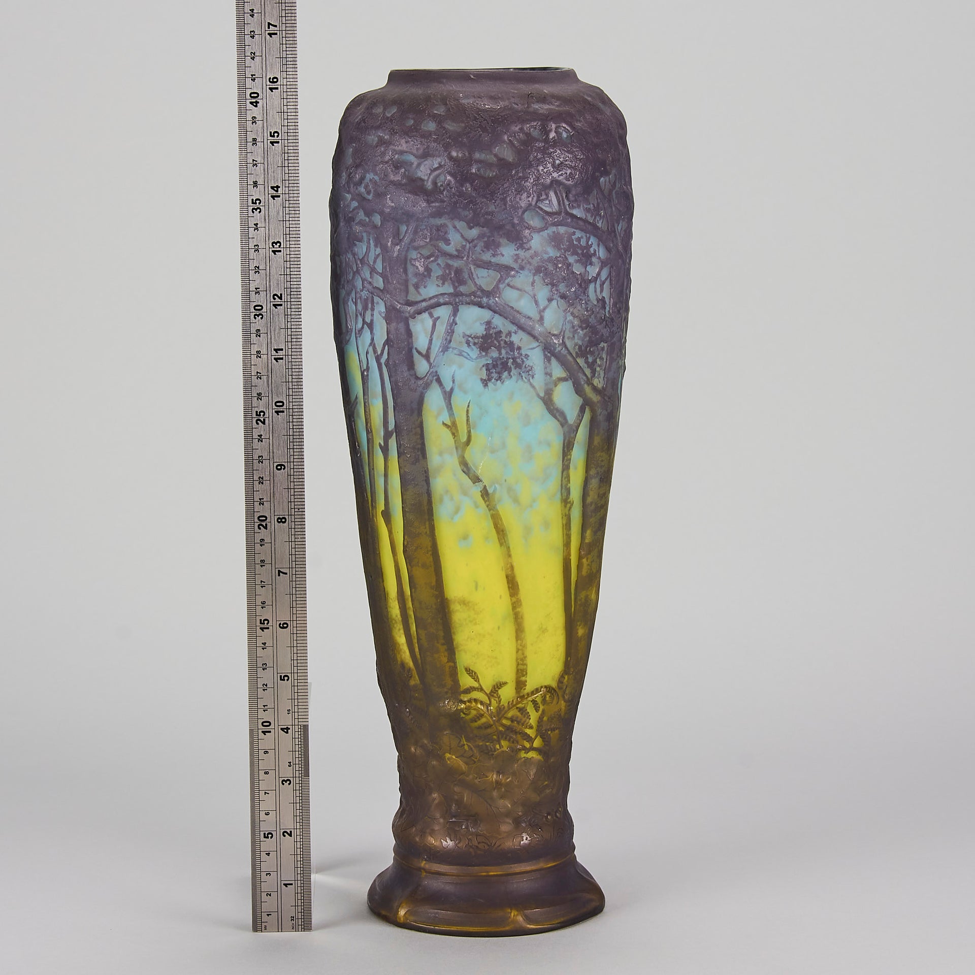 Daum’s unique technique common to all was that a clear vessel was blown with colour only on the inner surface or layer. An acid resist landscape was painted free-hand onto the vessel which was then etched by plunging into a hydrofluoric acid bath. The outer surface was then polished which gave the trees a ‘third dimension’ as the onlooker can see through the clear glass to the inner colour. Then the background was frosted, tricking the eye into thinking it is seeing coloured glass.