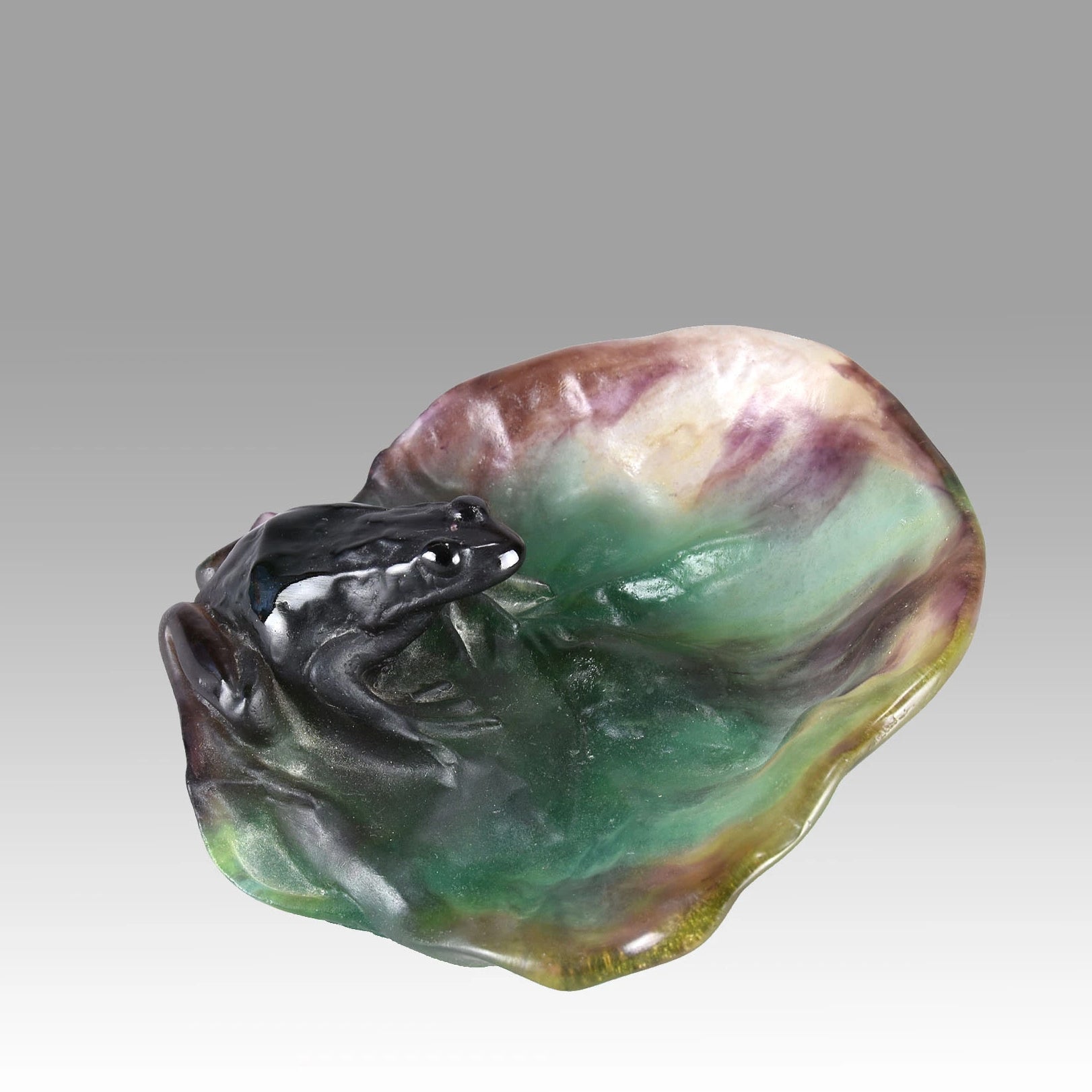 A highly impressive mid 20th Century French Pate-de-Verre study of a seated frog on a lily pad with eye catching colour and good tactile surface detail, signed Daum France