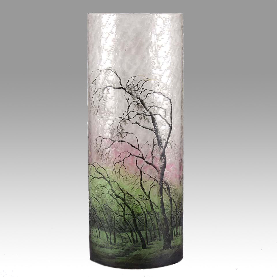 Museum quality large and very rare cameo glass vase etched and enamelled with a fabulous landscape of silver birch trees blown in the wind and the rain, exhibiting excellent colours of deep pink and greens and very fine surface detail, signed Daum Nancy and with Cross of Lorraine.