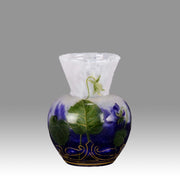 A very pretty late 19th Century cameo glass vase of bulbous form etched and enamel painted with deep purple flowers against a white field highlighted with gilding, exhibiting excellent surface detail and colour, signed Daum Nancy and with Cross of Lorraine.