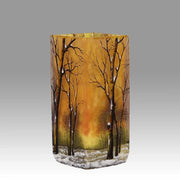 Daum’s unique technique common to all was that a clear vessel was blown with colour only on the inner surface or layer. An acid resist landscape was painted free-hand onto the vessel which was then etched by plunging into a hydrofluoric acid bath. The outer surface was then polished which gave the trees a ‘third dimension’ as the onlooker can see through the clear glass to the inner colour. Then the background was frosted, tricking the eye into thinking it is seeing coloured glass.