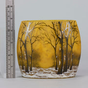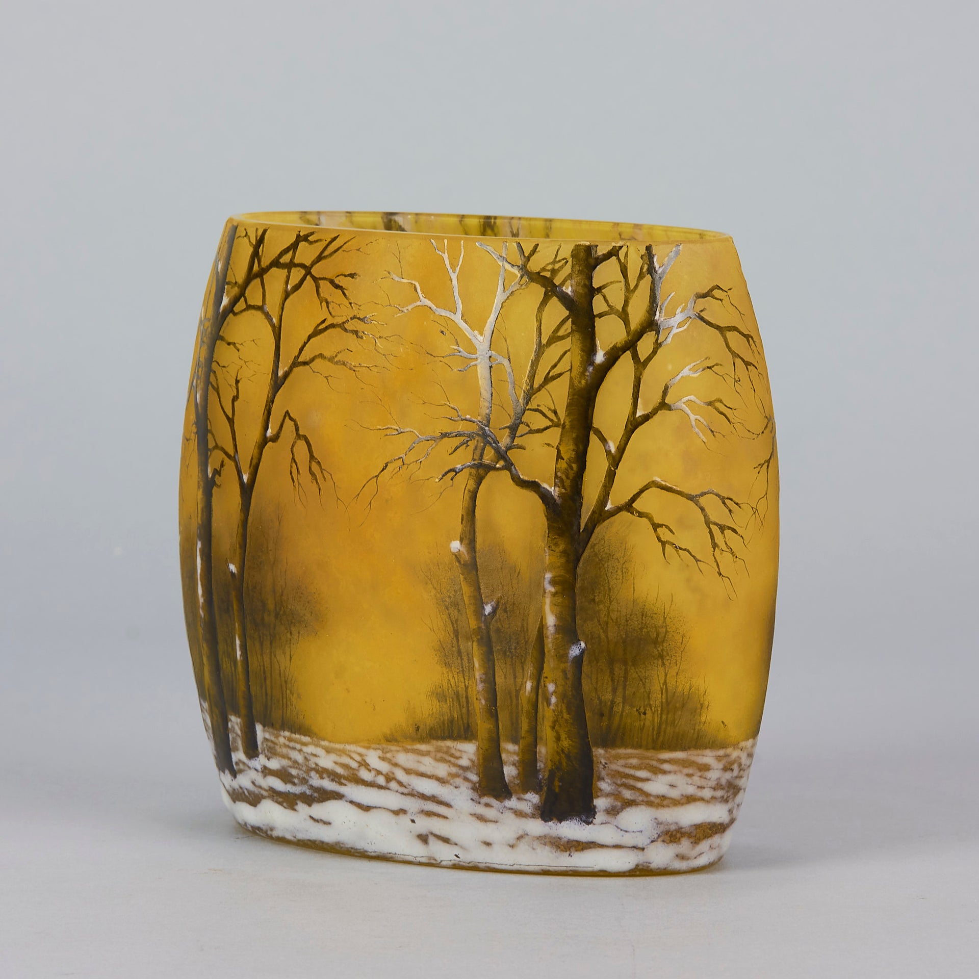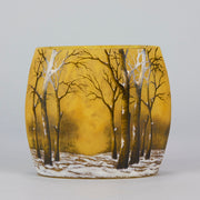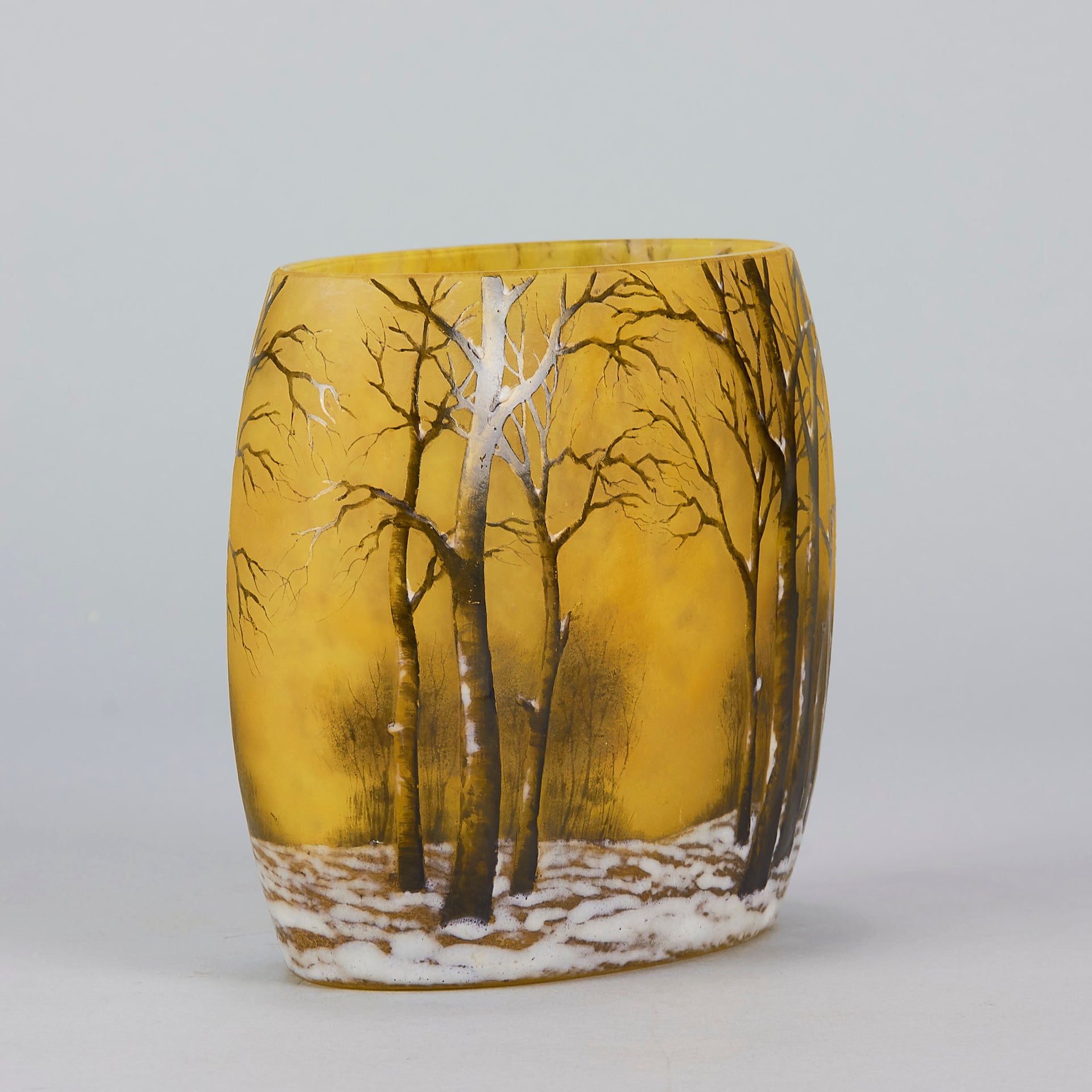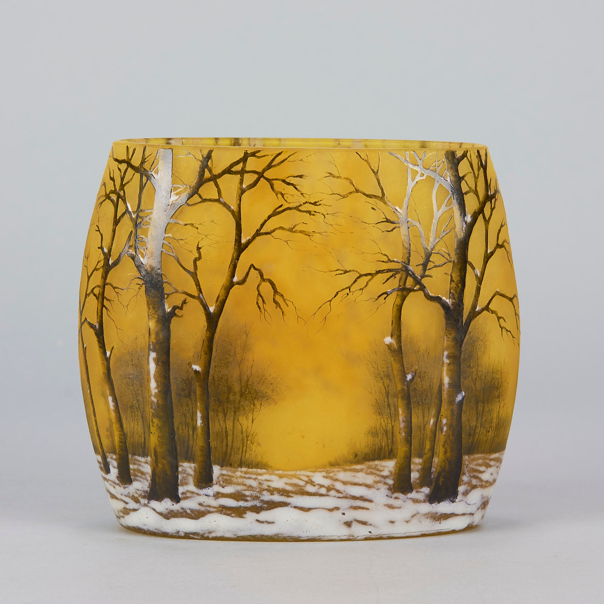 Wonderful pillow shaped cameo glass vase etched and enamelled with trees in a winter woodland landscape with highlights of snow to the ground and the trees , the vase exhibiting beautiful orange and yellow colours adding depth and artistic realism, signed Daum Nancy and with the Cross of Lorraine to bottom of base