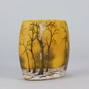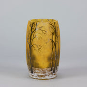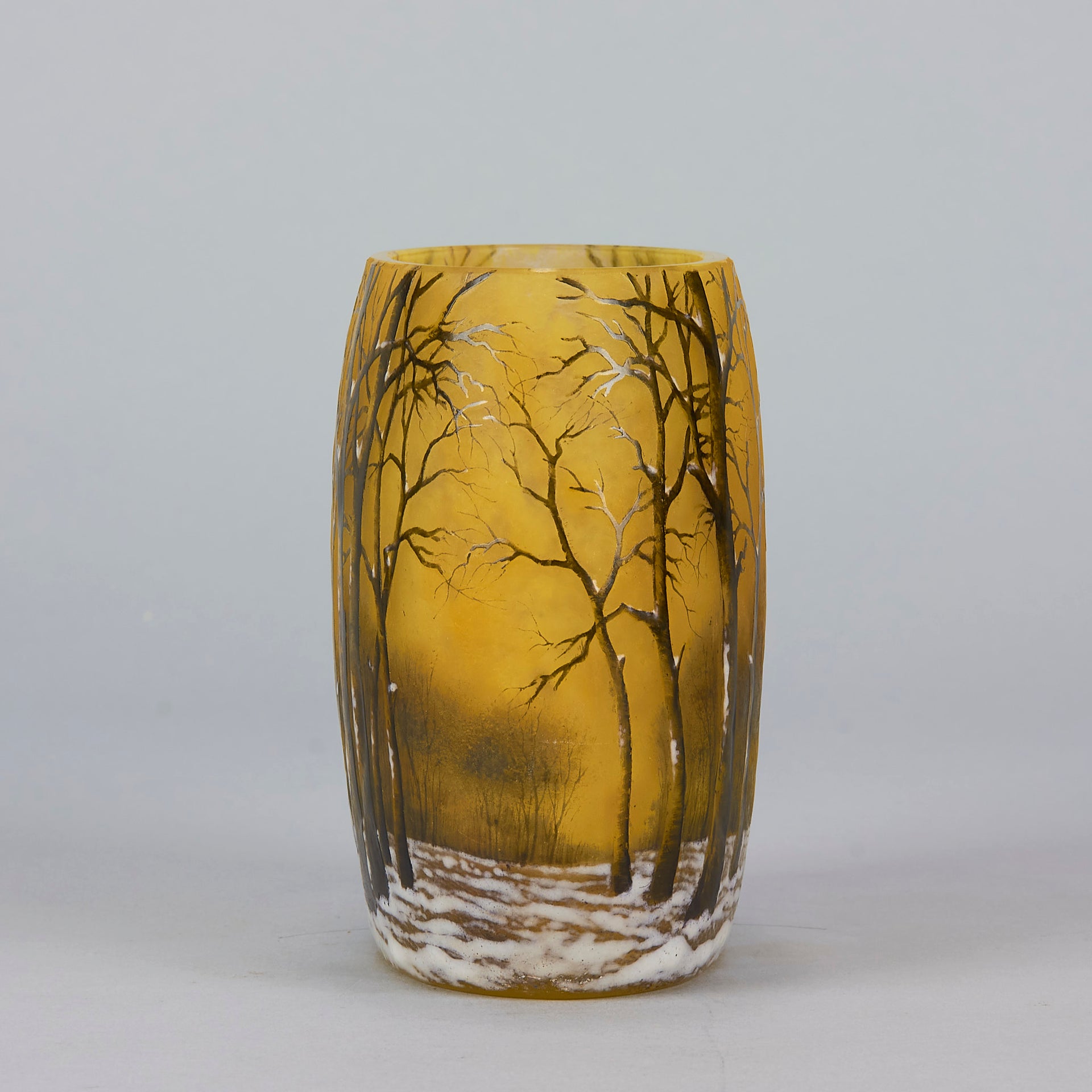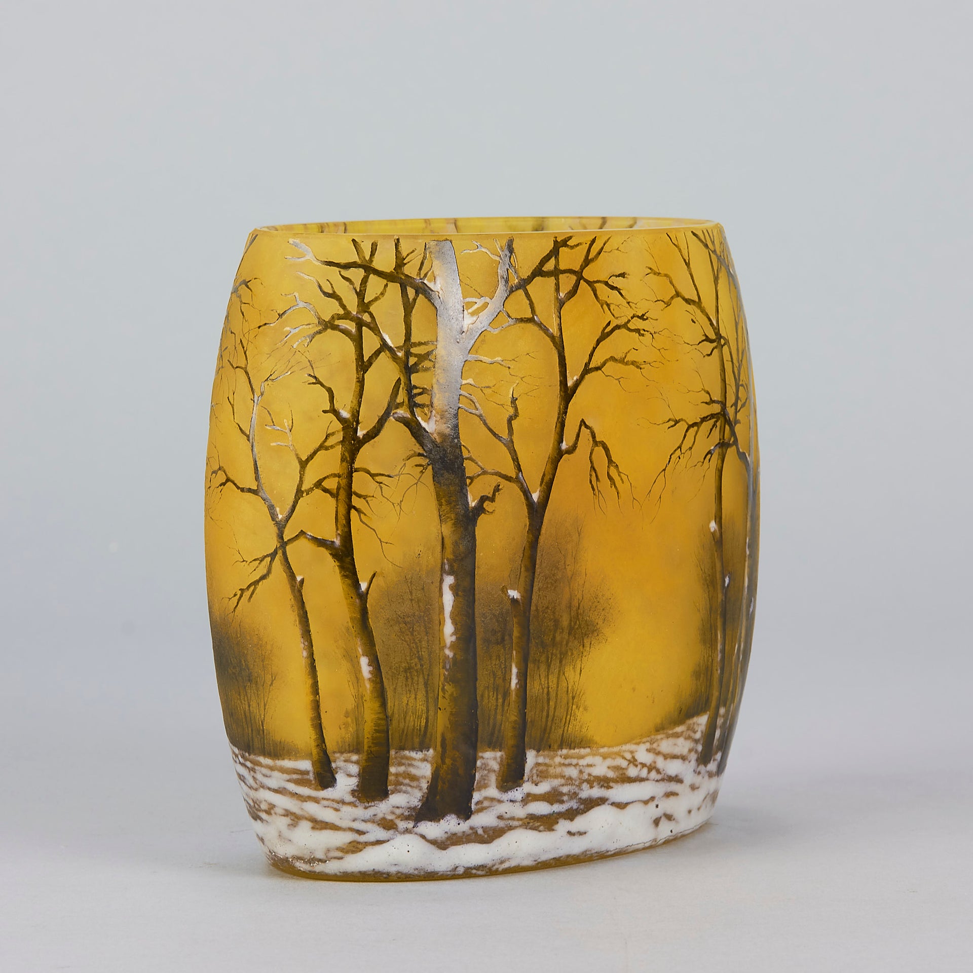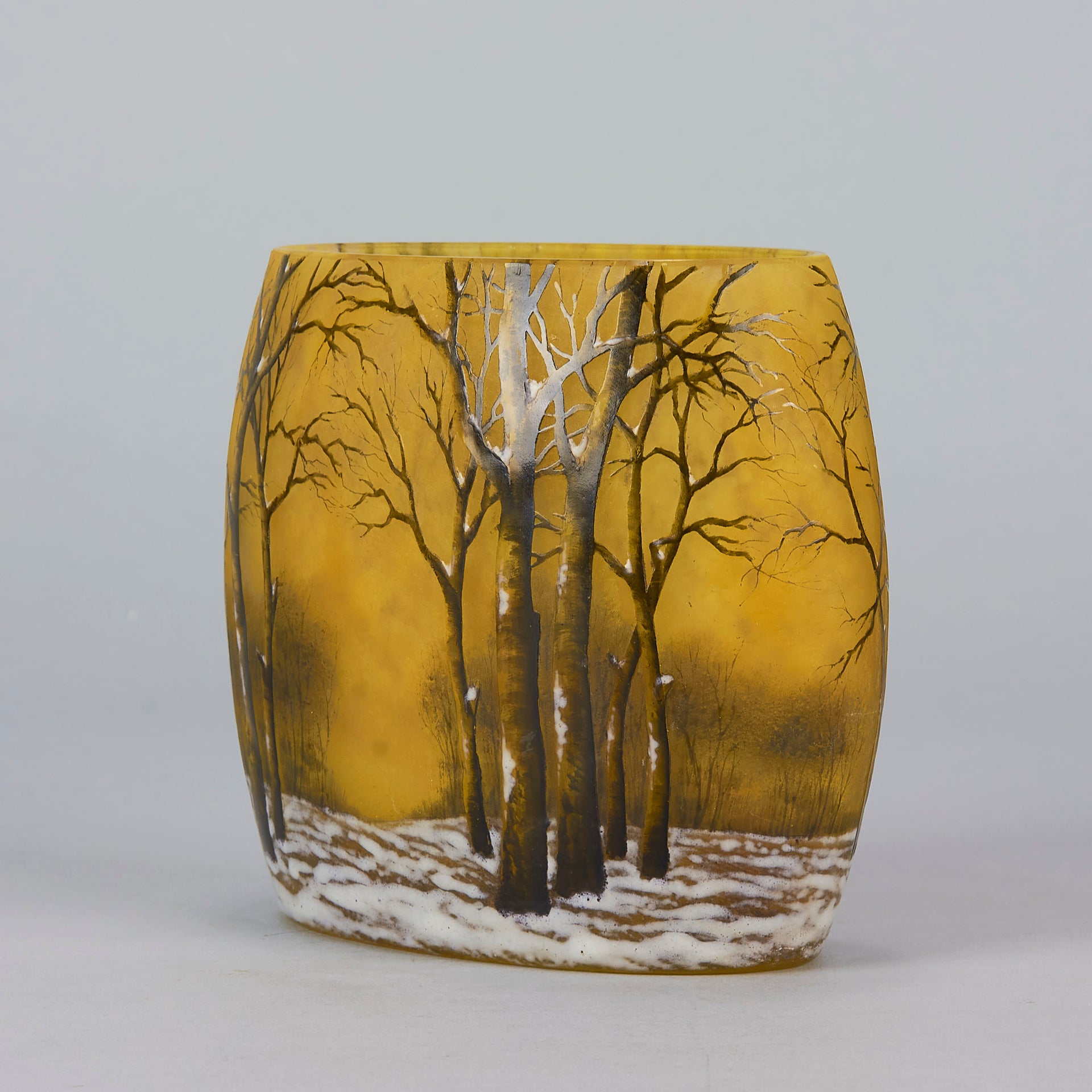 Wonderful pillow shaped cameo glass vase etched and enamelled with trees in a winter woodland landscape with highlights of snow to the ground and the trees , the vase exhibiting beautiful orange and yellow colours adding depth and artistic realism, signed Daum Nancy and with the Cross of Lorraine to bottom of base