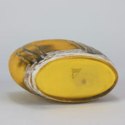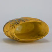 Daum’s unique technique common to all was that a clear vessel was blown with colour only on the inner surface or layer. An acid resist landscape was painted free-hand onto the vessel which was then etched by plunging into a hydrofluoric acid bath. The outer surface was then polished which gave the trees a ‘third dimension’ as the onlooker can see through the clear glass to the inner colour. Then the background was frosted, tricking the eye into thinking it is seeing coloured glass.