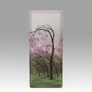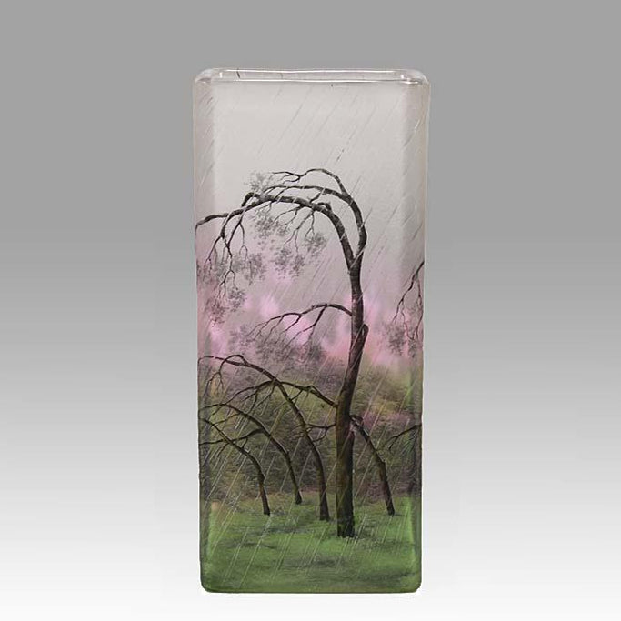 A stunning and very rare cameo glass vase etched and enamelled with a fabulous landscape of silver birch trees blown in the wind and the rain, exhibiting excellent colours of deep pink and greens and very fine surface detail, signed Daum Nancy and with Cross of Lorraine.