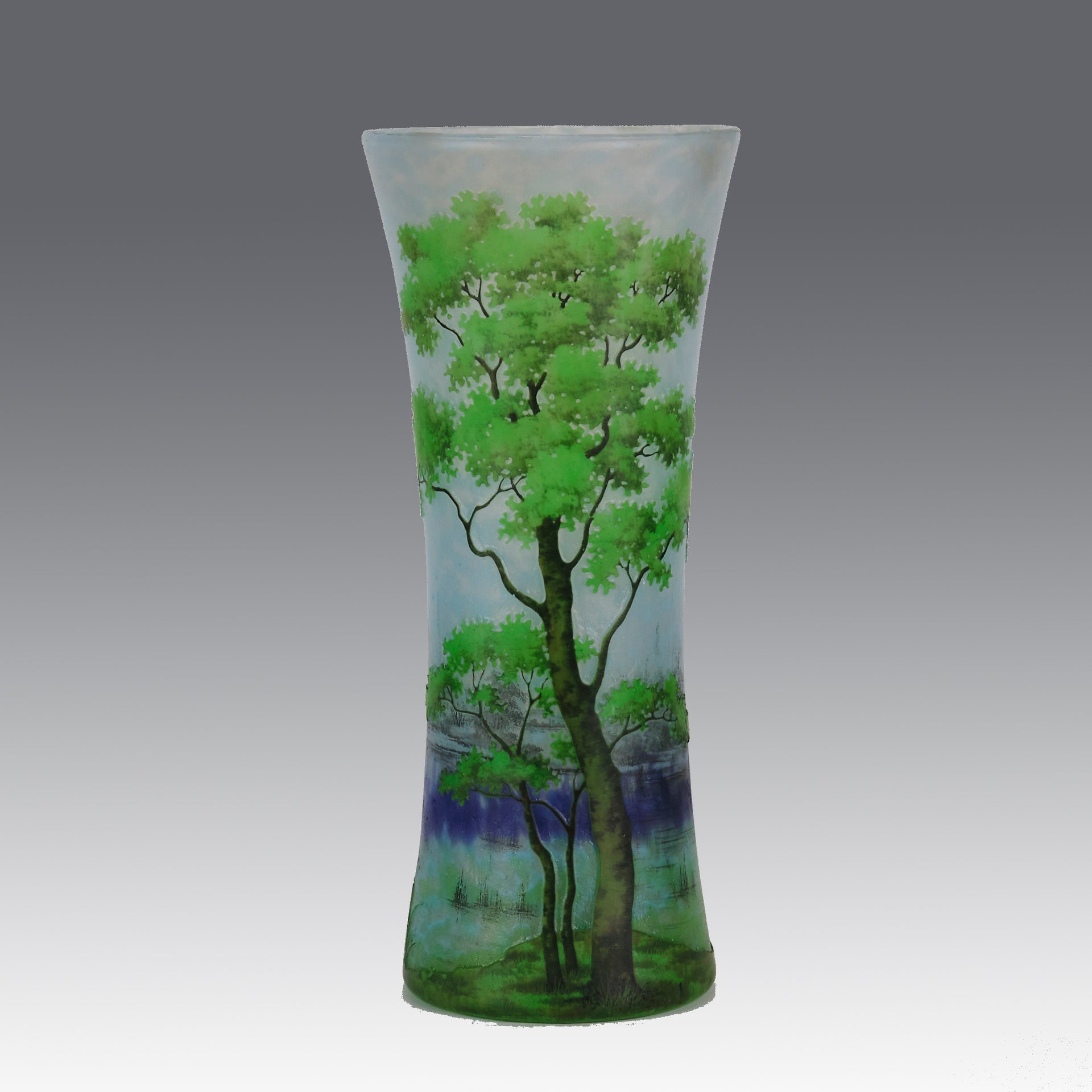 Daum’s unique technique common to all was that a clear vessel was blown with colour only on the inner surface or layer. An acid resist landscape was painted free-hand onto the vessel which was then etched by plunging into a hydrofluoric acid bath. The outer surface was then polished which gave the trees a ‘third dimension’ as the onlooker can see through the clear glass to the inner colour. Then the background was frosted, tricking the eye into thinking it is seeing coloured glass.