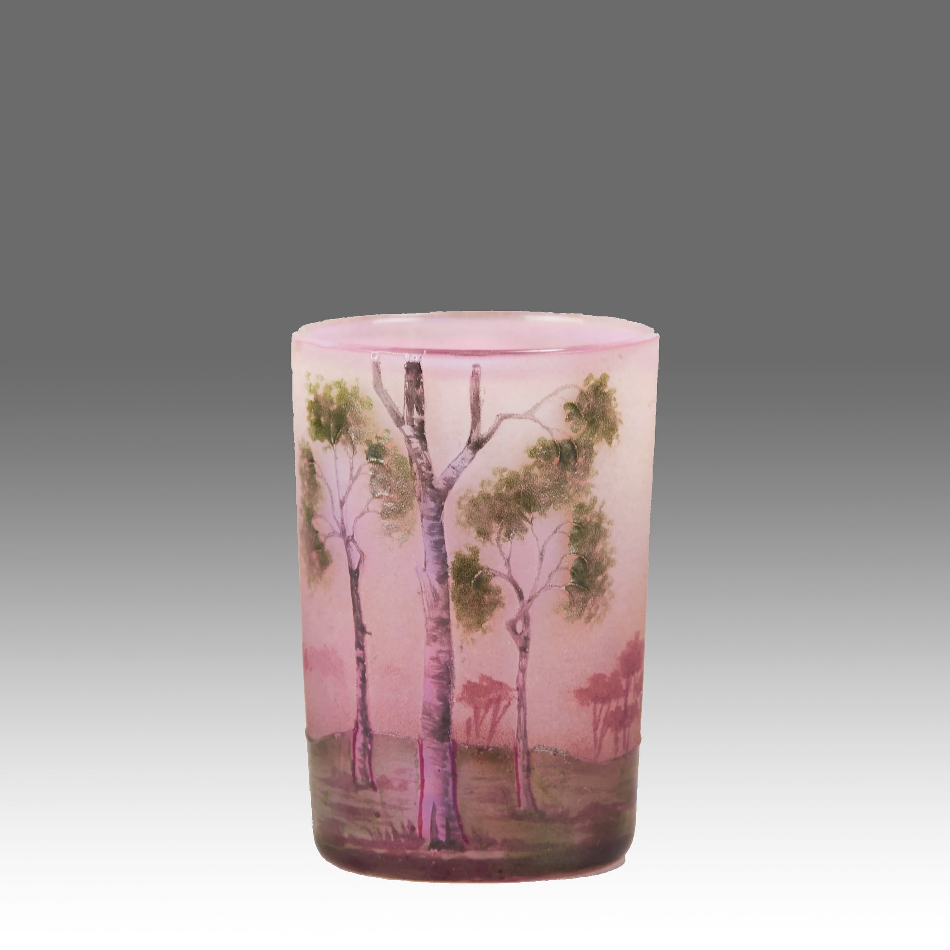 A beautiful miniature cameo glass vase etched and enamelled with silver birch trees against a rich pink landscape. Signed Daum Nancy and with the Cross of Lorraine