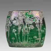 Daum’s unique technique common to all was that a clear vessel was blown with colour only on the inner surface or layer. An acid resist landscape was painted free-hand onto the vessel which was then etched by plunging into a hydrofluoric acid bath. The outer surface was then polished which gave the trees a ‘third dimension’ as the onlooker can see through the clear glass to the inner colour. Then the background was frosted, tricking the eye into thinking it is seeing coloured glass.