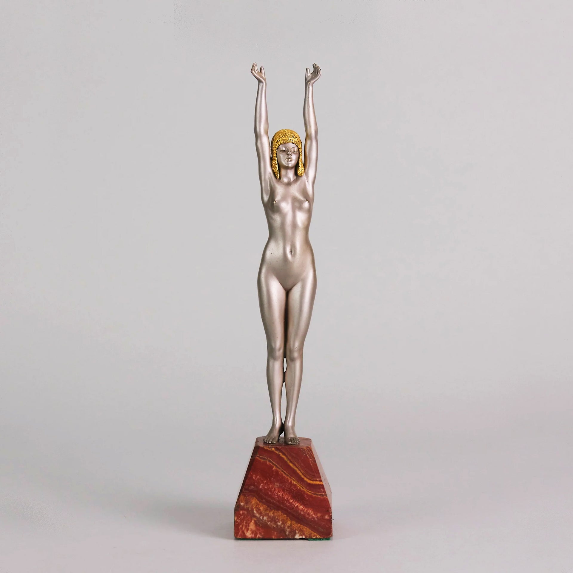 An exquisite early 20th Century Art Deco cold painted silver and gilt bronze sculpture of a naked beauty standing in a stretched pose with her hands raised above her head wearing nothing but an Egyptian gilded headdress with very fine colour and intricate detail, raised on a rouge griotte marble base and signed D H Chiparus