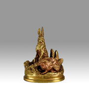 A wonderful late 19th Century Animalier bronze group of two hares, one seated in an alert stance the other feeding with excellent hand chased surface detail and fine colour, signed Dubucand