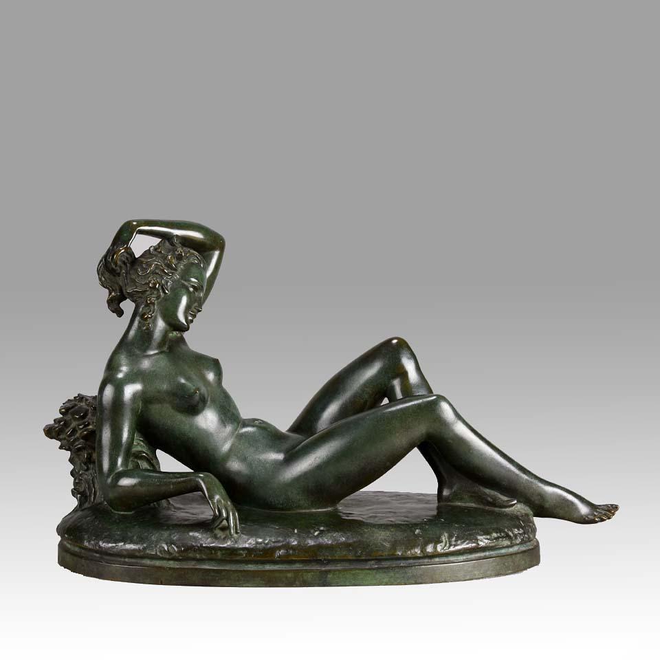 A wonderful Art Deco early 20th Century bronze study of a very beautiful reclining lady in a relaxed position, exhibiting excellent detail and very fine rich green colour, signed Montag