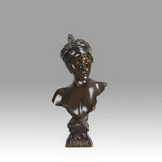 Delightful late 19th Century French Art Nouveau bronze bust entitled ‘Javotte’ by Emmanuel Villanis, the bronze with variegated brown patination and intricate hand finished surface detail raised on integral base with raised title, signed E Villanis.