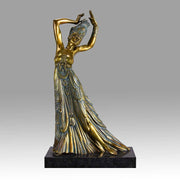 Enchanting gilt and enamel bronze study of the seductive young dancer wearing a revealing full length gown and a flamboyant head dress with her arms lifted above her head, raised on a marble base, signed and numbered 20/300.