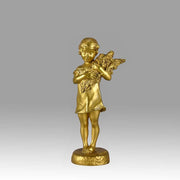 An endearing Art Nouveau early 20th Century gilt bronze figure of a young farm girl carrying a bundle of wheat sheaves, with very fine hand finished detail and good strong golden colour, signed S.Bizard