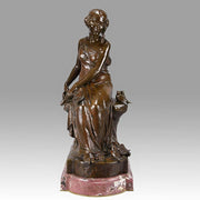 A fabulous Art Nouveau bronze figure of a young beauty sat upon a rock surrounded by birds whilst holding a lute with excellent colour and very fine hand chased surface detail, raised on a decorative marble base and signed M Bouval