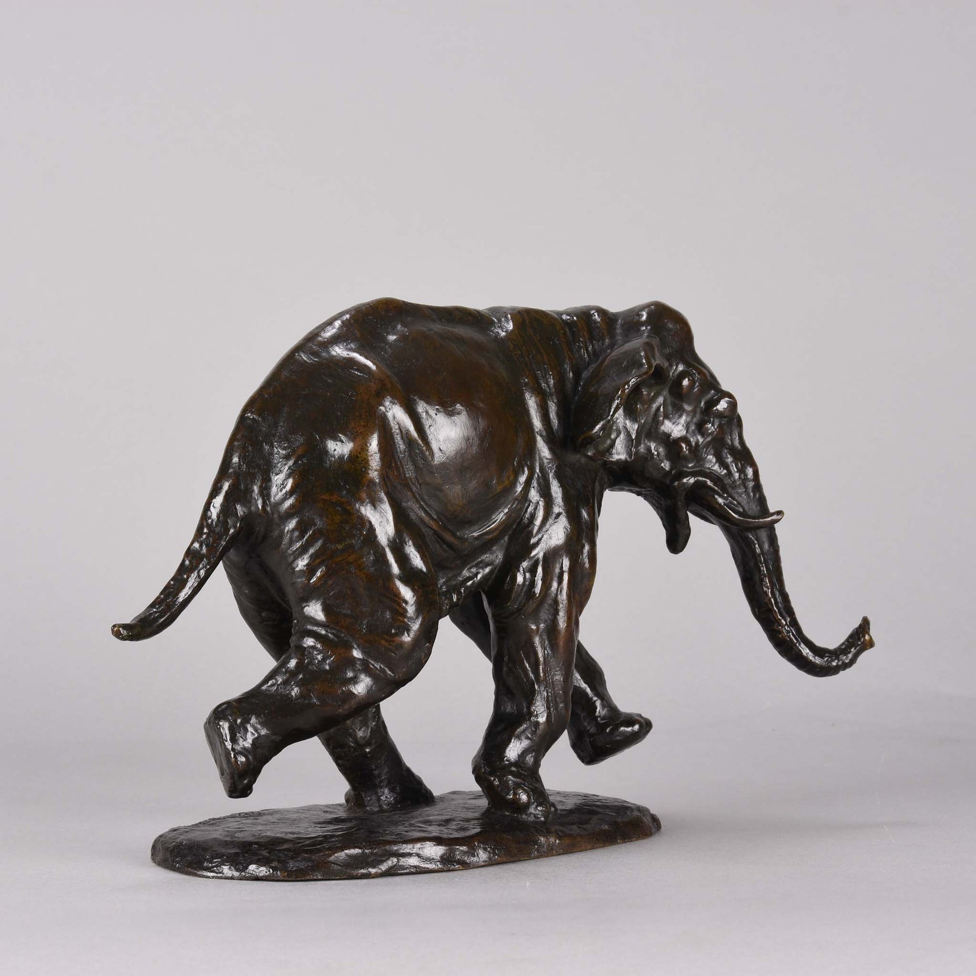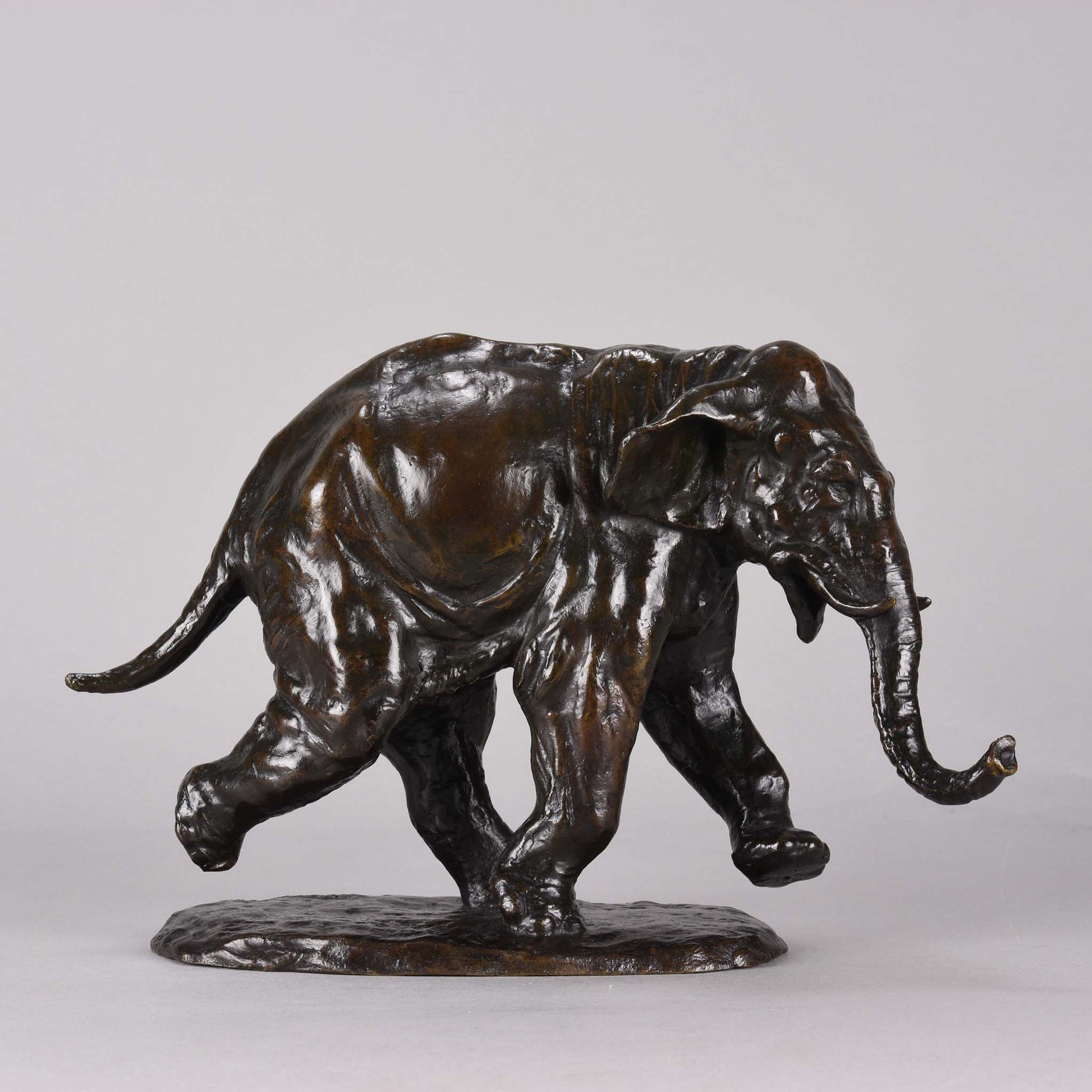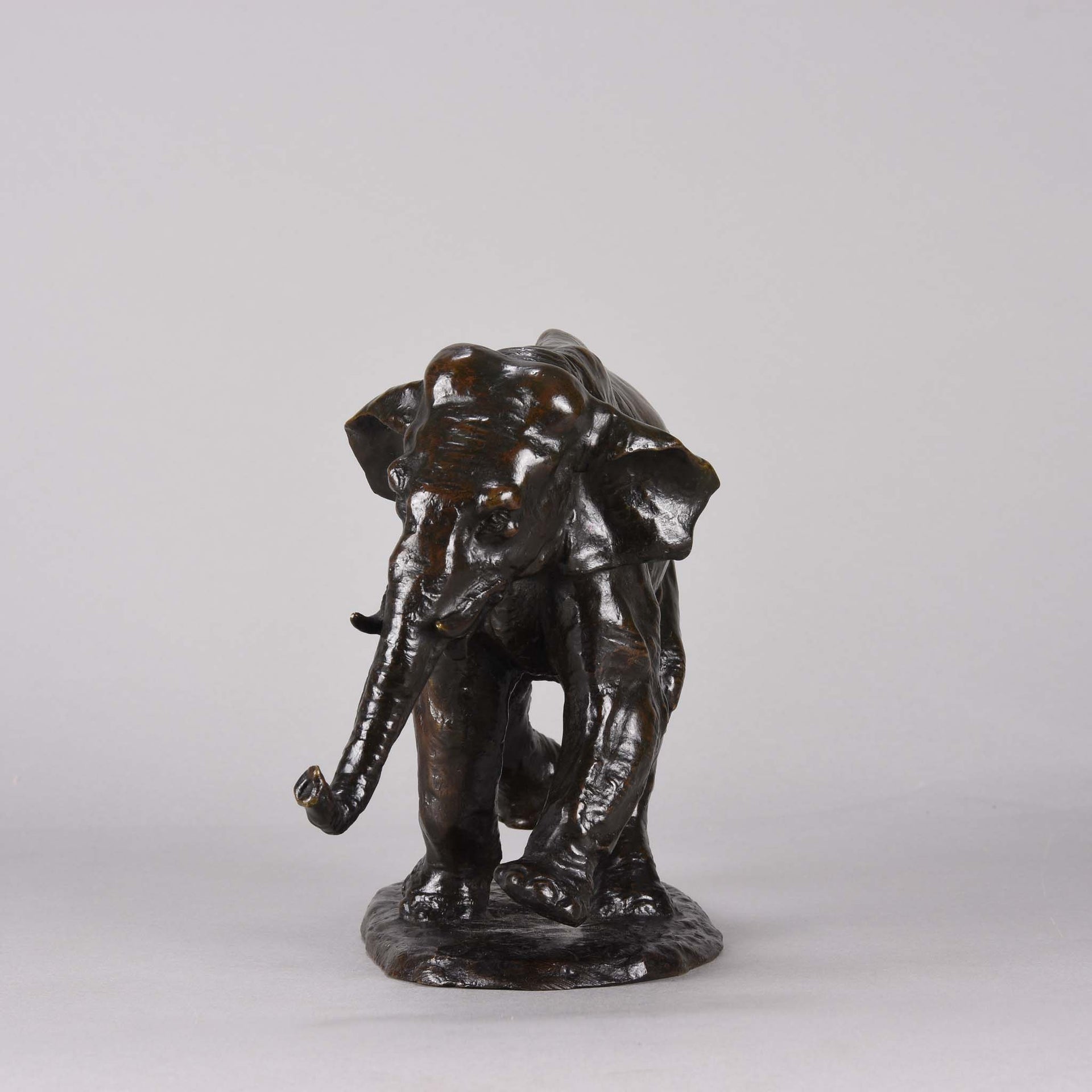 A impressive early 20th Century animalier bronze study of a powerful Indian elephant in confident pose. The surface of the bronze with excellent hand chased detail and very fine black, red and brown colours, signed P.E Fiaschi