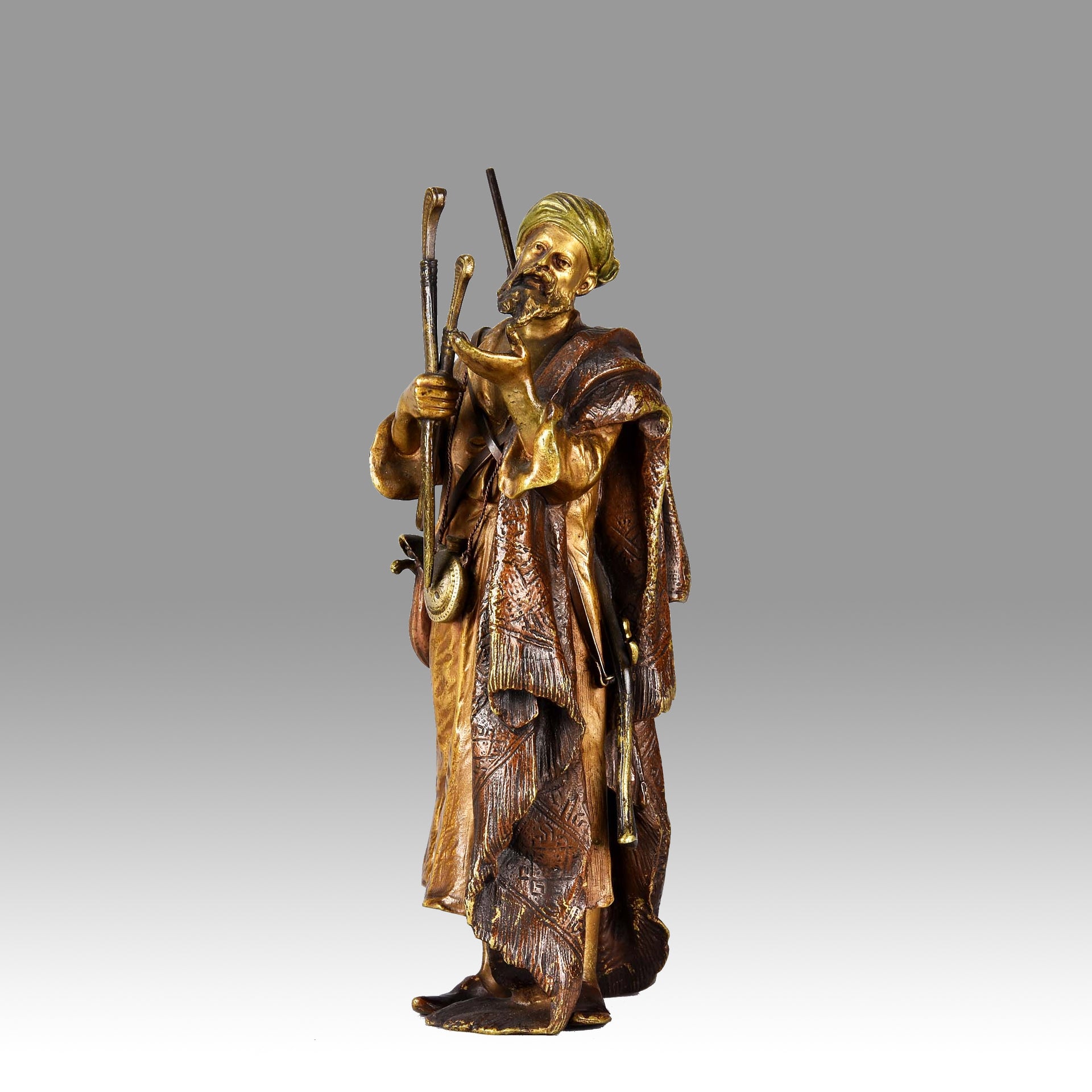 Excellent cold painted Austrian bronze figure of a standing Arab merchant displaying his wares. The surface with excellent colour and very fine hand finished detail, signed with the Bergman‘B’ in an amphora vase stamped Gesch and numbered 6182.