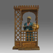 An excellent early 20th Century cold painted Austrian bronze study of an Arab tradesman selling his wares from a window exhibiting fabulous colours and good hand chased surface detail. Signed with the Bergman ‘B’ in an amphora vase, stamped Geschutzt and numbered