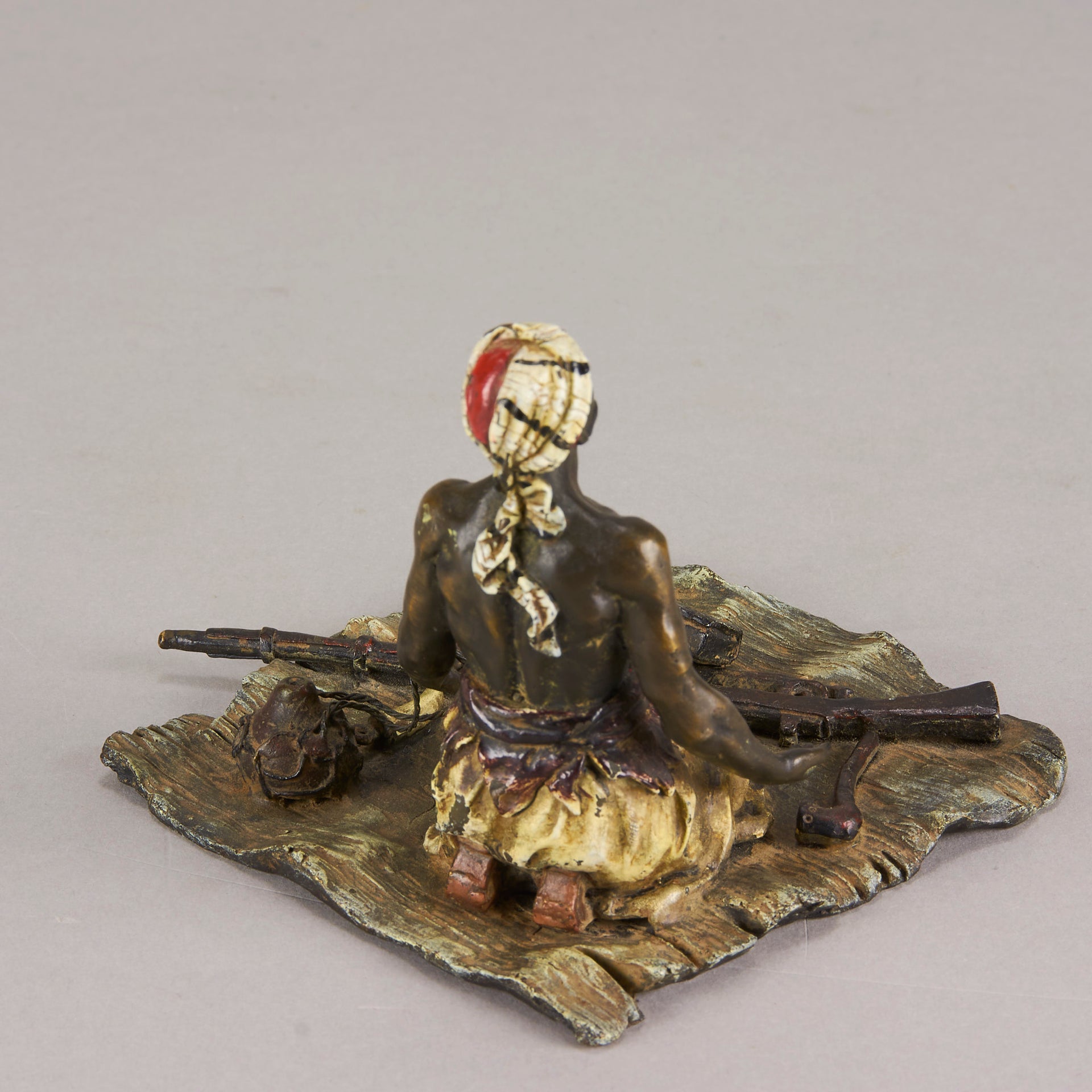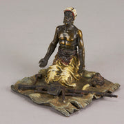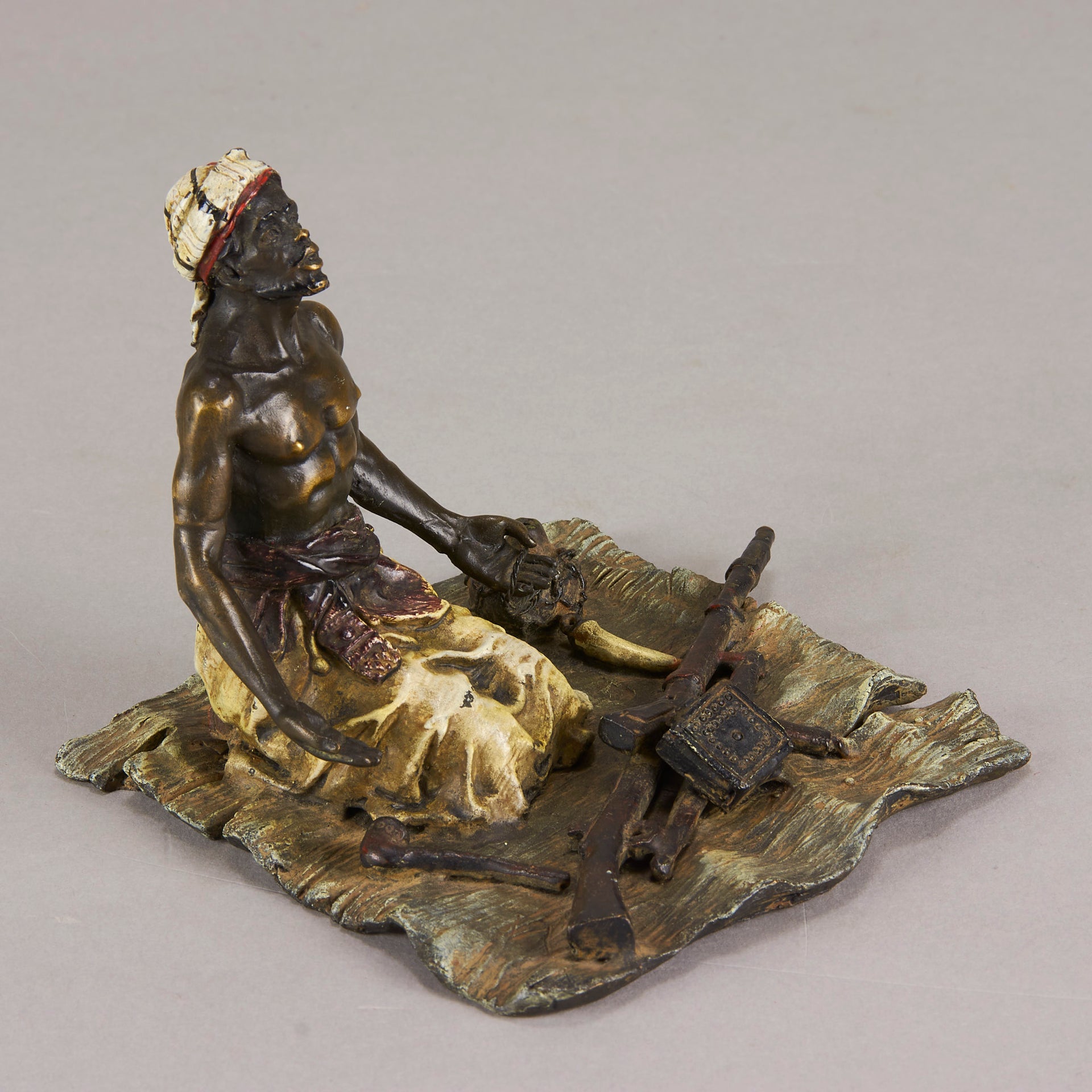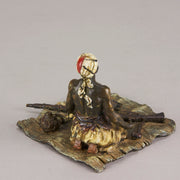 Fine cold painted Austrian bronze modelled as trader kneeling on a carpet displaying his wares, with good detail and colour, stamped with the Bergman‘B’ in a vase signature