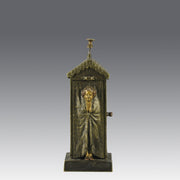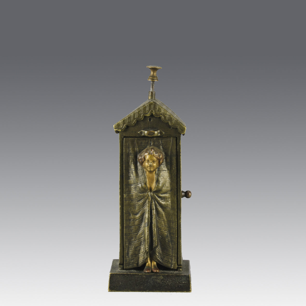 An amusingly erotic early 20th Century Austrian bronze figure of a young beauty in a seaside hut peeking out between the curtains. The mechanism pushes down to turn the front curtain around revealing 'what the butler saw' as her naked body is revealed from behind. The bronze cold painted with naturalistic colours, especially the gilding on the body of the girl that serves to emphasise the soft texture of her skin. Signed with both a 'B' in a vase and 'Nam Greb'.