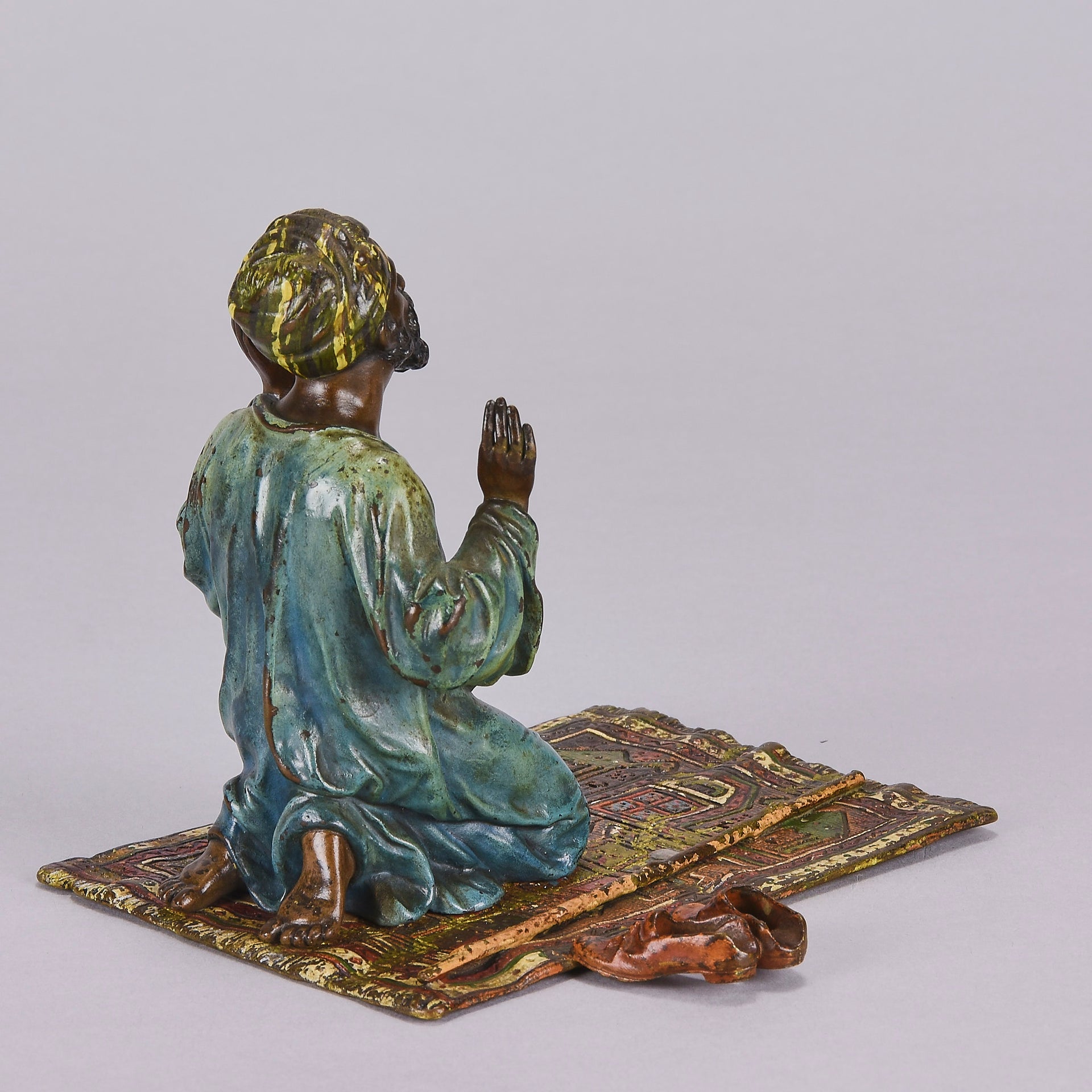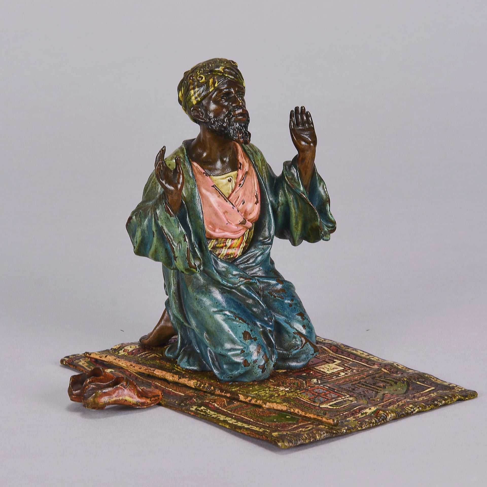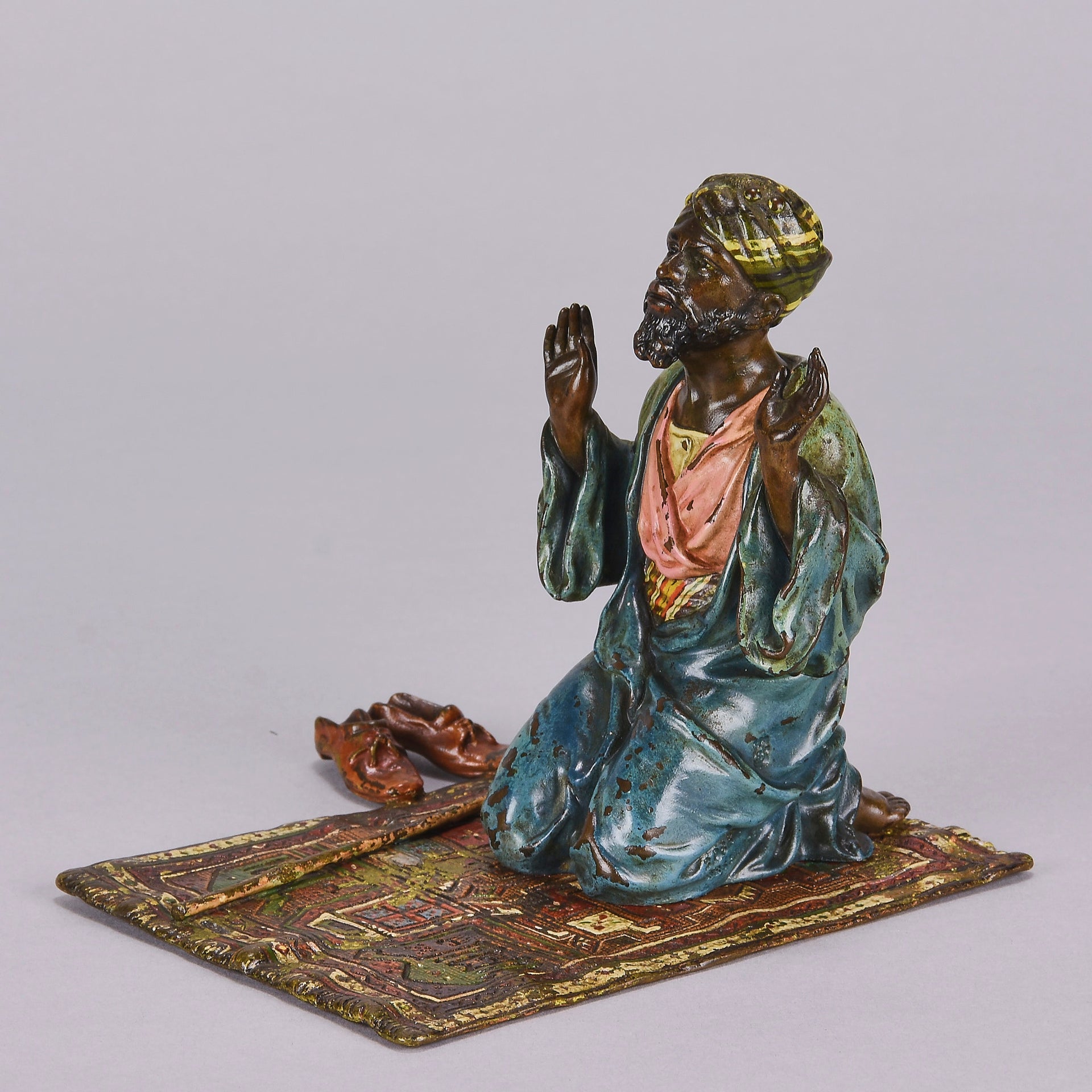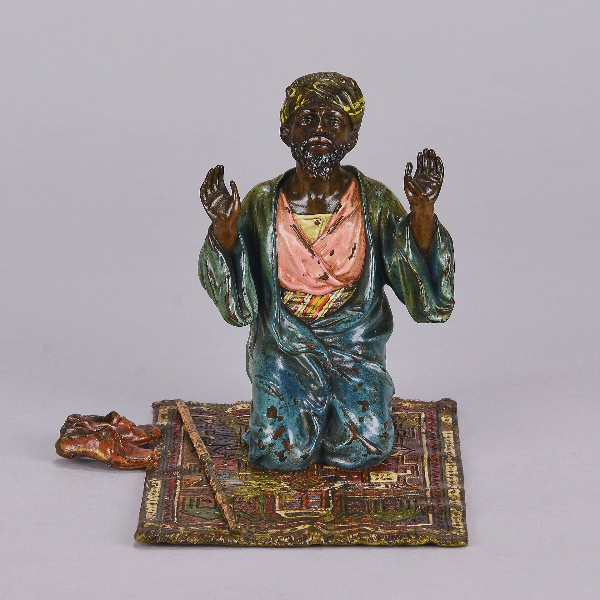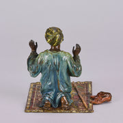 Excellent early 20th Century Vienna bronze study of a man at prayer kneeling on his prayer mat with both hands uplifted, his shoes and walking stick to his side. The surface of the bronze with rich cold painted colours lightly worn and with very fine hand finished detail. Signed with the Bergman 'B' in an amphora, numbered 2082 and stamped Geschutzt