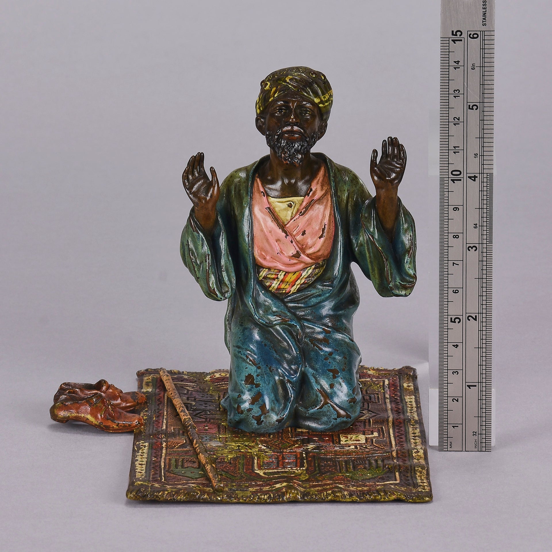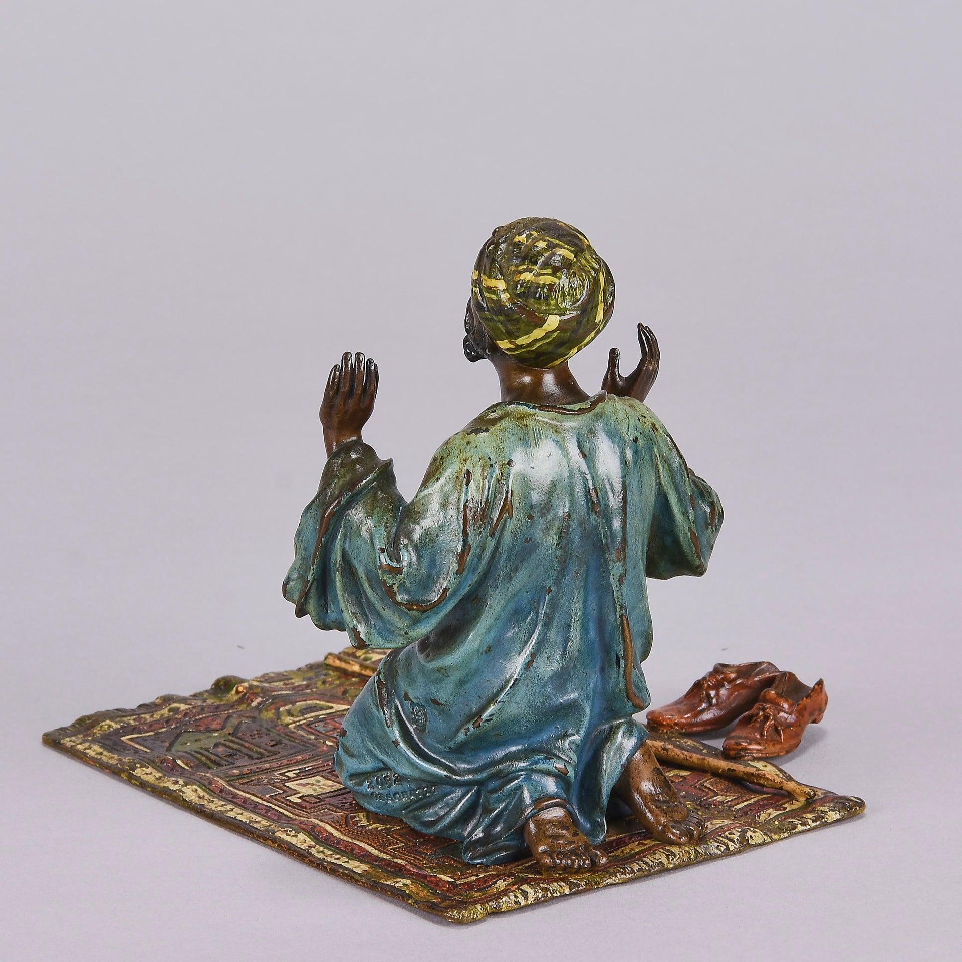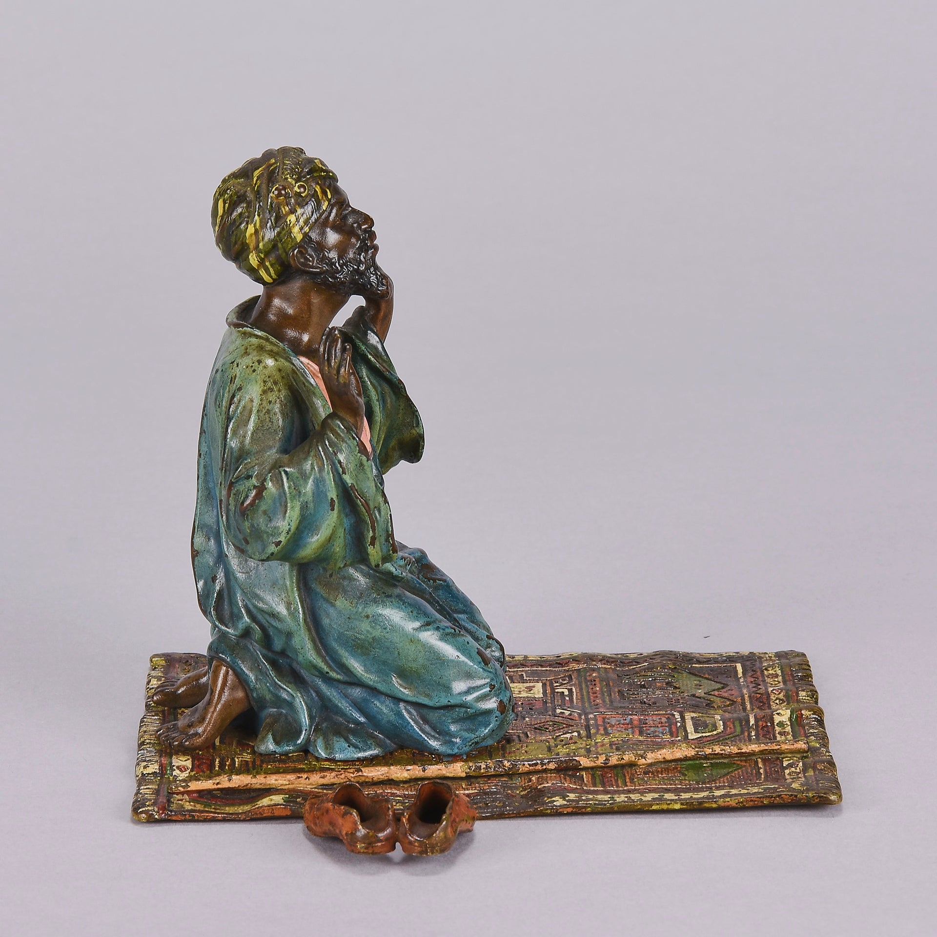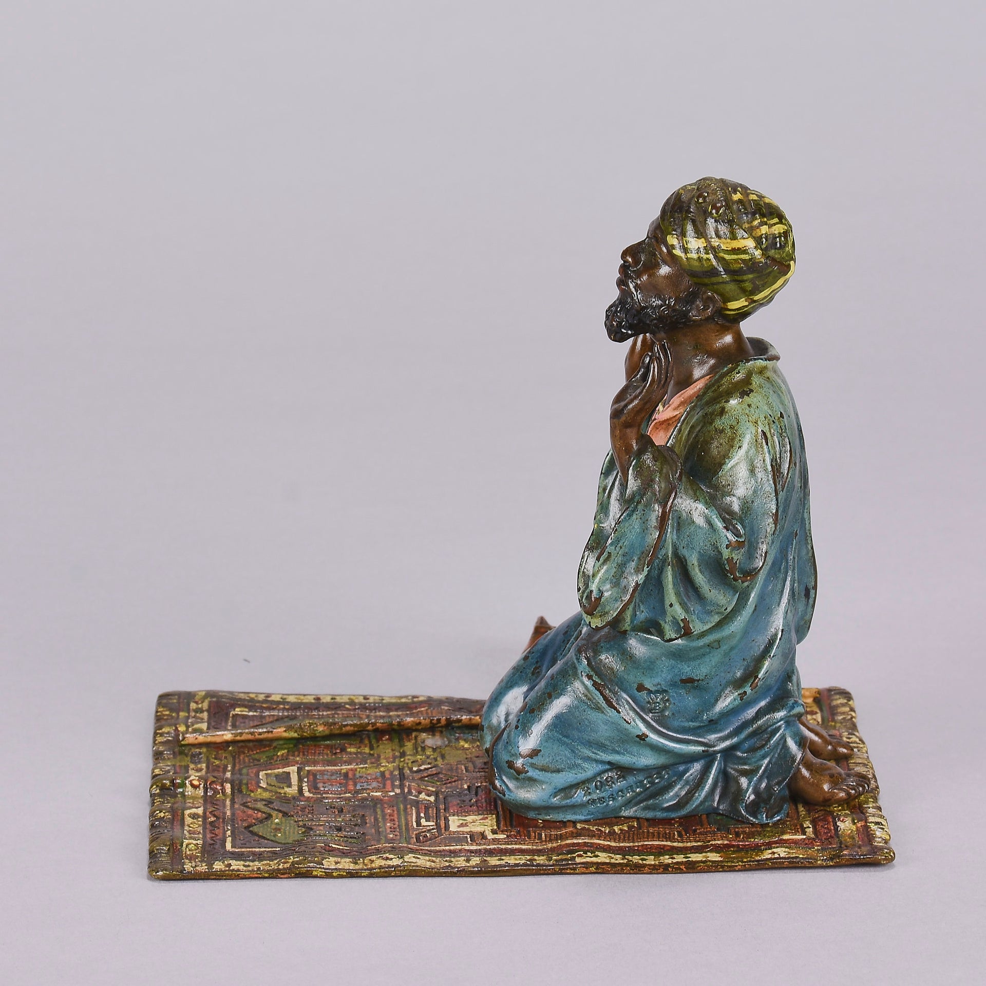 Excellent early 20th Century Vienna bronze study of a man at prayer kneeling on his prayer mat with both hands uplifted, his shoes and walking stick to his side. The surface of the bronze with rich cold painted colours lightly worn and with very fine hand finished detail. Signed with the Bergman 'B' in an amphora, numbered 2082 and stamped Geschutzt