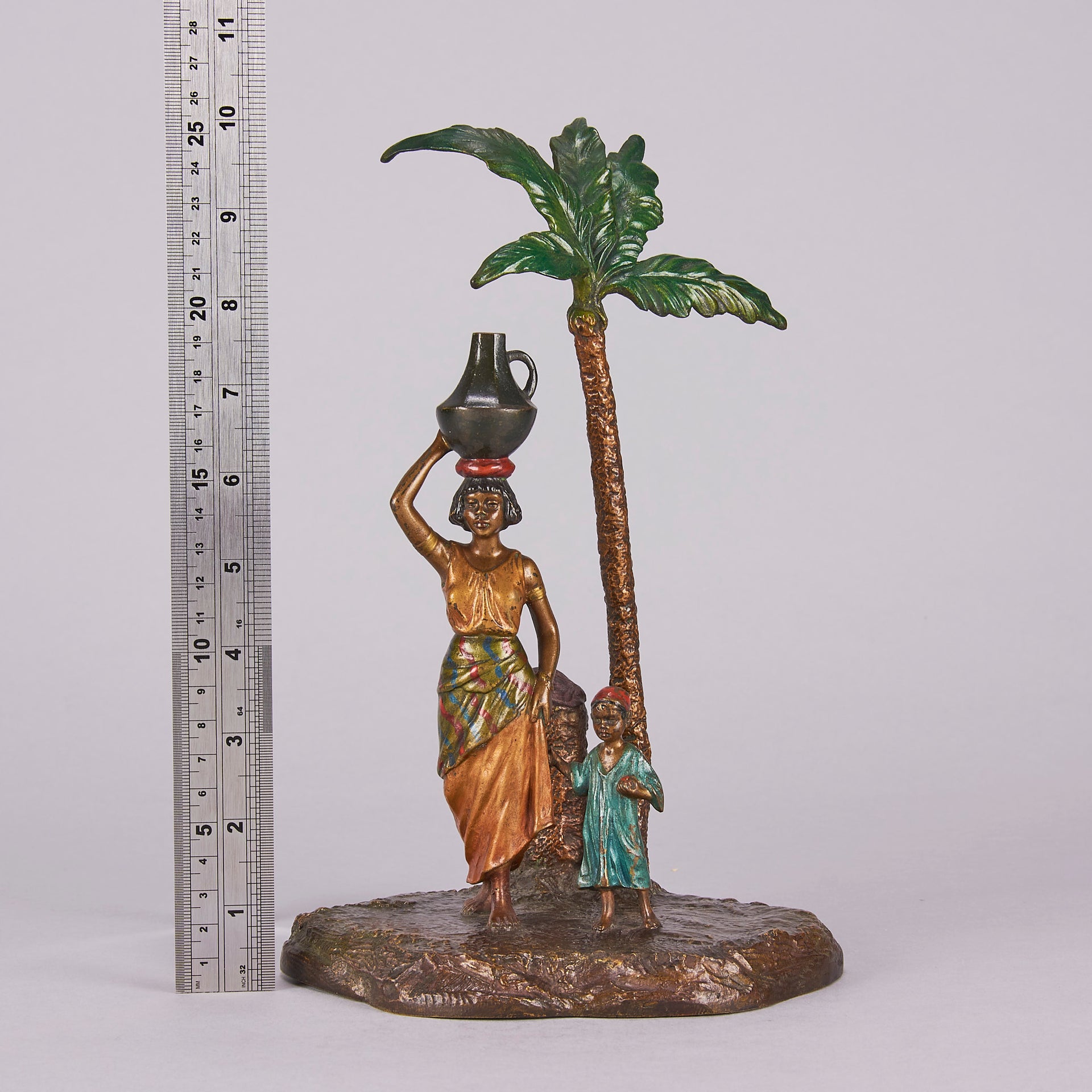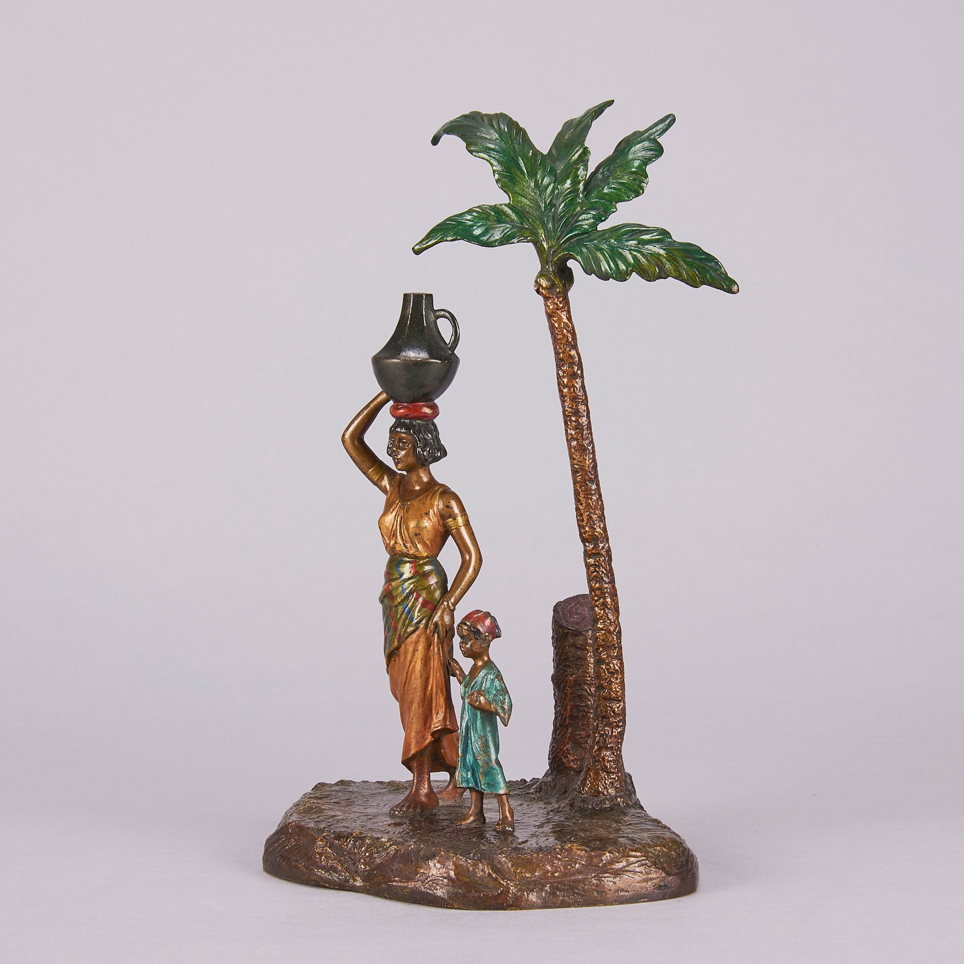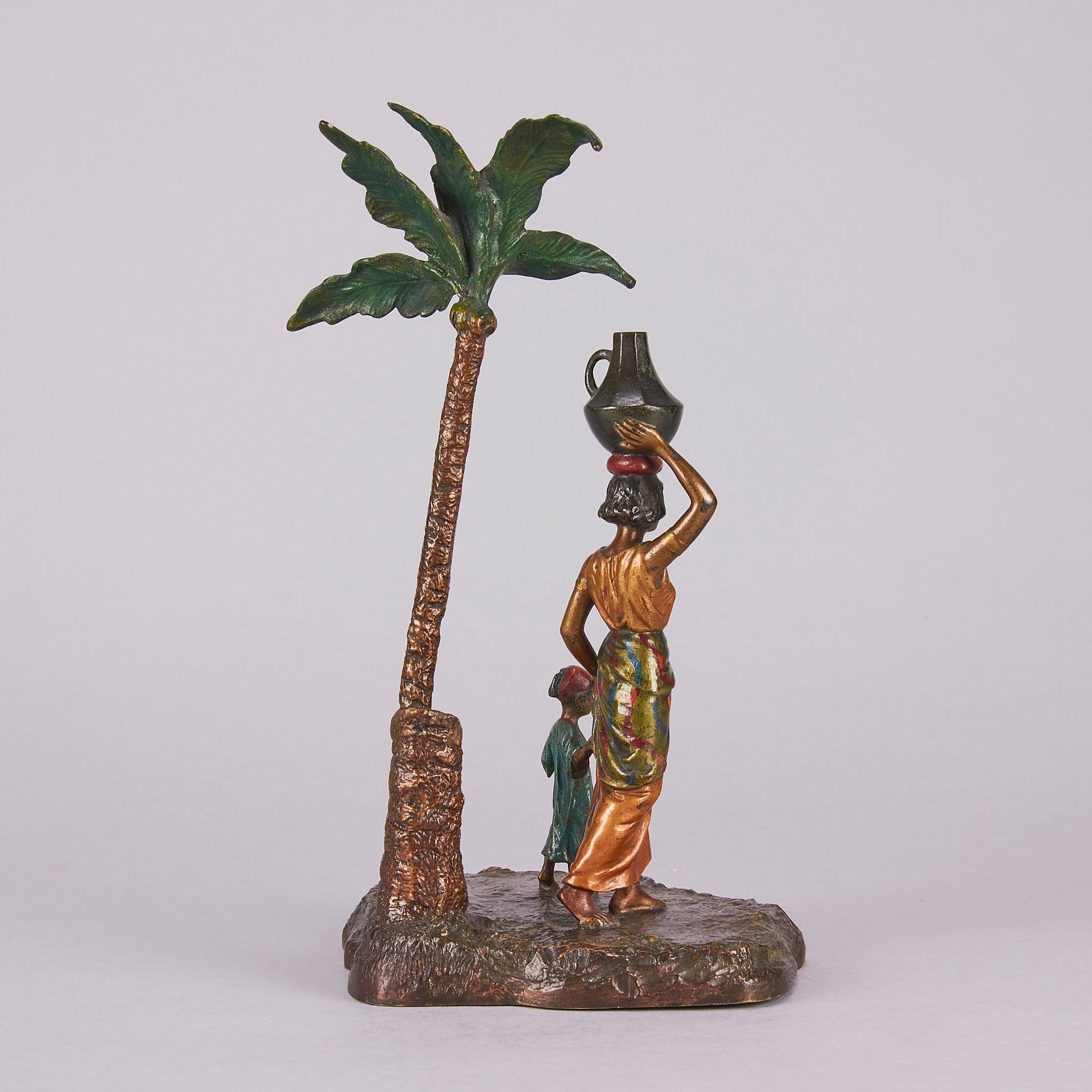 Very fine early 20th Century Austrian bronze study of a young mother carrying a water filled urn with her child by her side, walking beside a palm tree. The surface of the bronze with good cold painted colours and fine hand finished surface detail, signed with the Bergman 'B' in an amphora, stamped Geschutzt and numbered 6911